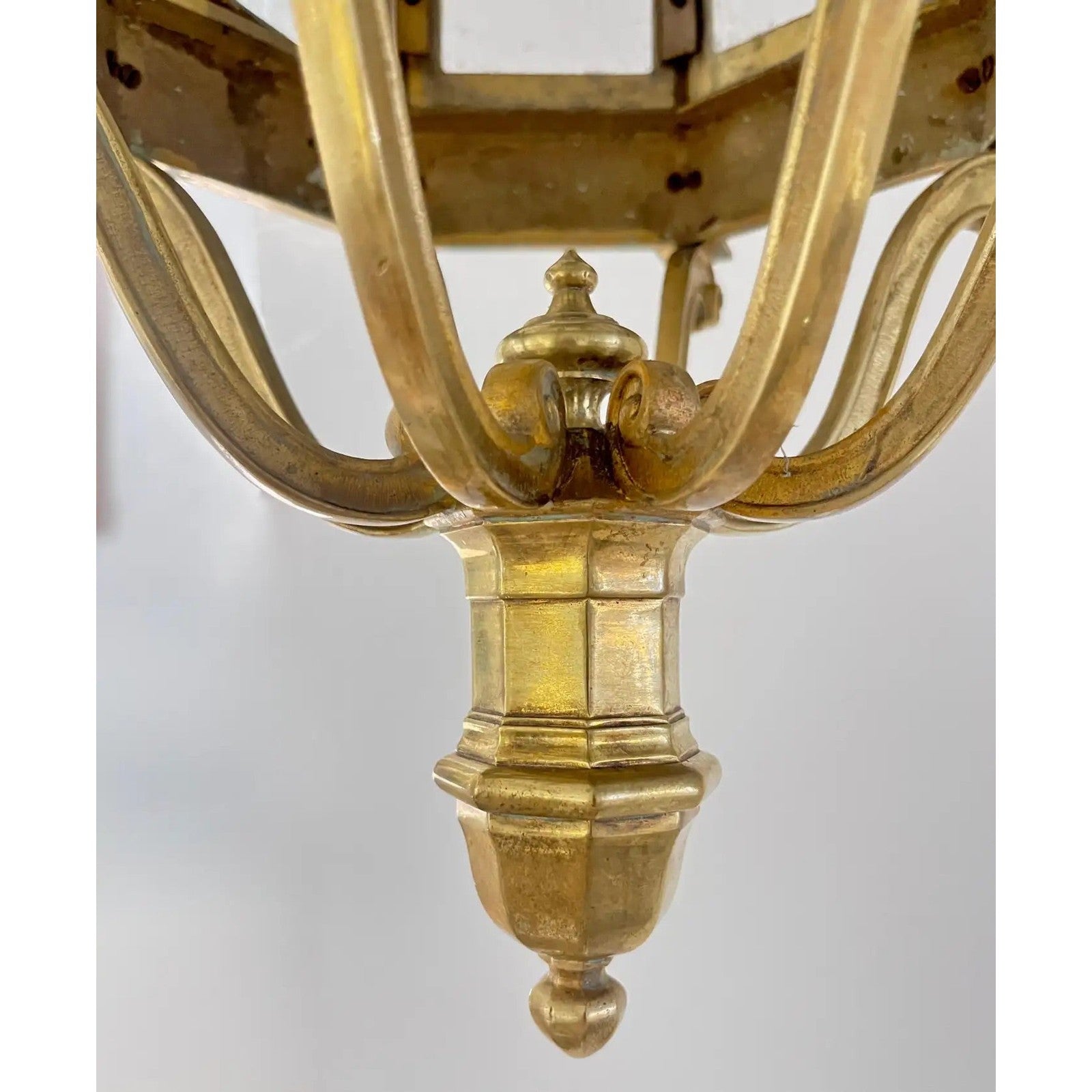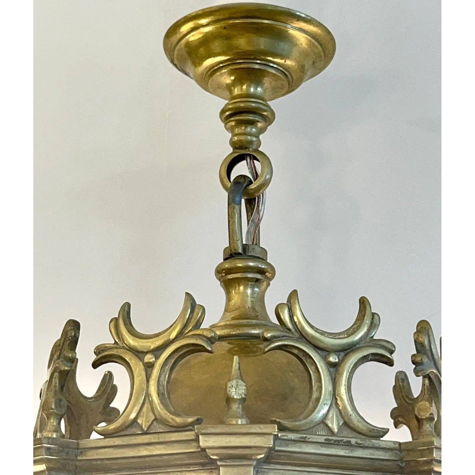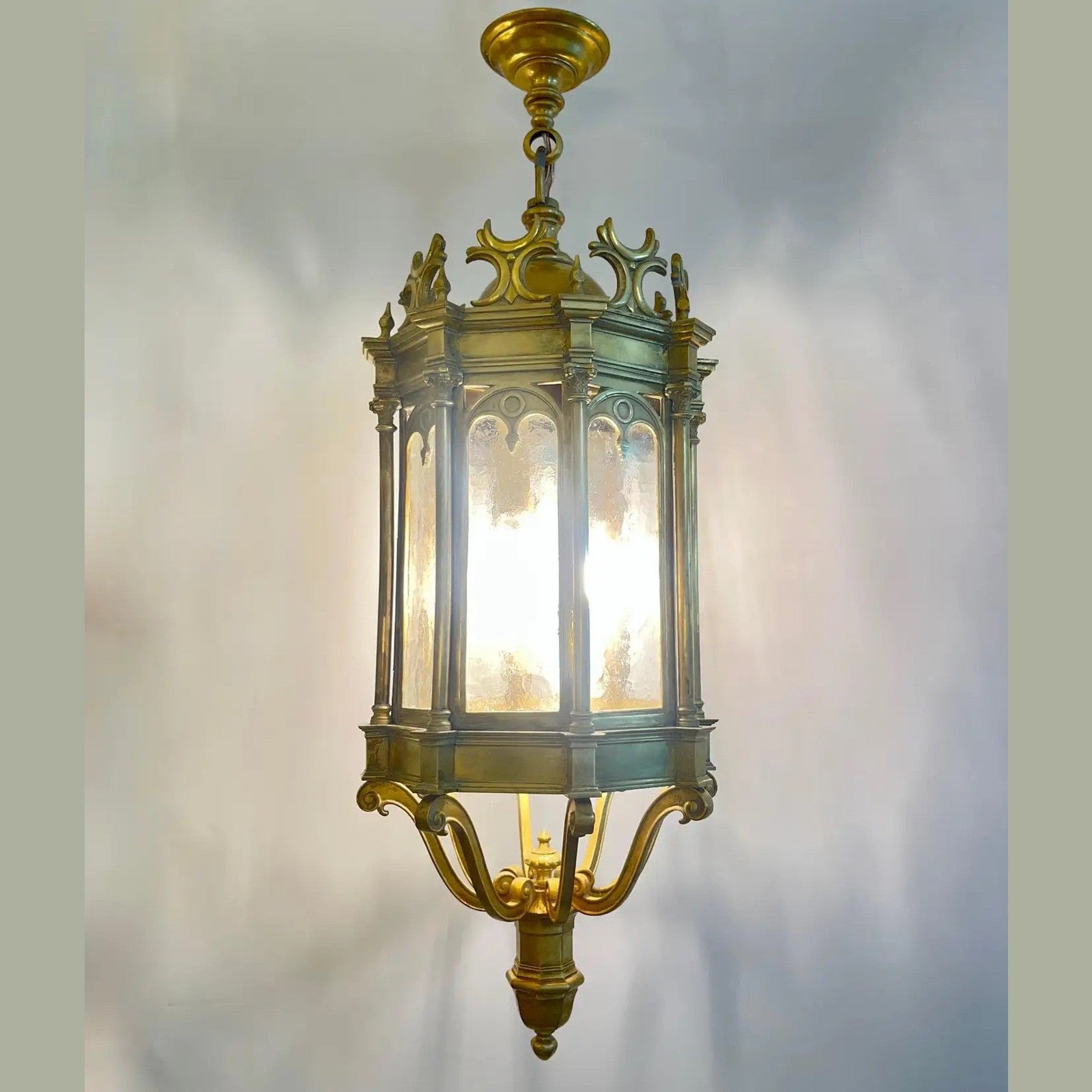 1860 French Antique Gothic Revival Cast Brass Pendant Lantern With Arch Windows