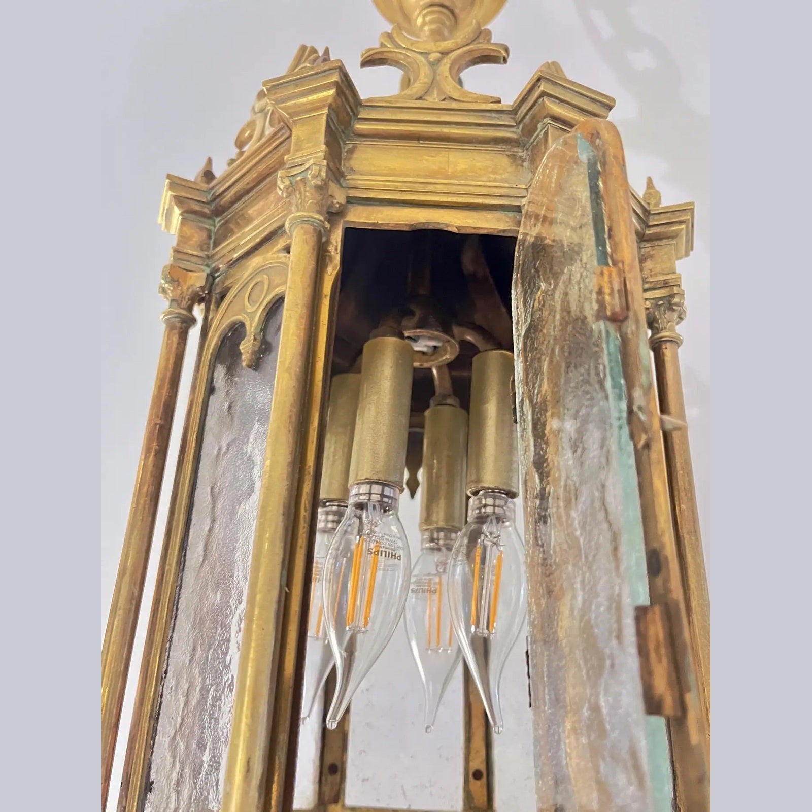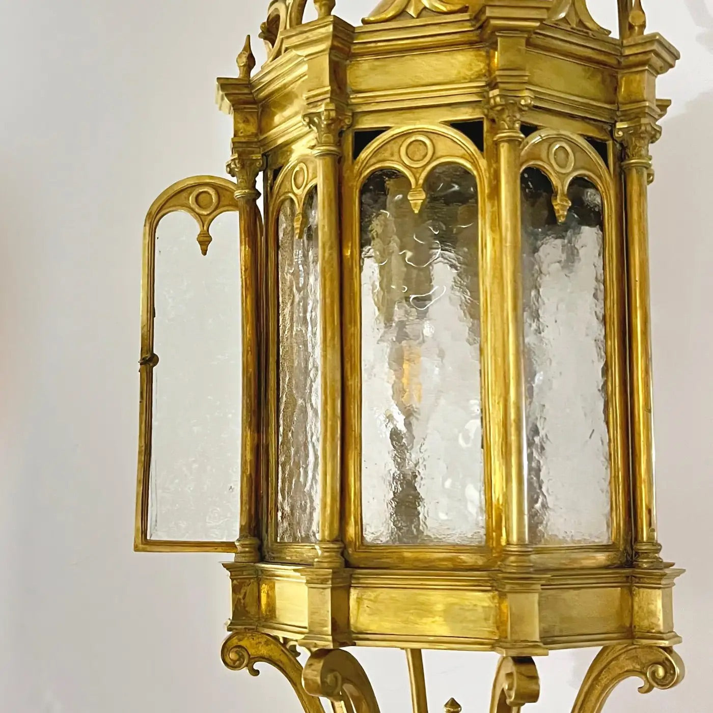 Superb quality, French Gothic Revival pendant lantern dating to around 1860, exquisitely handcrafted in heavy cast bronze. This rare piece showcases remarkable chasing and architectural detail, with eight arched panels of hand-hammered textured glass framed by slender columns and crowned with intricate Gothic tracery. The lantern features a small hinged door for access to the interior and retains its original open base as it originally was fitted for candles, later professionally electrified for modern use. The bottom adorned with romantic scrollwork. Provenanced from a private castle in the French Loire Valley.