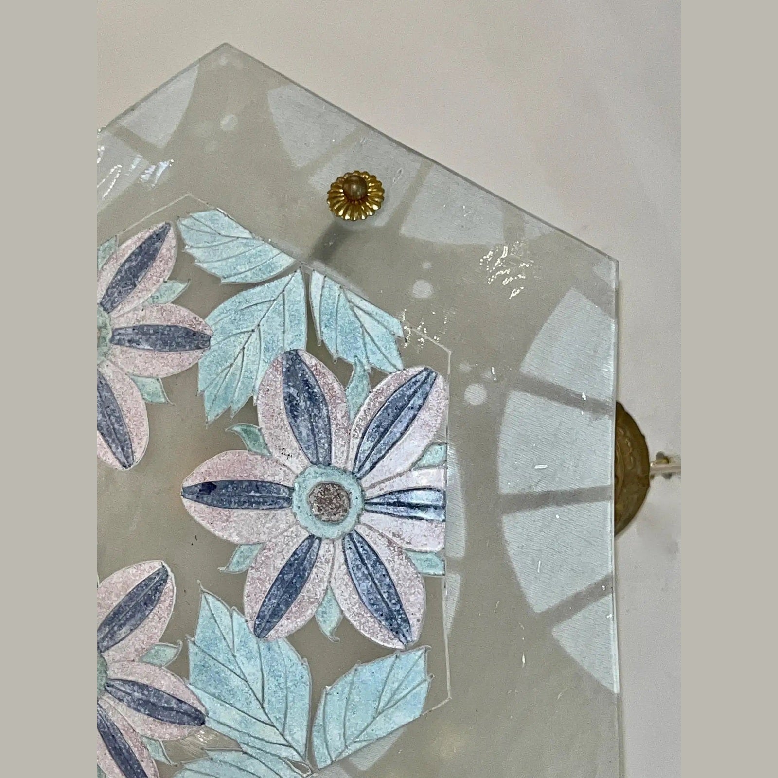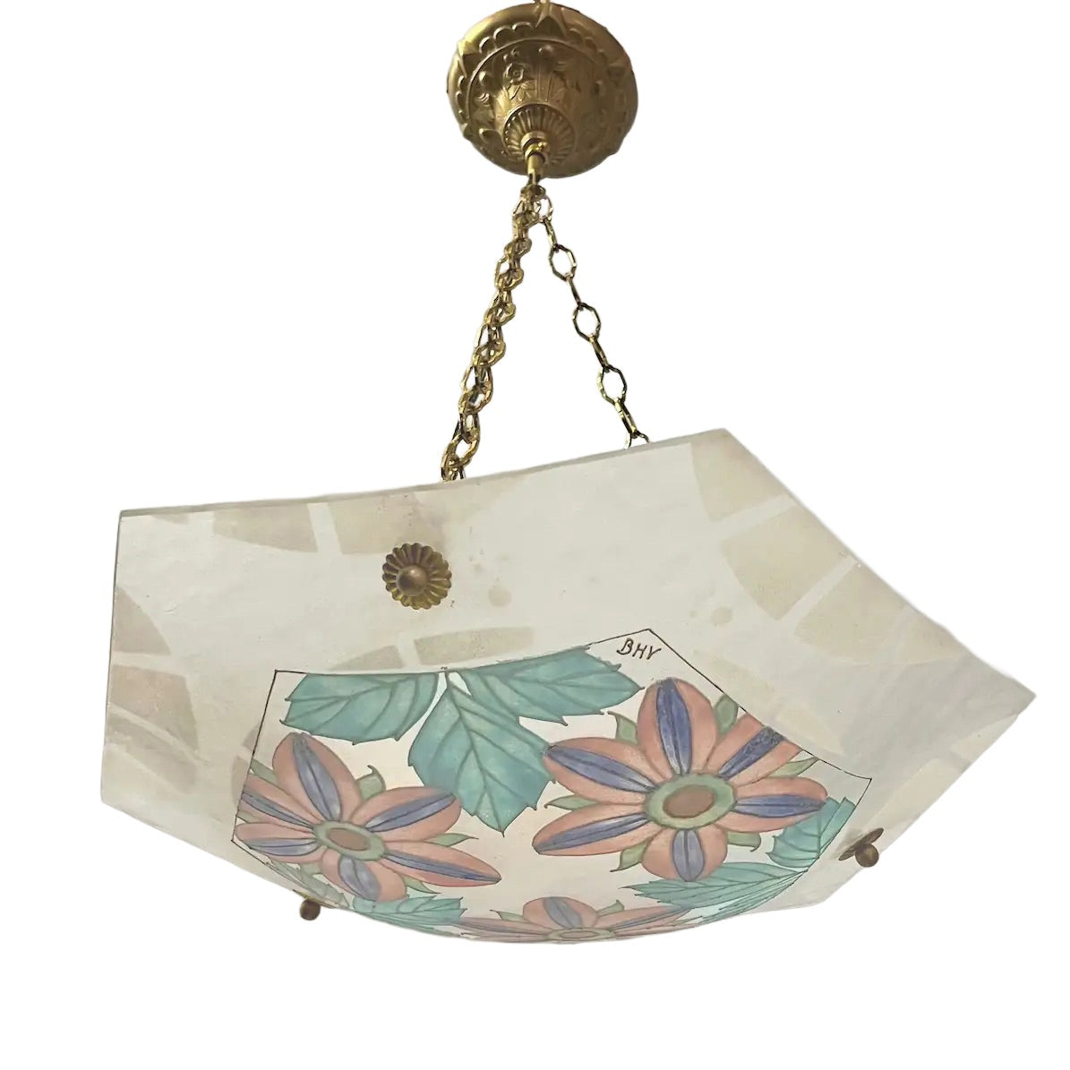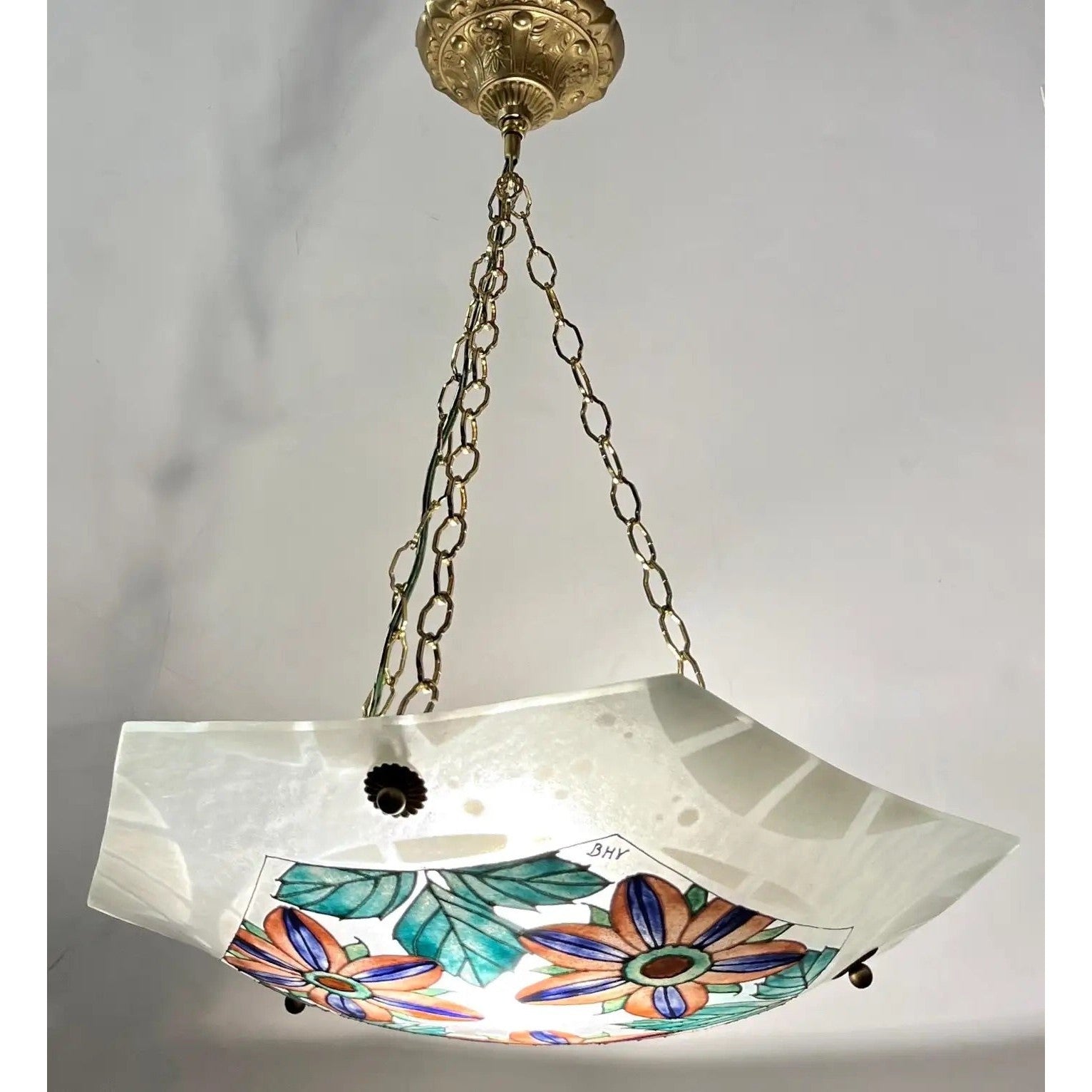 A charming early 20th-century decorative art hanging chandelier, in the manner of Loys Lucha, featuring a hand enameled floral motif on a frosted art glass plateau, with the outer edge decorated with a dotted geometric design, signed BHV. This vintage piece is suspended by an elegant brass chain with its original, richly ornate and detailed canopy and brass fittings that complement the organic nature of the painted design. The bowl-shaped glass is adorned with large stylized flowers in soft shades of light blue and pink, offset by leaves that intensify in colors when lit, marked with darker blue, vibrant green, and coral peach. This piece reflects a blend of Art Deco and folk-inspired aesthetics. Perfect for a hallway, bedroom, or intimate dining space, it diffuses a gentle ambient light and offers a unique alternative to traditional ceiling fixtures.