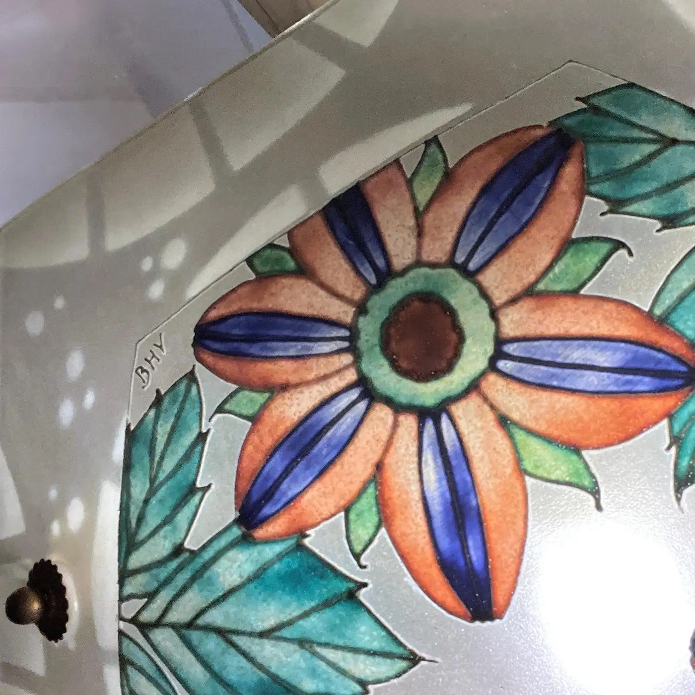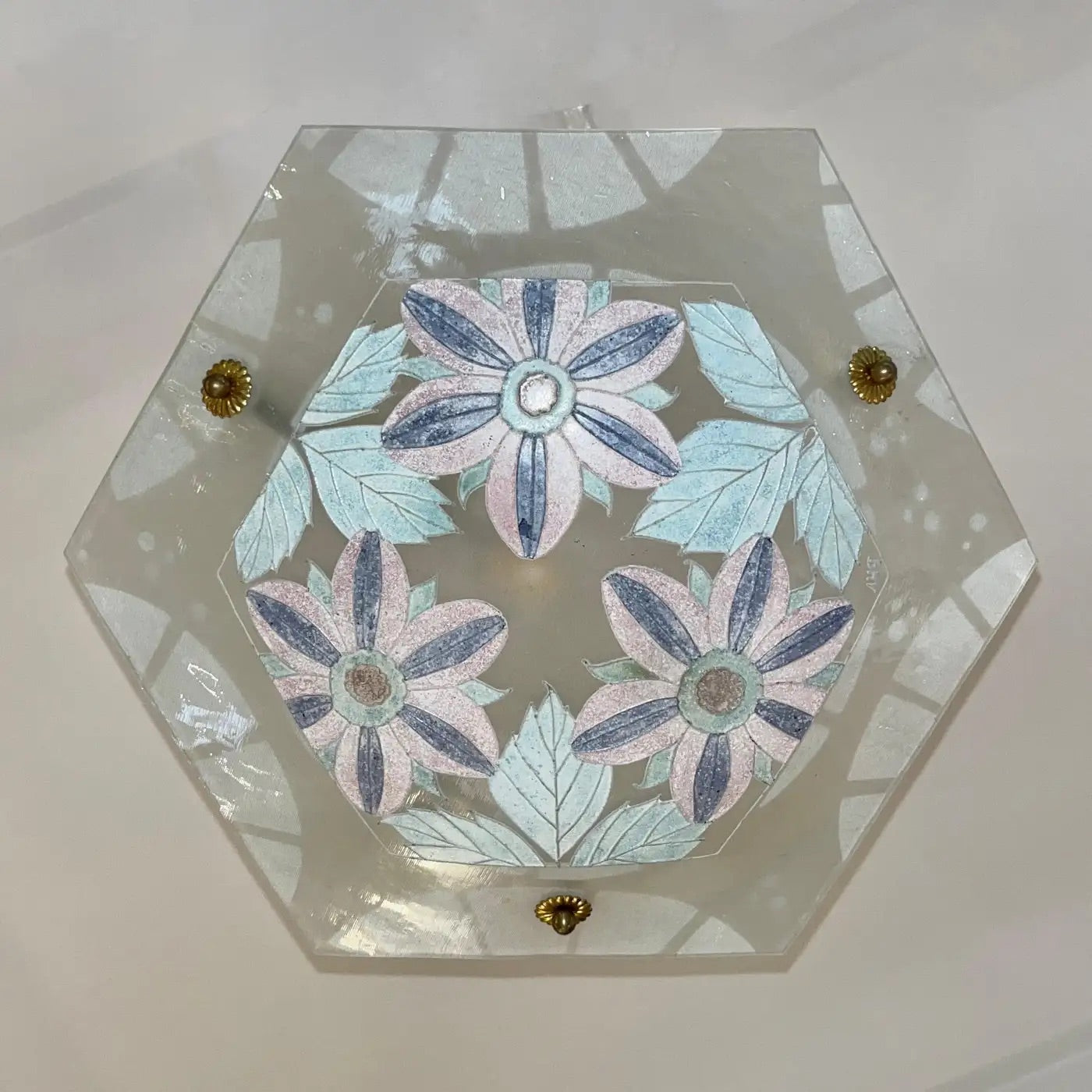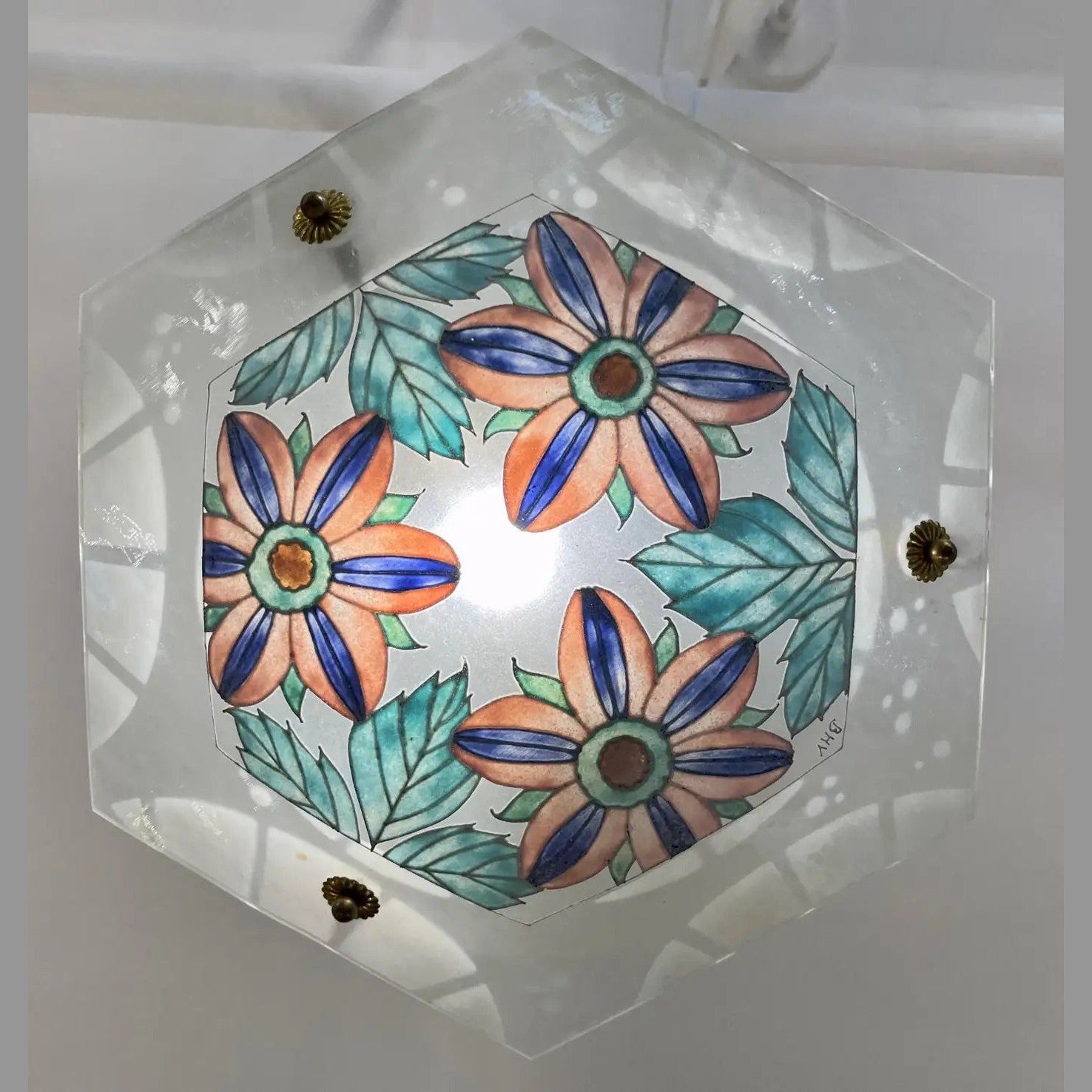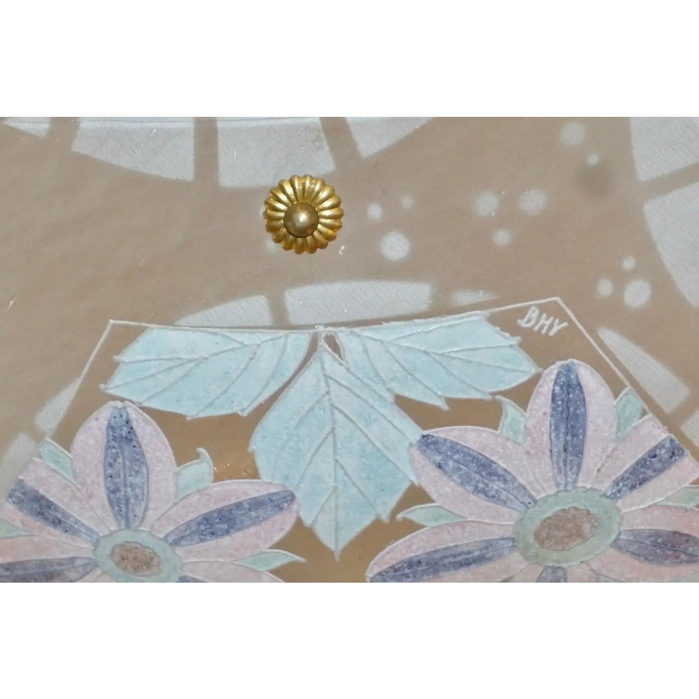 A charming early 20th-century decorative art hanging chandelier, in the manner of Loys Lucha, featuring a hand enameled floral motif on a frosted art glass plateau, with the outer edge decorated with a dotted geometric design, signed BHV. This vintage piece is suspended by an elegant brass chain with its original, richly ornate and detailed canopy and brass fittings that complement the organic nature of the painted design. The bowl-shaped glass is adorned with large stylized flowers in soft shades of light blue and pink, offset by leaves that intensify in colors when lit, marked with darker blue, vibrant green, and coral peach. This piece reflects a blend of Art Deco and folk-inspired aesthetics. Perfect for a hallway, bedroom, or intimate dining space, it diffuses a gentle ambient light and offers a unique alternative to traditional ceiling fixtures.