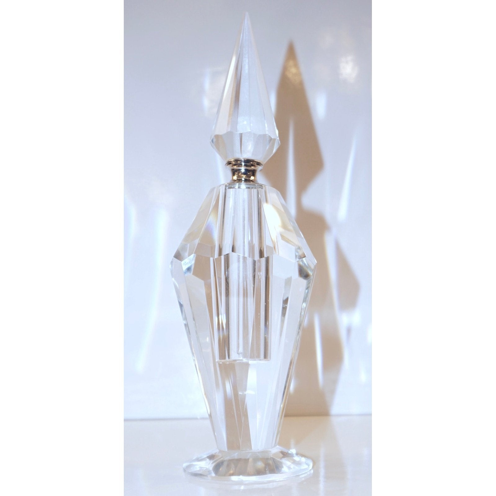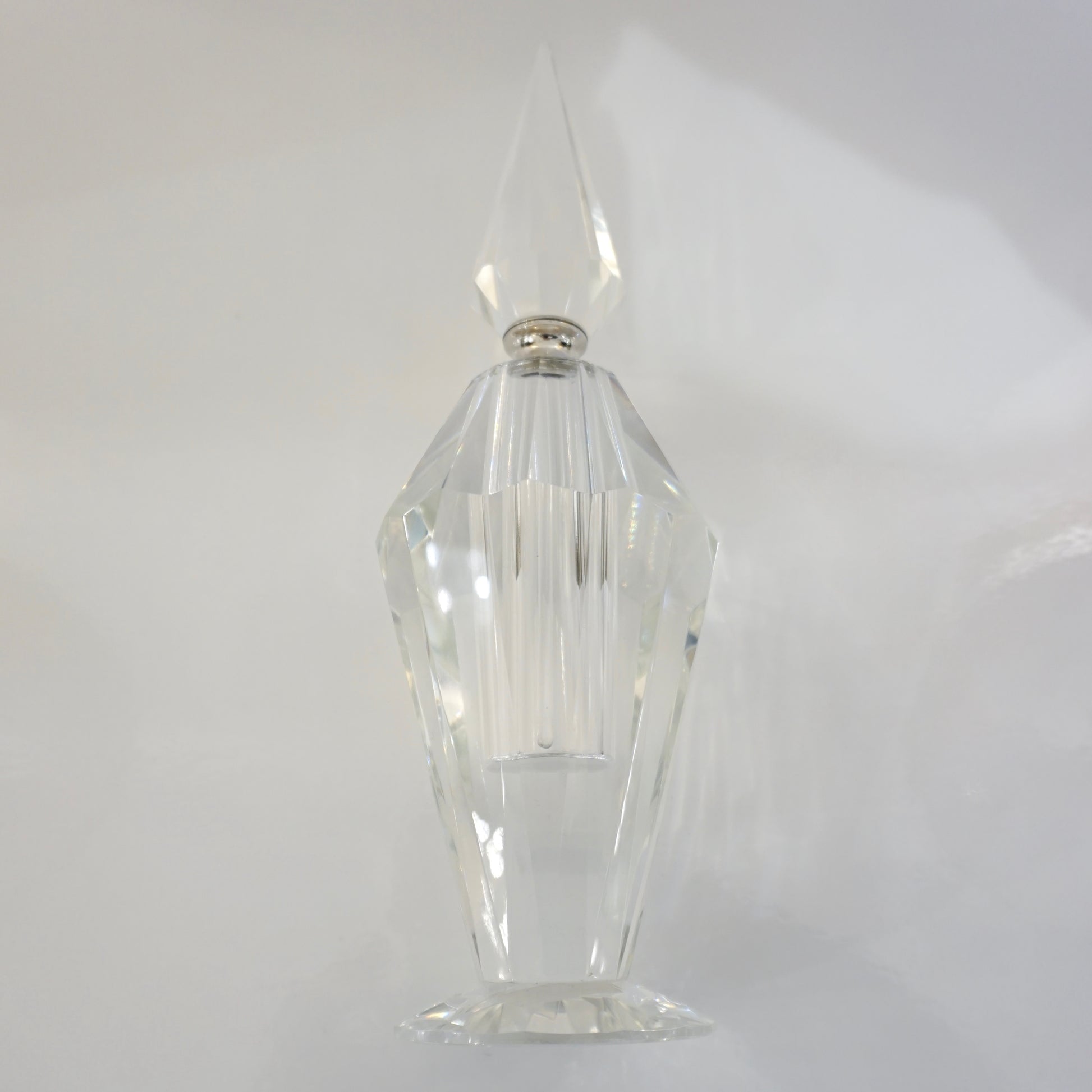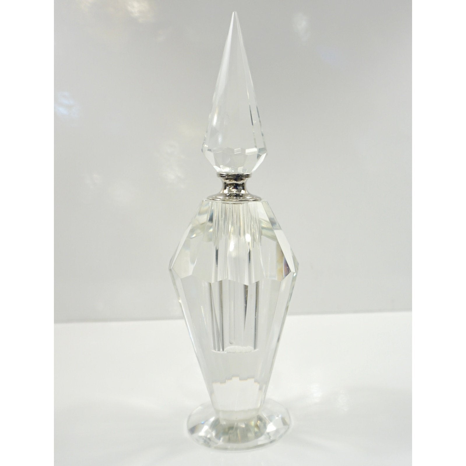 This elegant and sophisticated perfume bottle, a high-quality crystal product with Art Deco flair, and Hollywood Regency glamour, with a prismatic geometric pyramid shape, resembles a diamond for its multiple faceted cuts in the body, the base, and the stopper, producing an optical game of light reflections. Decorated with a chrome collar, the pointed faceted stopper of elongated rhombus form is fitted with a perfectly round glass pipet and screws in for maximum functionality.