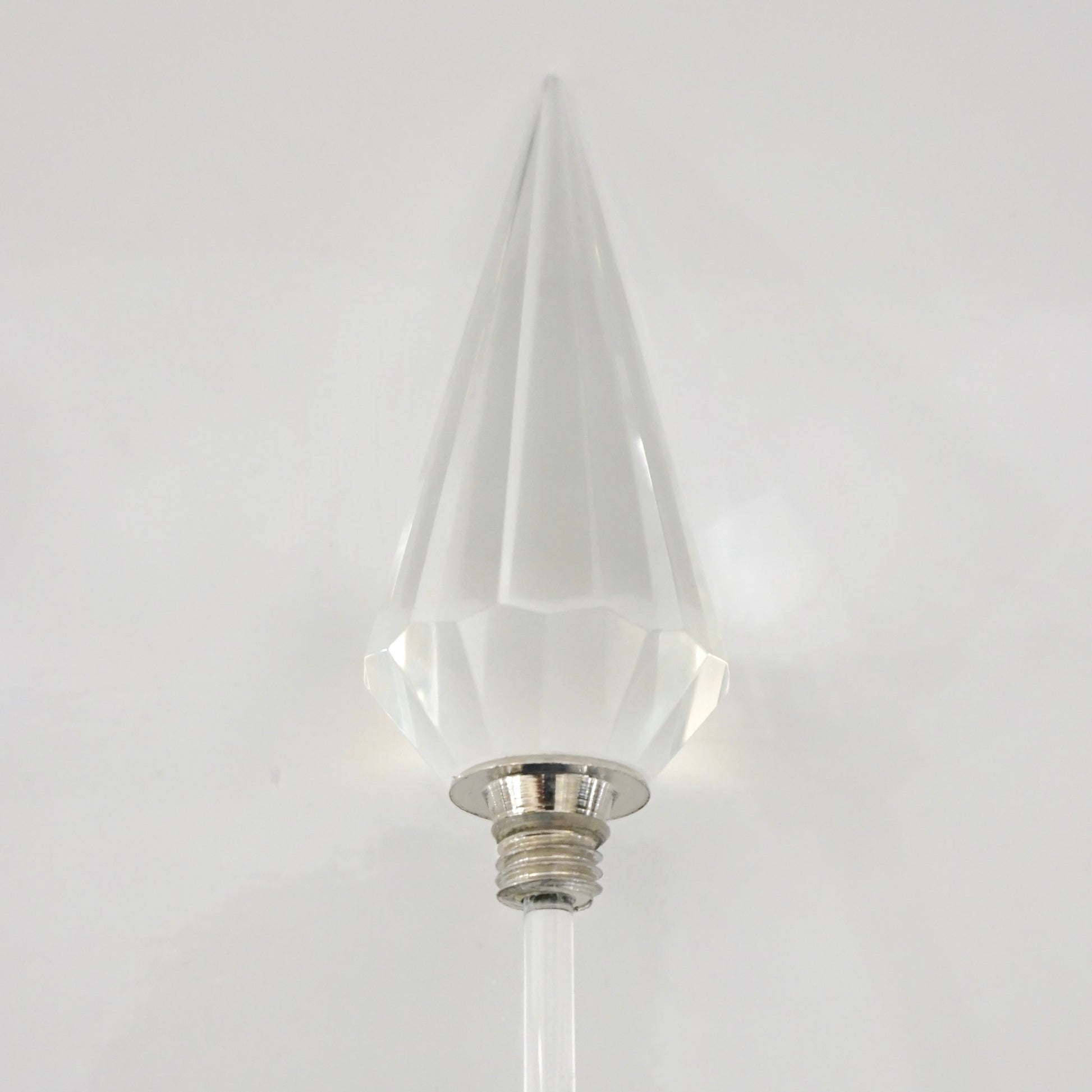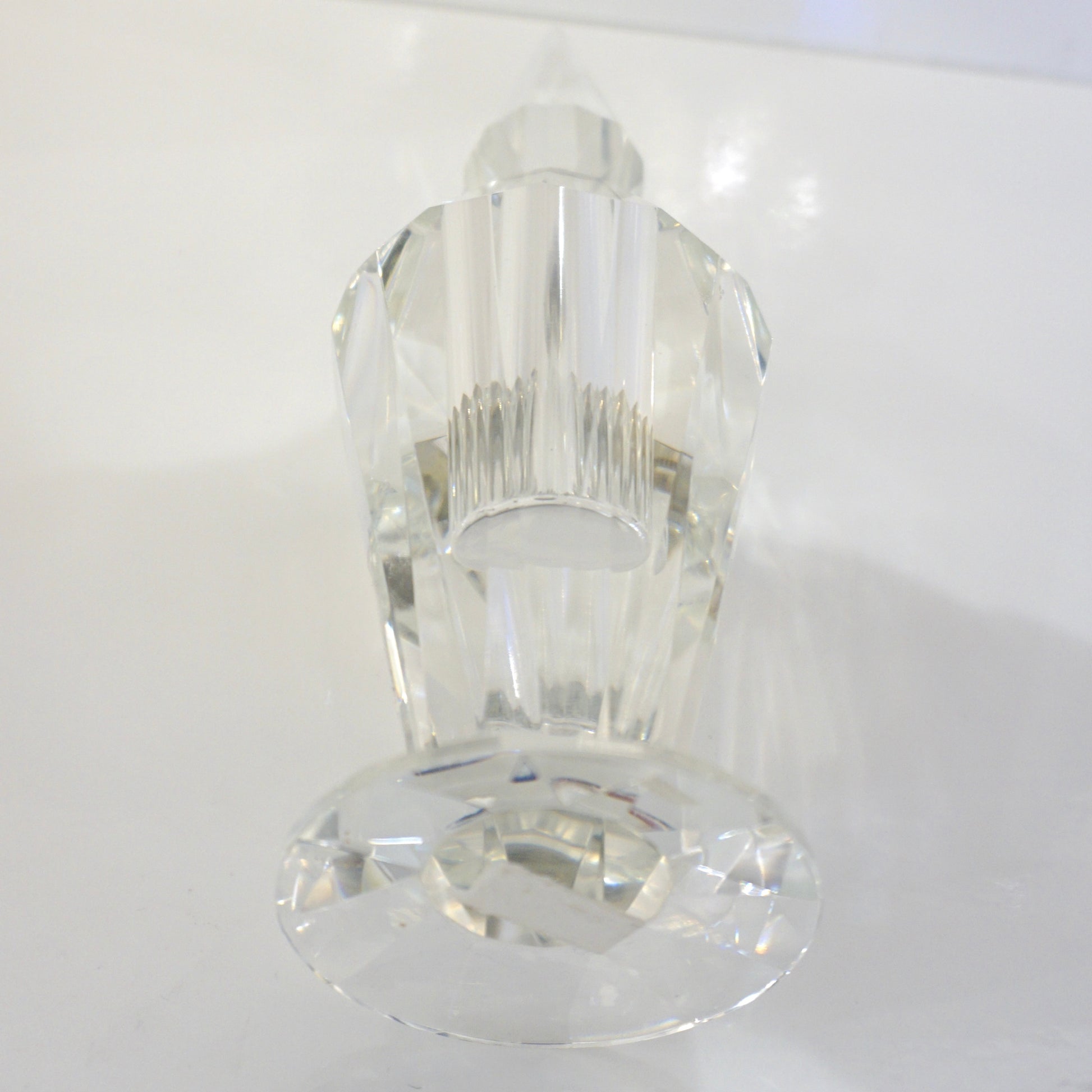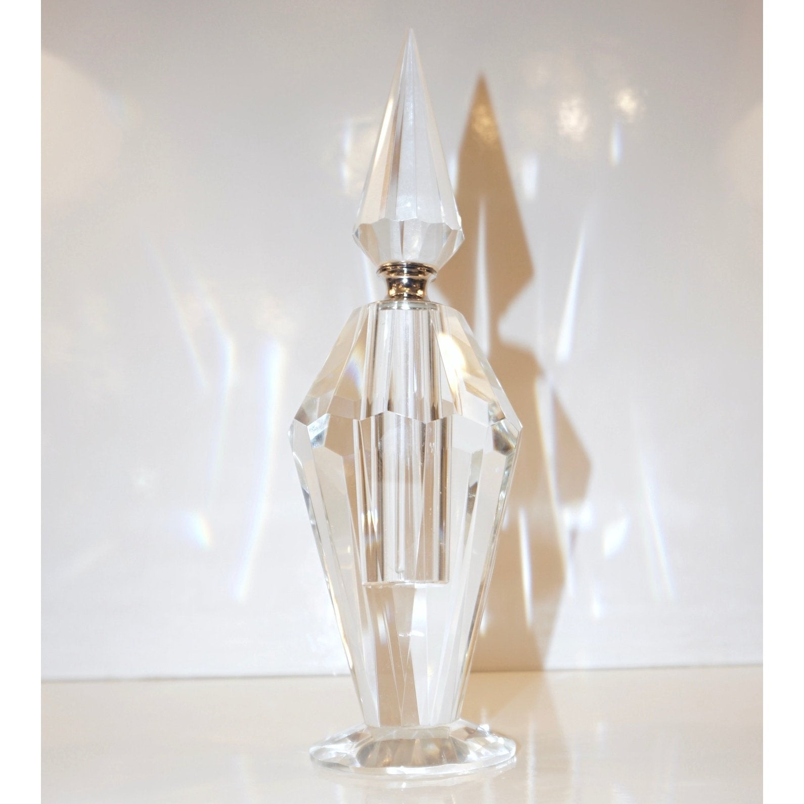 This elegant and sophisticated perfume bottle, a high-quality crystal product with Art Deco flair, and Hollywood Regency glamour, with a prismatic geometric pyramid shape, resembles a diamond for its multiple faceted cuts in the body, the base, and the stopper, producing an optical game of light reflections. Decorated with a chrome collar, the pointed faceted stopper of elongated rhombus form is fitted with a perfectly round glass pipet and screws in for maximum functionality.