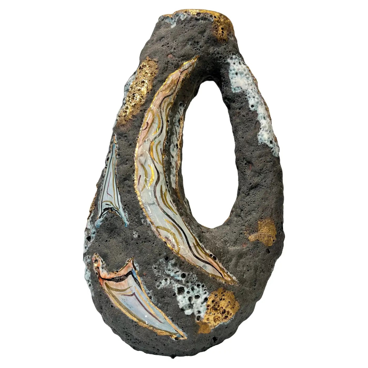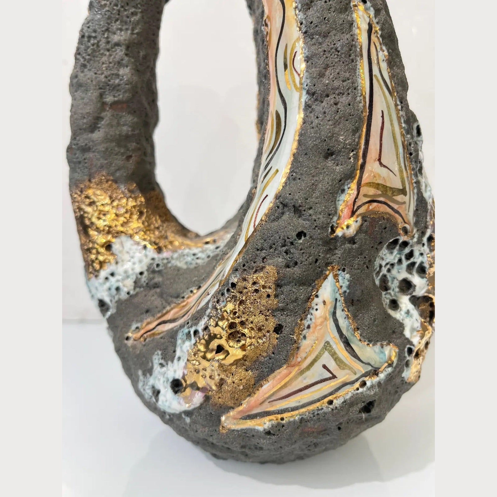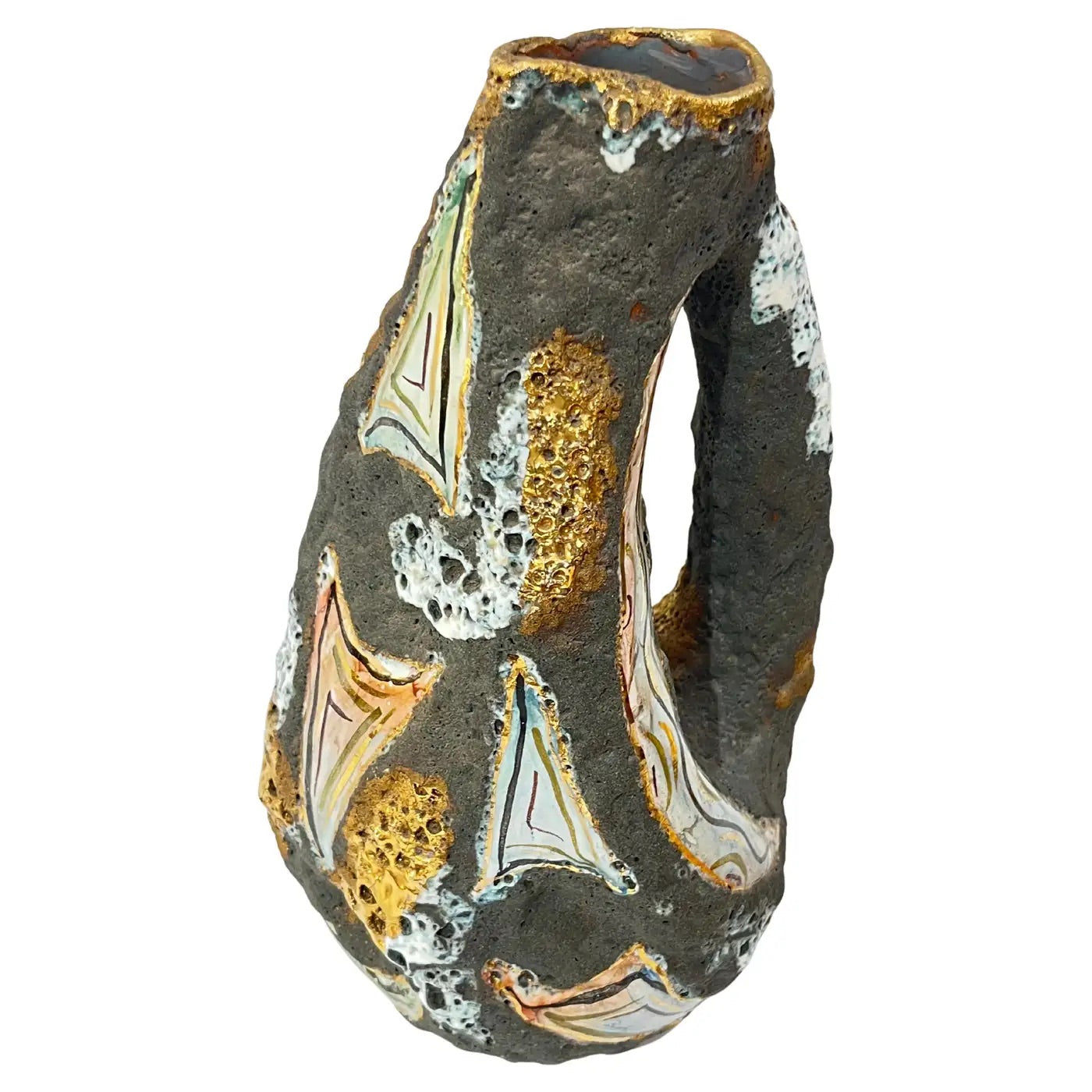 This enticing modernist mid-20th-century modern piece is an Italian sculpture Work of Art with the distinctive style of Italo Casini, a signed handled vase/jug. Some of Italo Casini's terracotta works have come into light with this same decorative technique of a telling rough volcanic lava finish in an organic brown moss green gray tint, enriched with enameled polychrome waved sail-shaped accents, in white, pink, light blue azur glaze. It is made precious with gold additions, creating glittering, shimmering reflections on the earthen surface. This sculpture marries Art and Function with the shape that welcomes branches and flowers to perfect the natural effect.