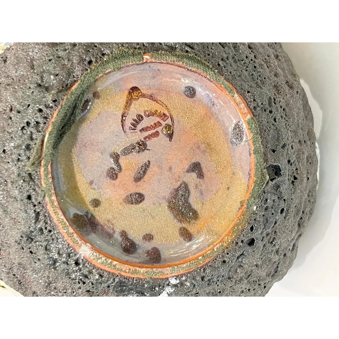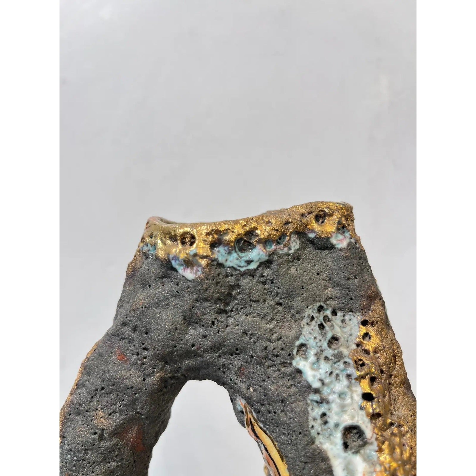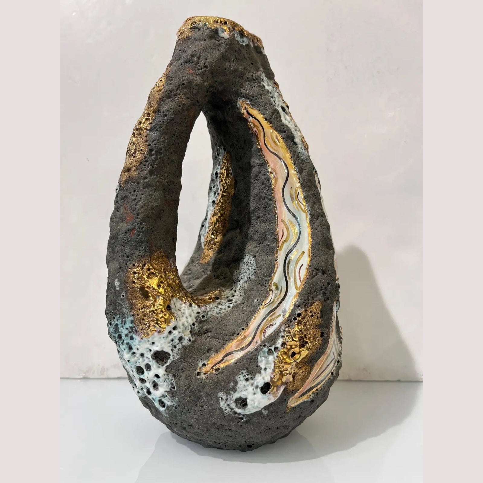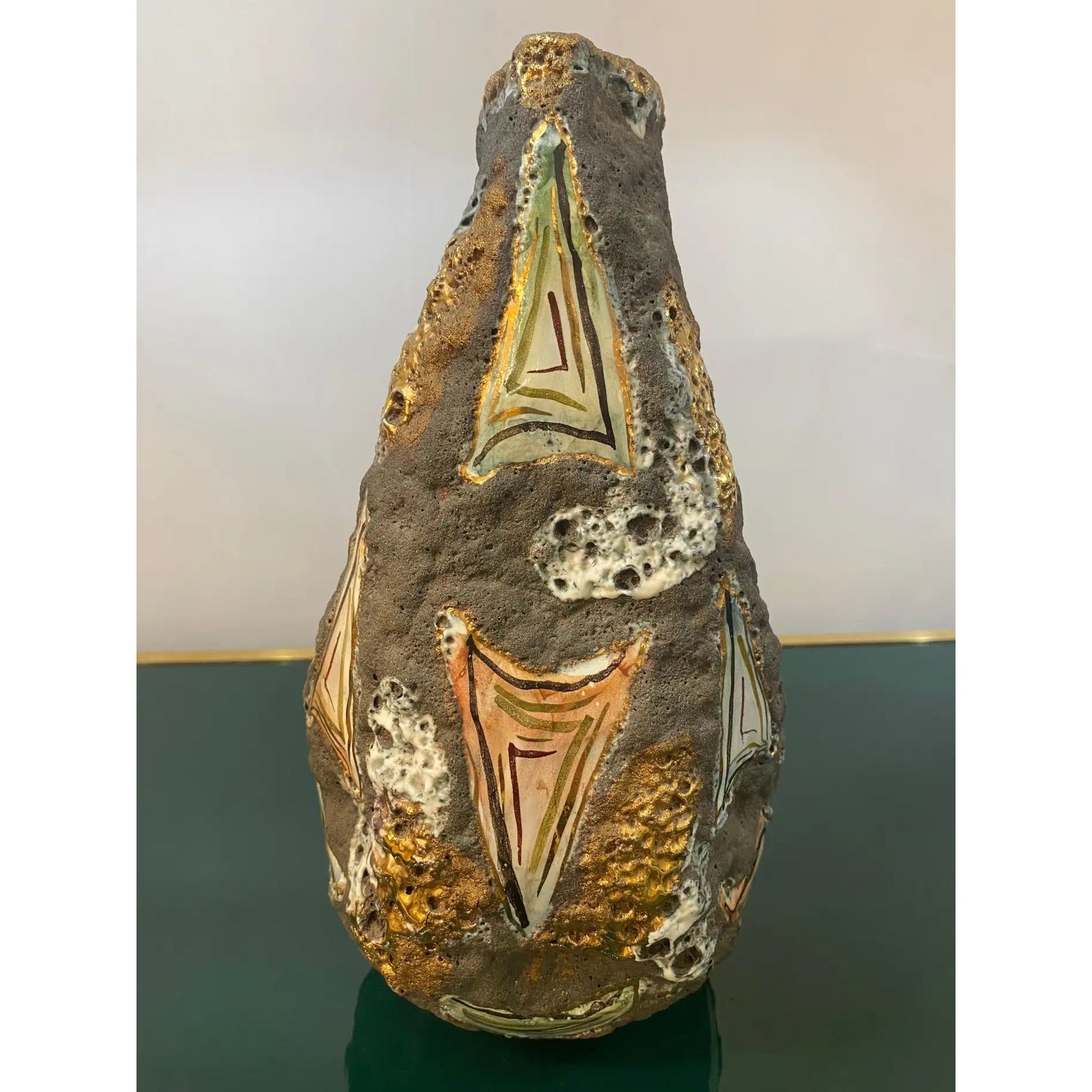 This enticing modernist mid-20th-century modern piece is an Italian sculpture Work of Art with the distinctive style of Italo Casini, a signed handled vase/jug. Some of Italo Casini's terracotta works have come into light with this same decorative technique of a telling rough volcanic lava finish in an organic brown moss green gray tint, enriched with enameled polychrome waved sail-shaped accents, in white, pink, light blue azur glaze. It is made precious with gold additions, creating glittering, shimmering reflections on the earthen surface. This sculpture marries Art and Function with the shape that welcomes branches and flowers to perfect the natural effect.