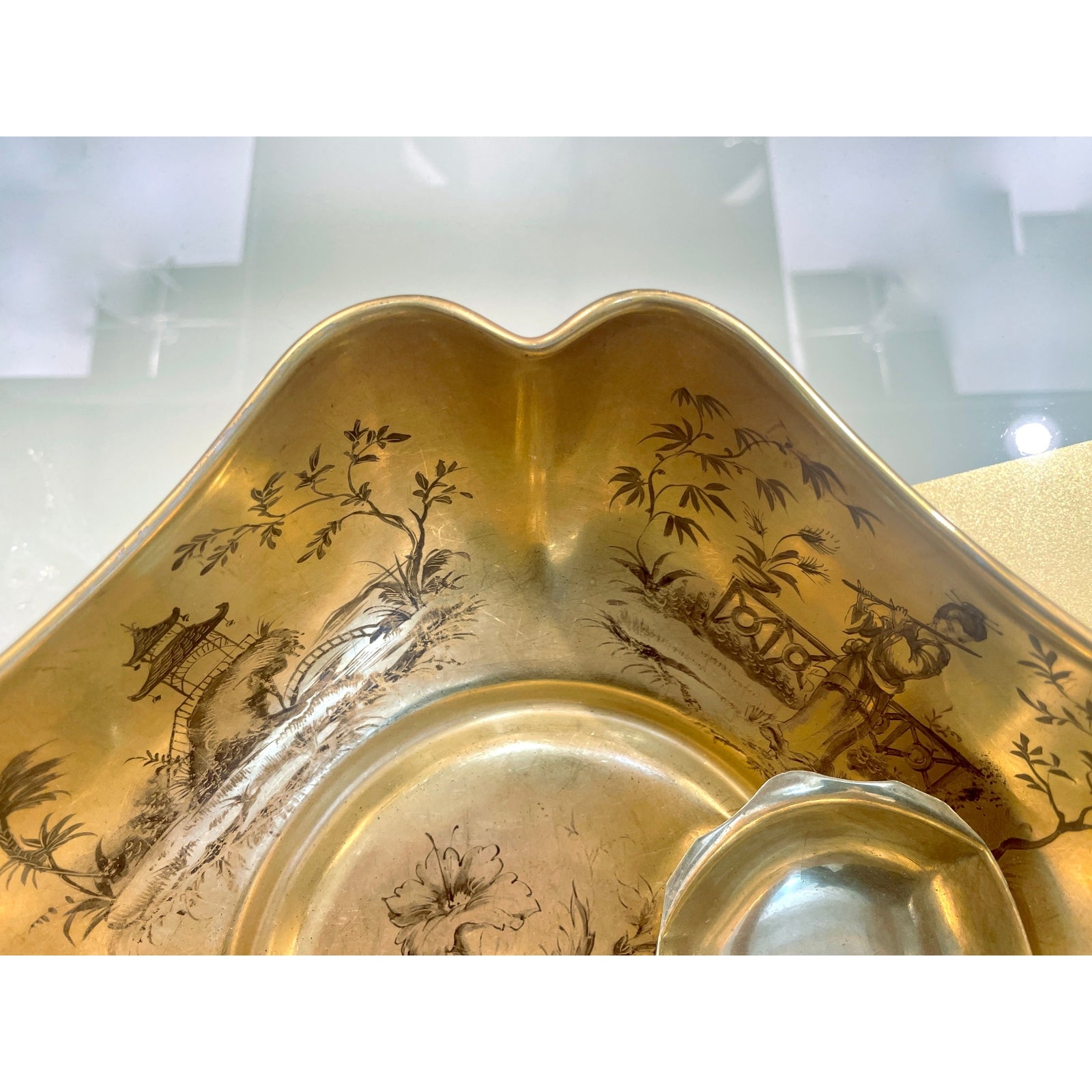 This ceramic piece is extensively decorated with pure gilding and chinoiserie motifs, repeated on the gilt metal spoon. The superb condition of the 2 items and the finesse of the hand movement and paintings make this duo a rare Work of Art, a statement for collectors.
