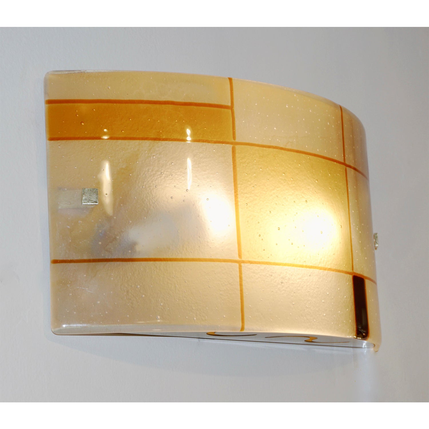 Vintage Mid-Century Modern Italian one-of-a-kind pair of handcrafted curved wall lights or flush mounts in high quality frosted Murano glass worked with the technique Pulegoso: numerous small bubbles that make the glass semiopaque with a cream white translucence and give the surface an irregular texture. The patchwork decor of cubism post-impressionist design inspired by Mondrian is composed of rectangular geometric shapes and lines in brown, orange, pale yellow colors. The sides are elegantly closed by covers in gold painted metal cut with waved narrow slits that make a nice decor and have the functionality to let the light shine through. Can be hung vertically, horizontally or flush mount.