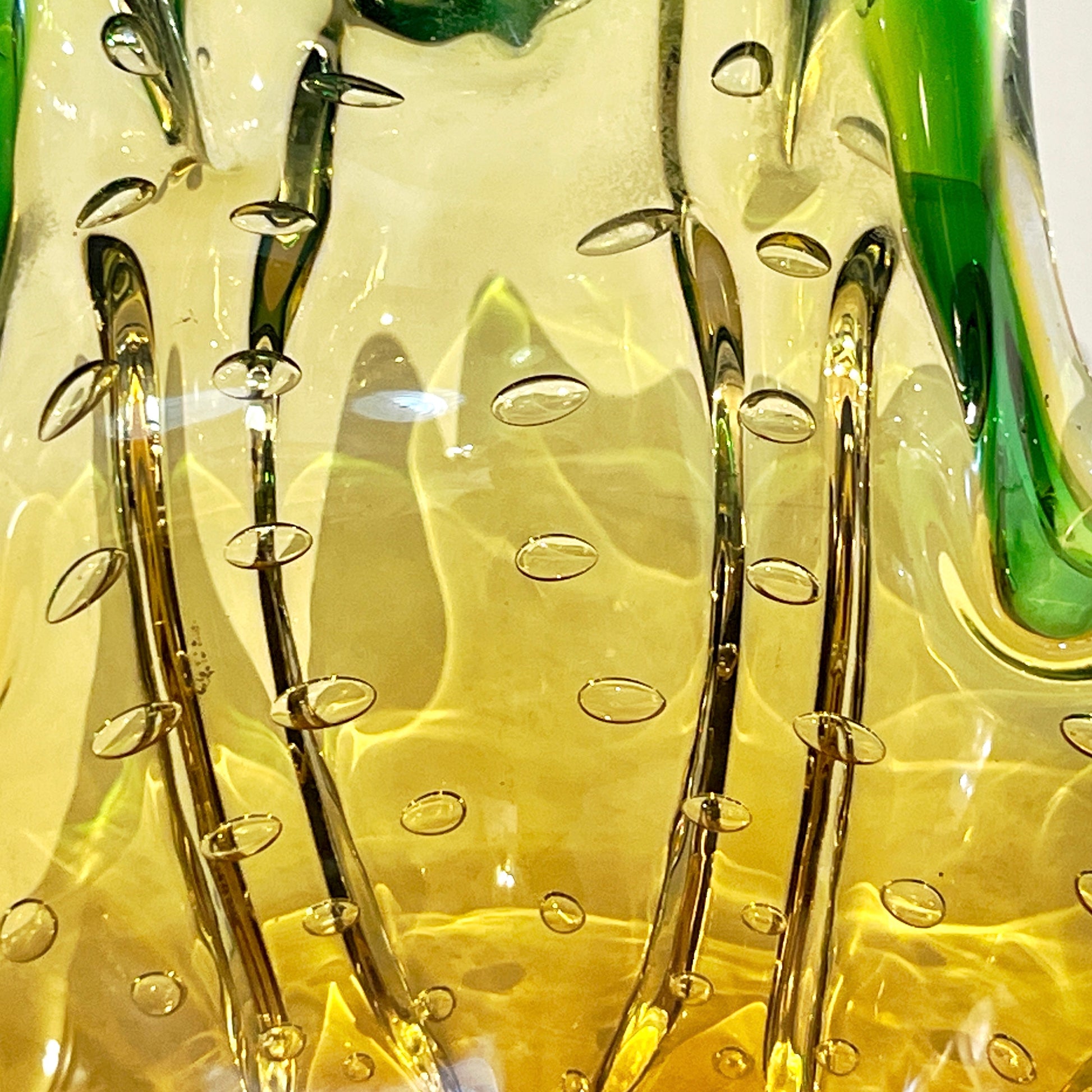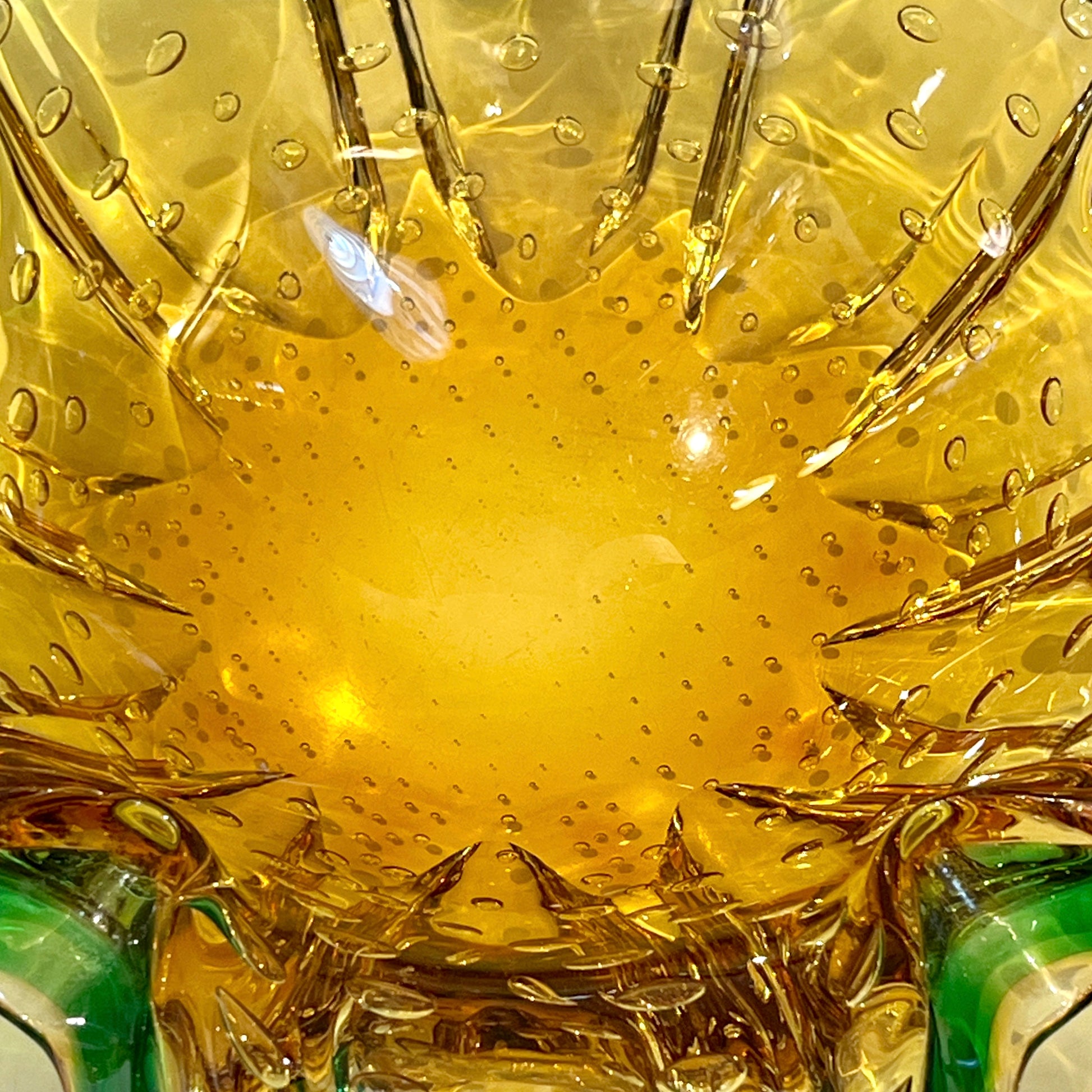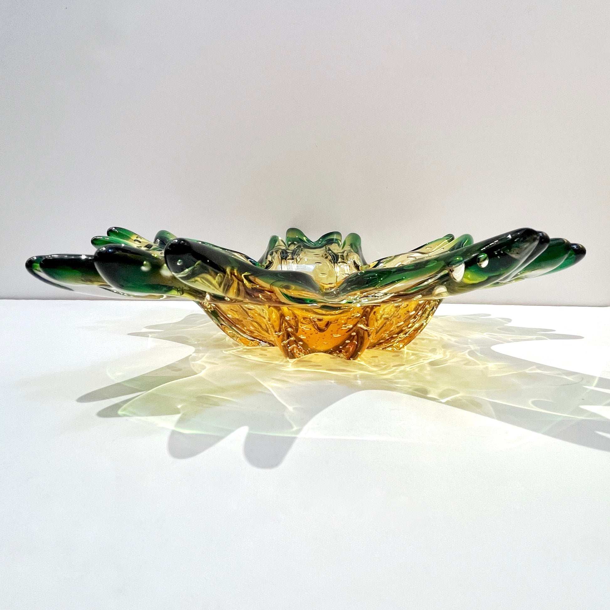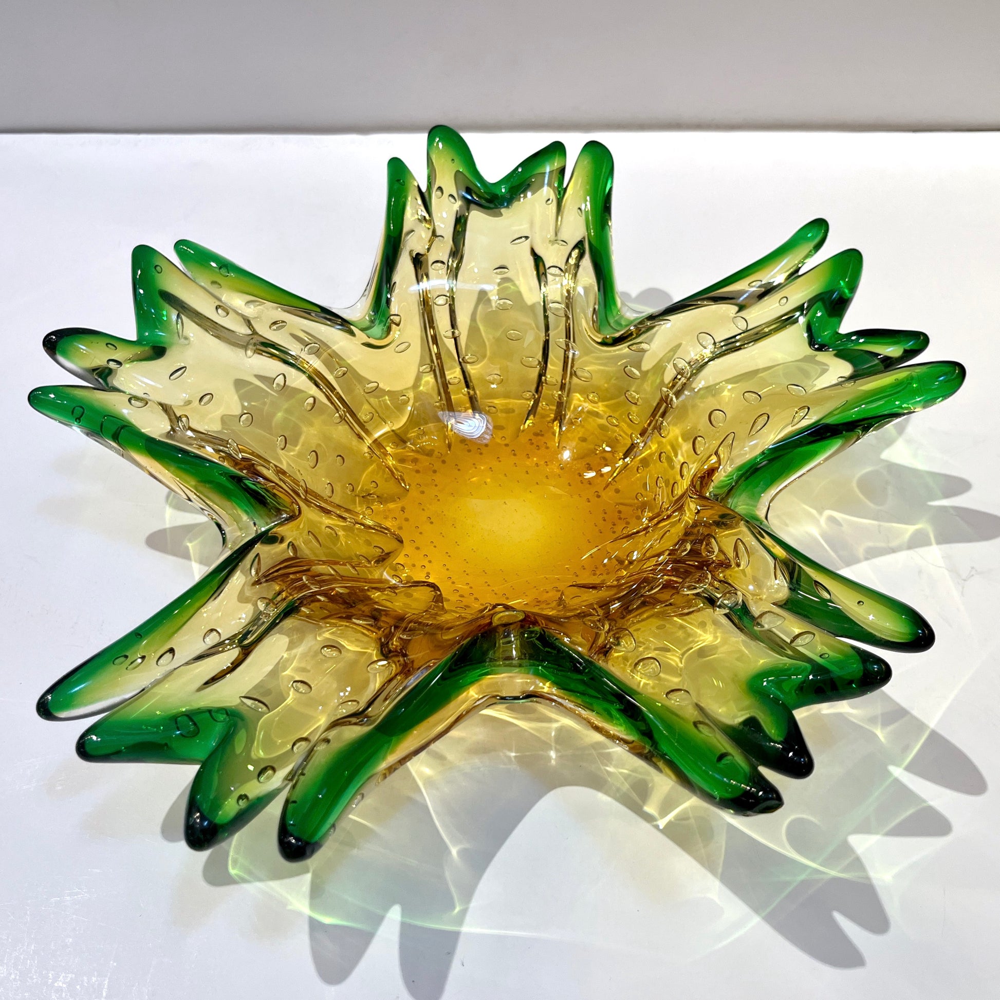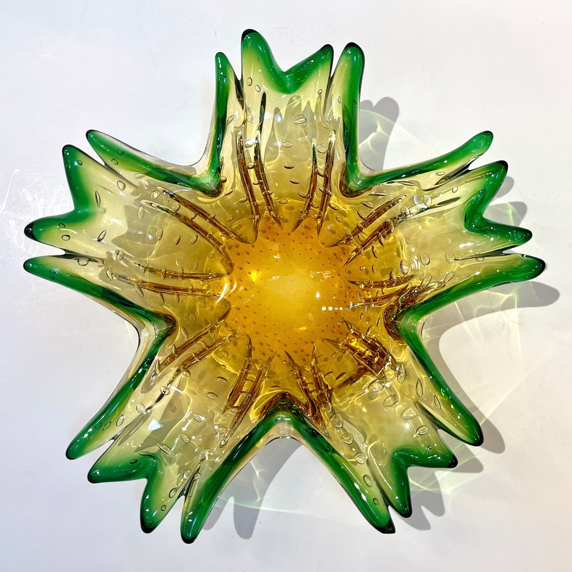 Circa 1970s, one-of-a-kind delightful and rare Venetian Art glass organic centerpiece / vide-poche, entirely Hand Made in blown Murano glass, high quality of execution in 2 colors: an amber color gradient with a rich transparent gold center and a warm amber perimeter edged in a glowing hunter green. This bowl is worked with Bulicante, bubbles in the glass, that add a reflecting and glowing texture. The elegance of the colors and the unusual star shape make this object a rarity on the market.