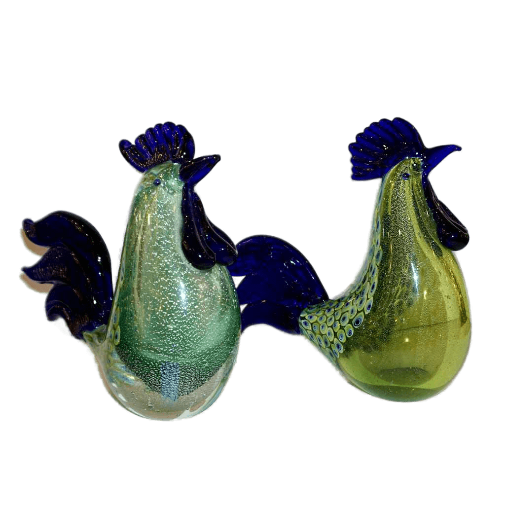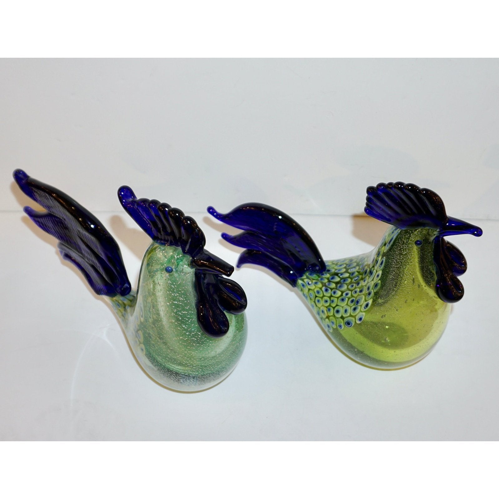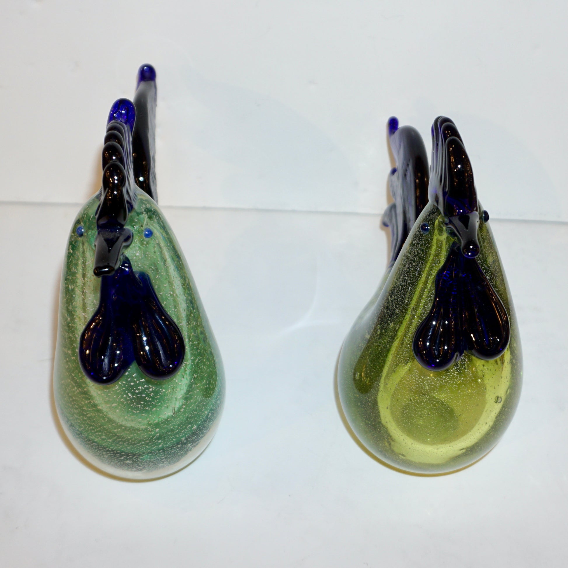 1980s Pair of Italian Vintage Silver Navy Blue Green Murano Art Glass Hen Bird Sculptures
