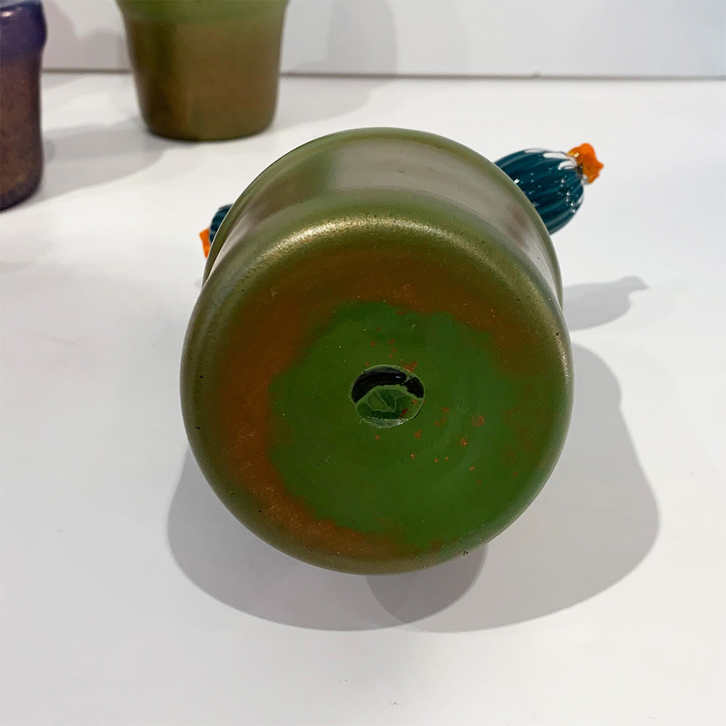 Contemporary Italian highly collectible potted glass cactus of limited edition, entirely handcrafted in Murano, with modern Minimalist design blown by Fornace Mian, with a lifelike organic modernist shape in crystal overlaid teal green textured Murano glass highlighted with branches and 3 orange bloom flowers, planted in a lime green Murano glass pot worked with pure gold, adding a pearl-like effect.