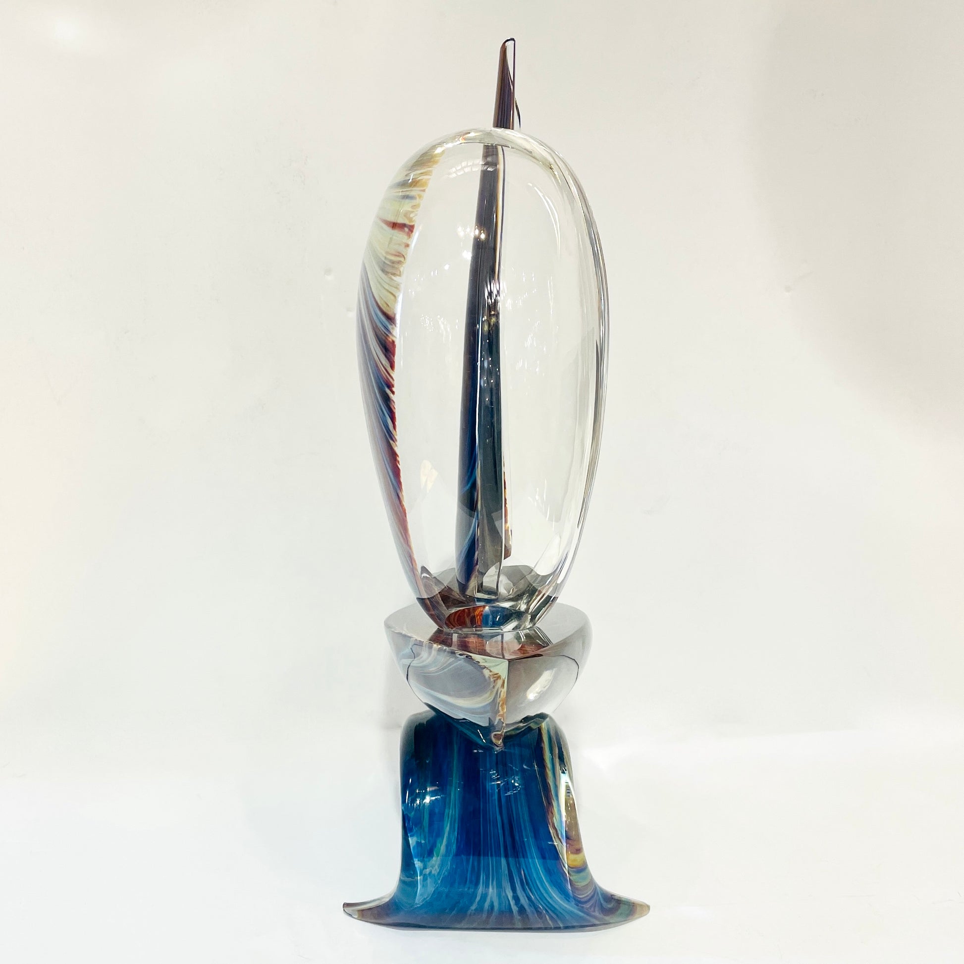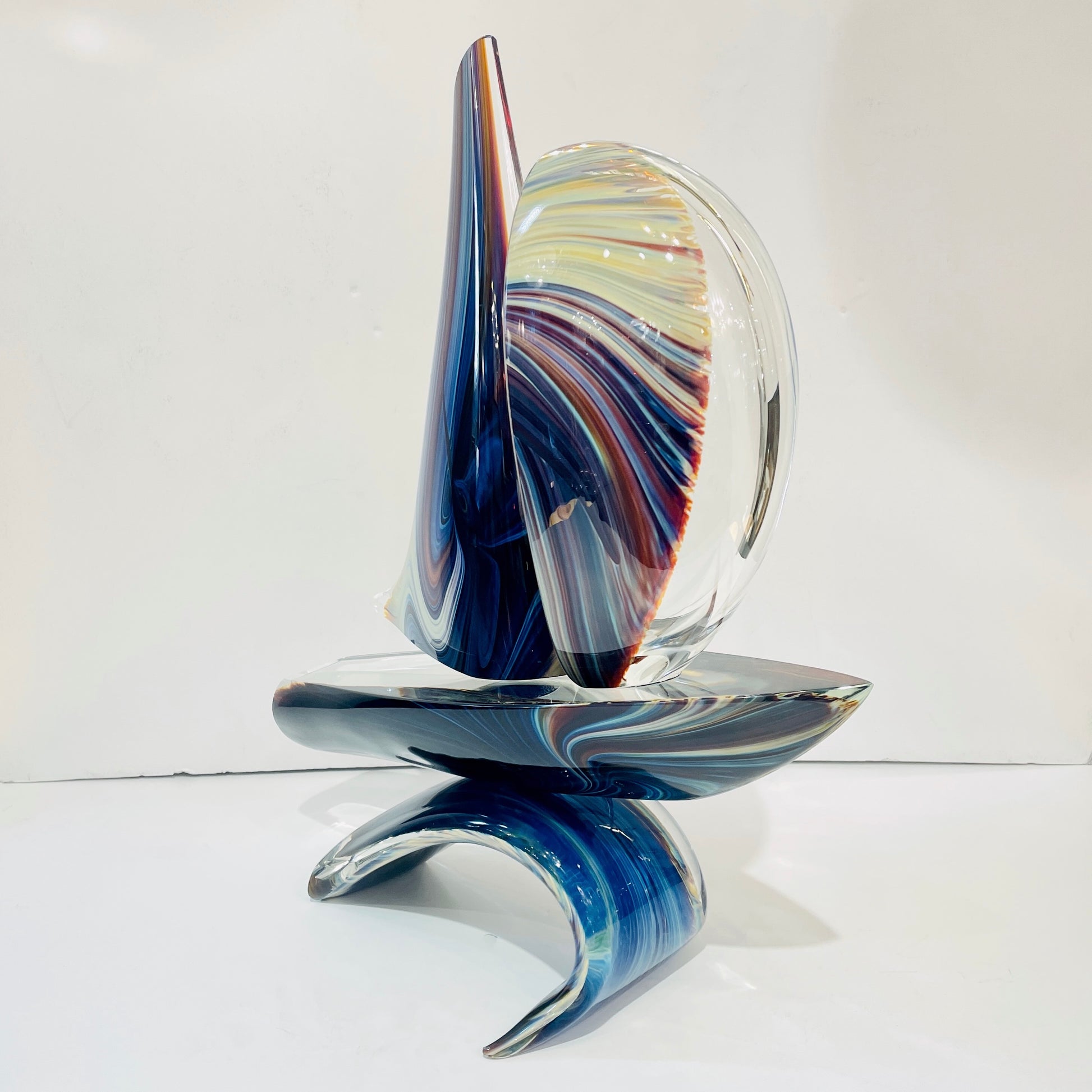 A sailing boat, a modern Art sculpture in overlaid Murano glass, a signed piece, blown by Luigi Moro, custom made at Vetrerie Riunite Colleoni on the Murano island, worked with the difficult technique Calcedonio glass, to resemble the Chalcedony stone in the variations of multicolor tones in white, yellow, brown-red, blue, green, black... This extraordinary chemical process, dating from the 15th century was once lost and then rediscovered to be perfected by mixing the glass with silver salts and colored minerals, making these creations precious, producing a unique explosion of warm accents and streaks of light and shadows. This piece is exceptionally curated with a wave as a base, a sail in crystal on one half, and in colors on the other to accentuate the organic movement.