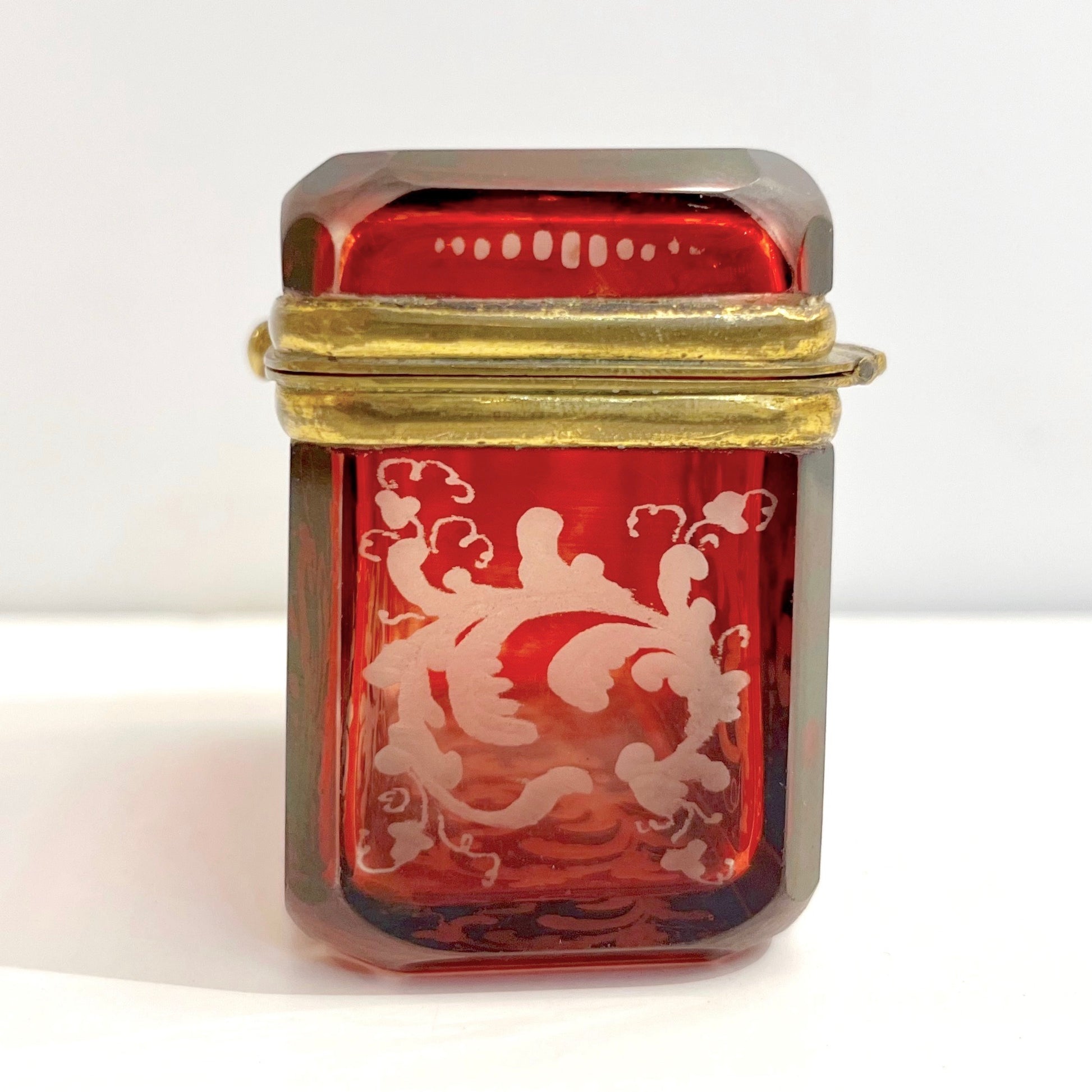 Antique Austrian Hinged Lid Ruby Red Bohemian Engraved Cut Crystal Trinket Box