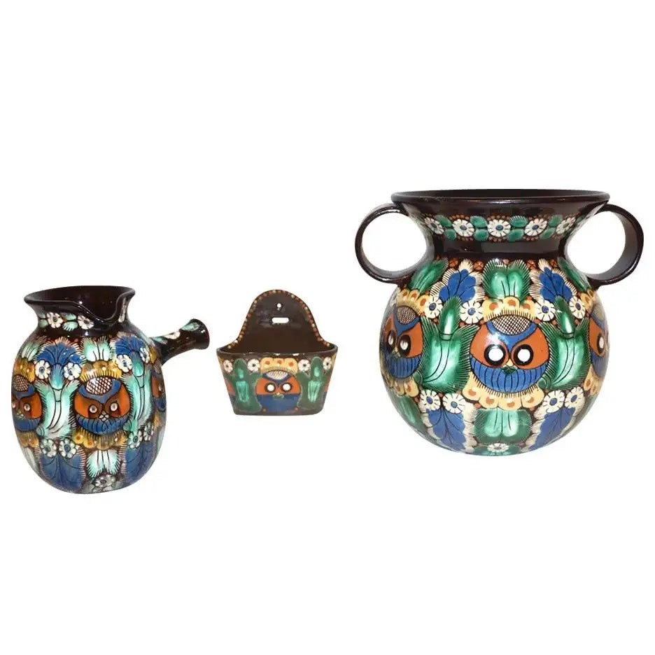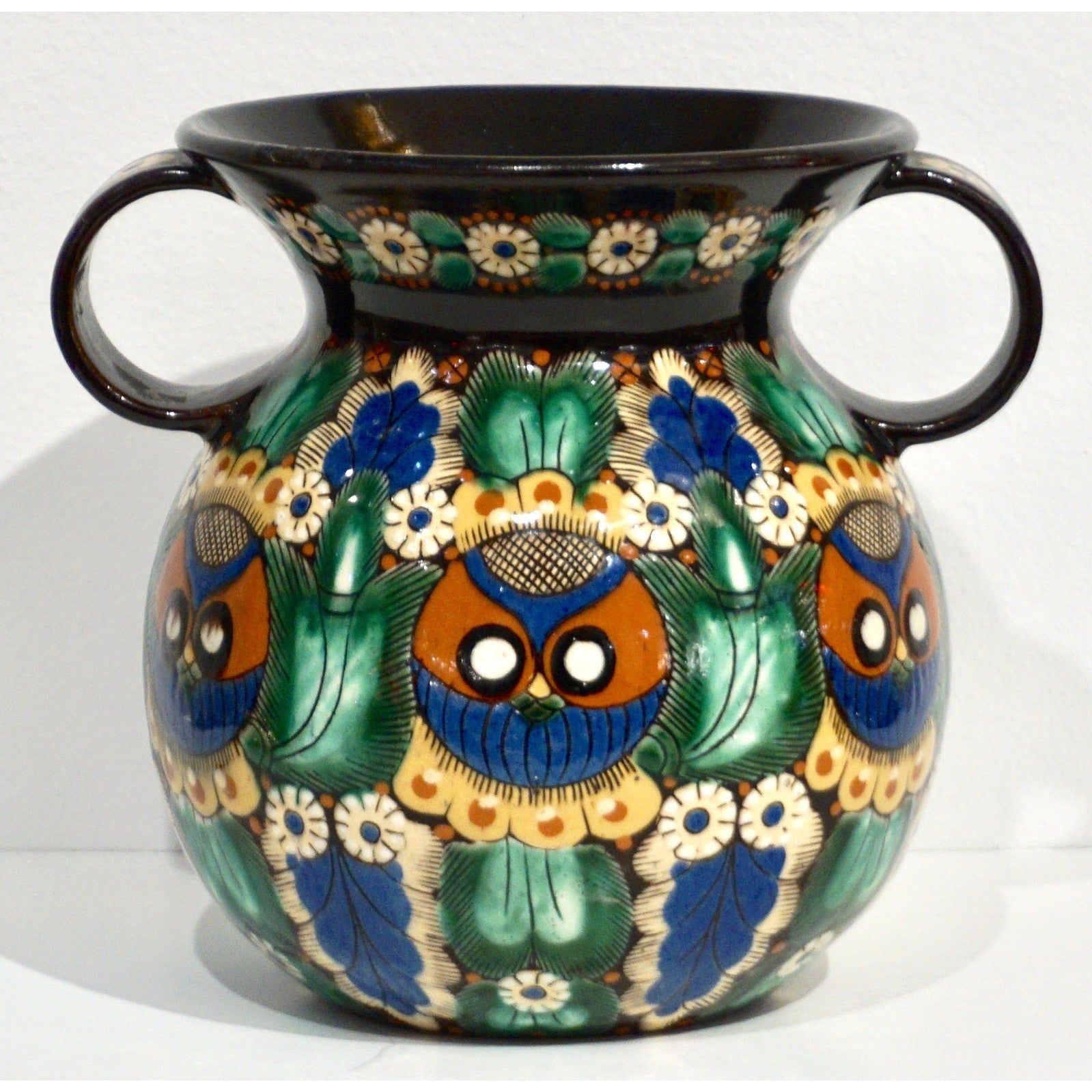 Early 20th century Arts & Crafts Majolica art pottery two-handled vase made by the Swiss factory Thun / Thoune, circa 1910s. This two-handled vase, entirely handcrafted and hand-painted, is decorated with a modern Eastern accent design, on a very dark brown background with bright slipware in yellow, white, green, brick orange, and black enhanced with a sgraffiato technique, depicting owls in the midst of exotic parrot feathers. Highly collectible, signed.