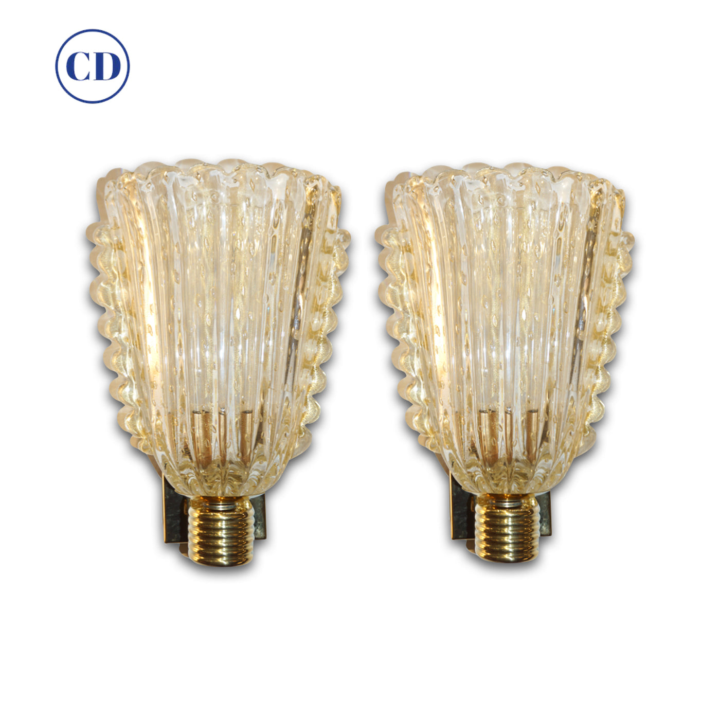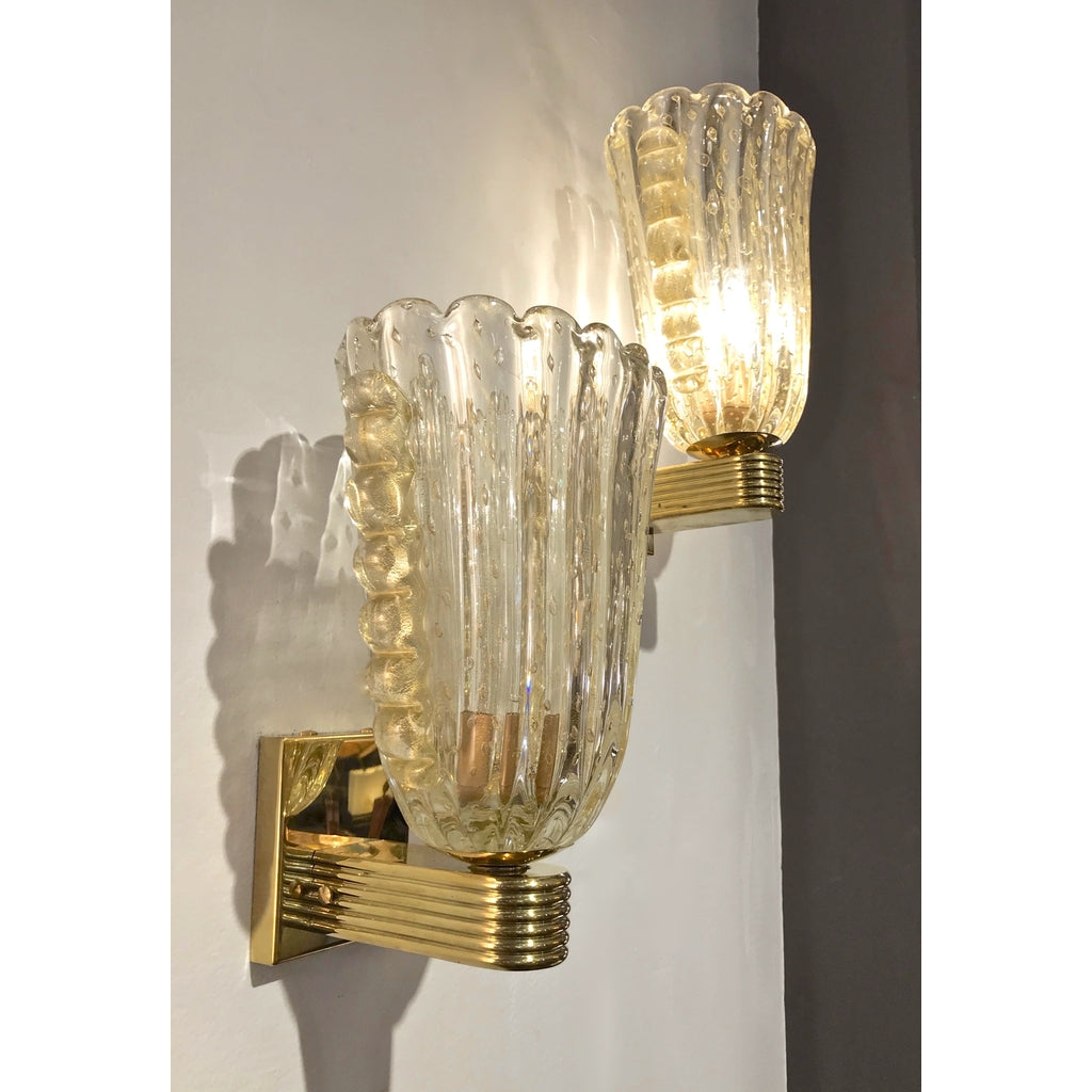Venetian pair of wall lights of modern organic design, with Art Deco Design, entirely handcrafted in Murano (Italy), the scalloped edge bowls in high-quality crystal blown Murano glass, in Barovier style, decorated with the Pulegoso technique: big bubbles in the glass, are worked with pure 24-karat gold inclusions and supported by handmade brass arms with ribbed texture.