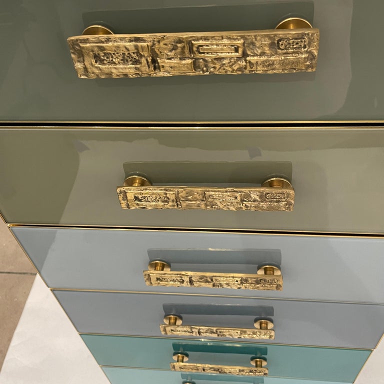 This attractive wardrobe/chest with Art Deco streamline design, entirely handcrafted in Italy, is decorated on the front with various tints of colored glass: aquamarine, turquoise, sky blue, grey, beige, taupe..., and solid colors on top and sides, raised on elegant brass tapered legs with foot. The neat drawer interiors are in solid warm pine. Attention to details with the top surface and drawers edged in brass all around, rectangular cast brass handles with an organic ethnic texture in relief.