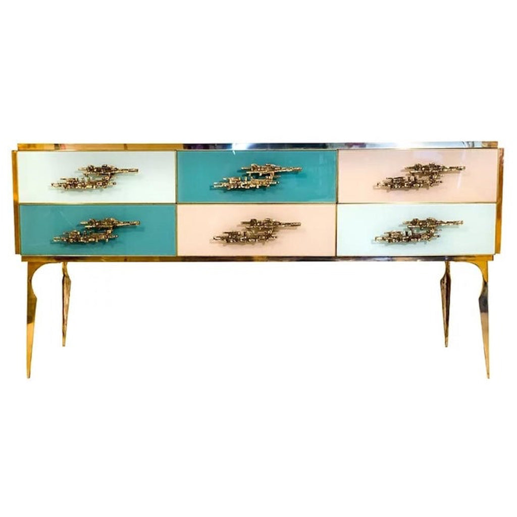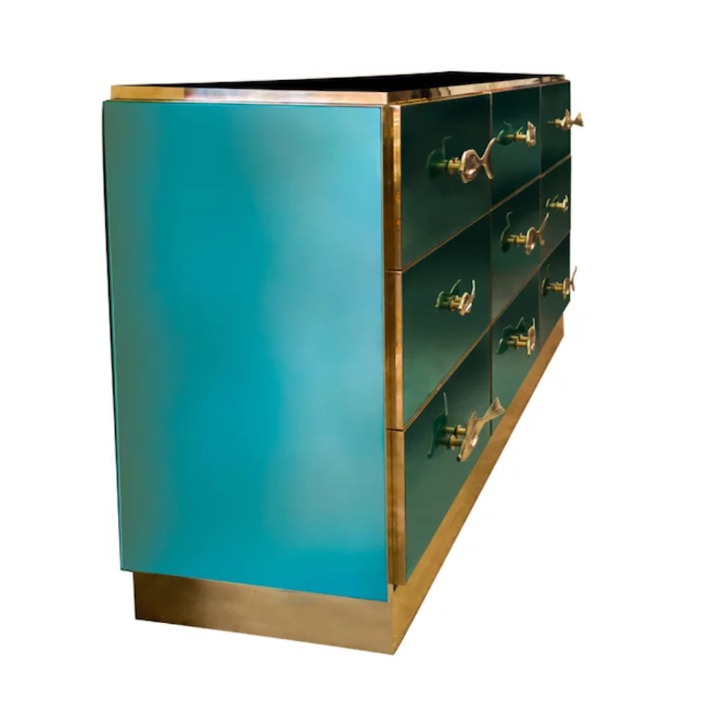 Bespoke Italian Brass Emerald Blue Green Art Glass 9-Drawer Dresser Sideboard