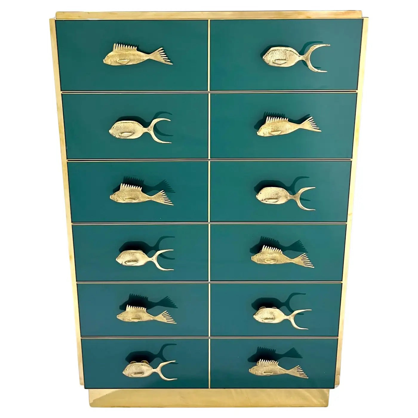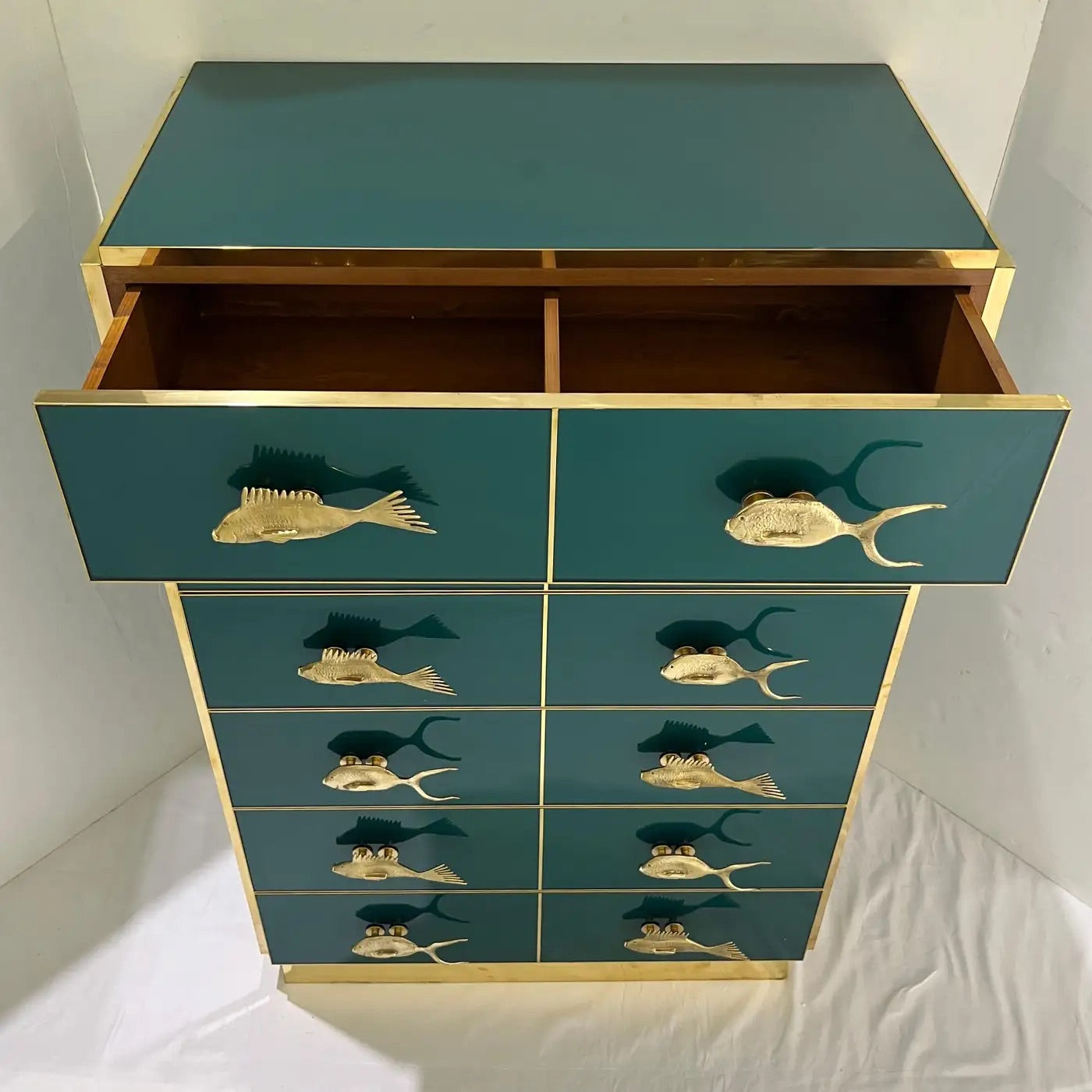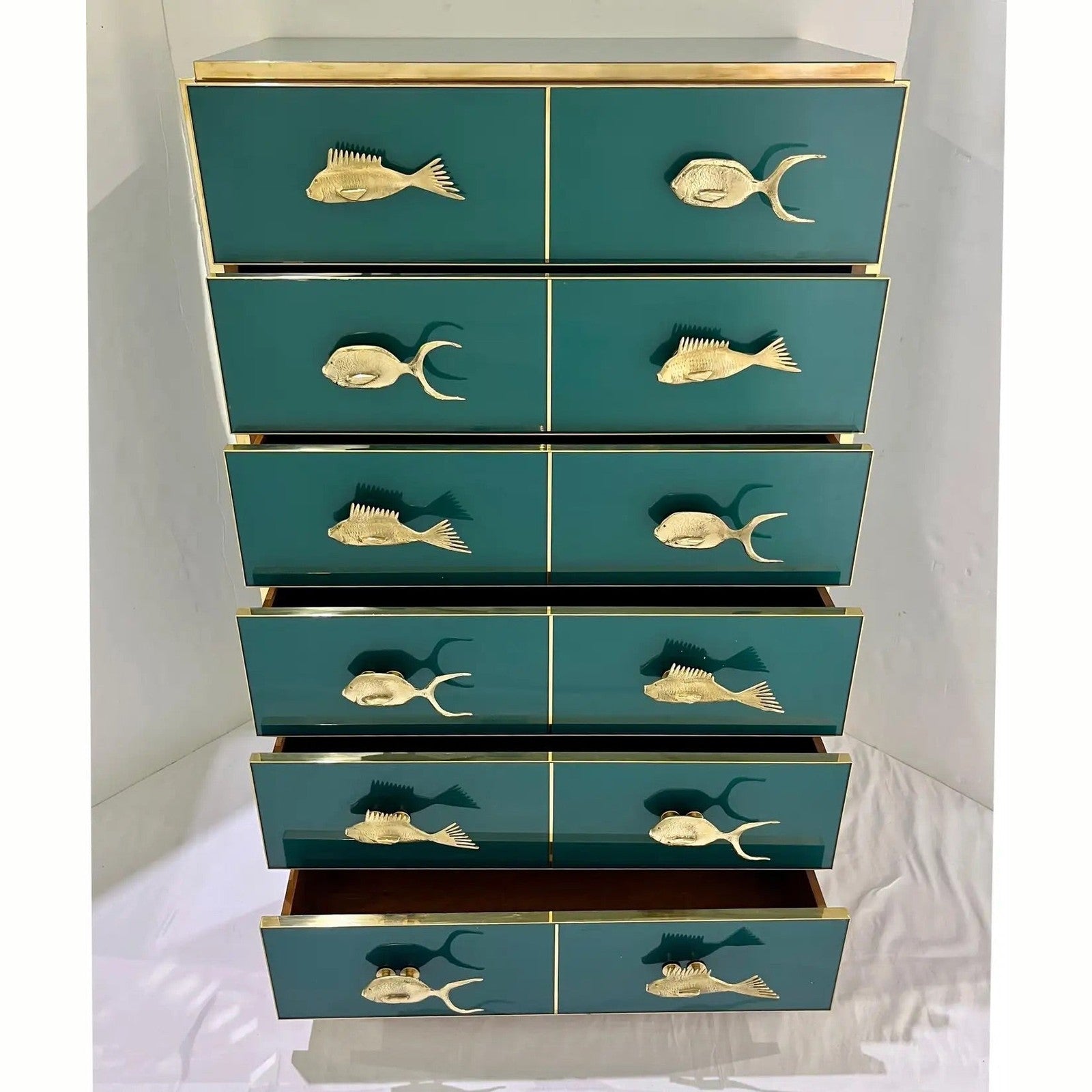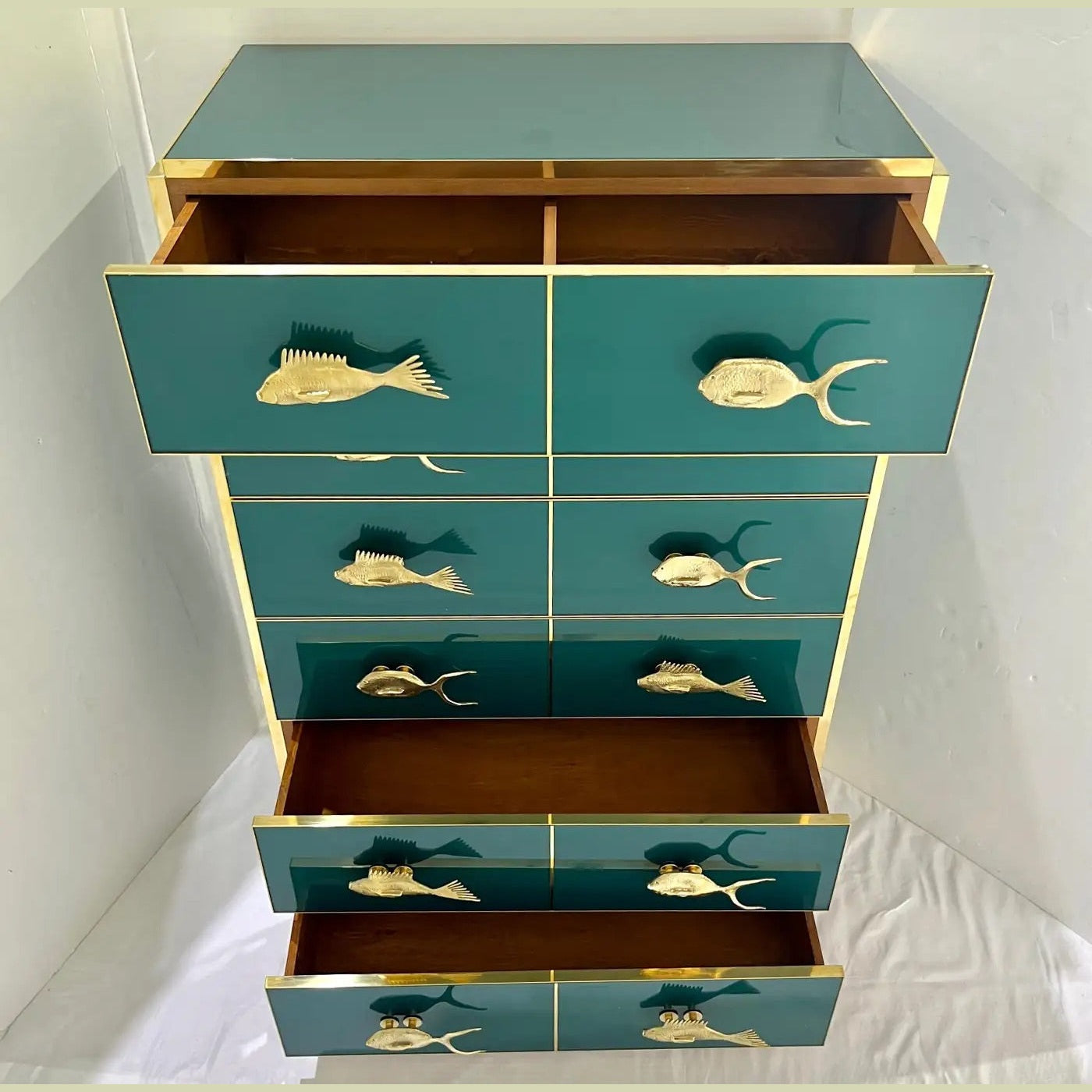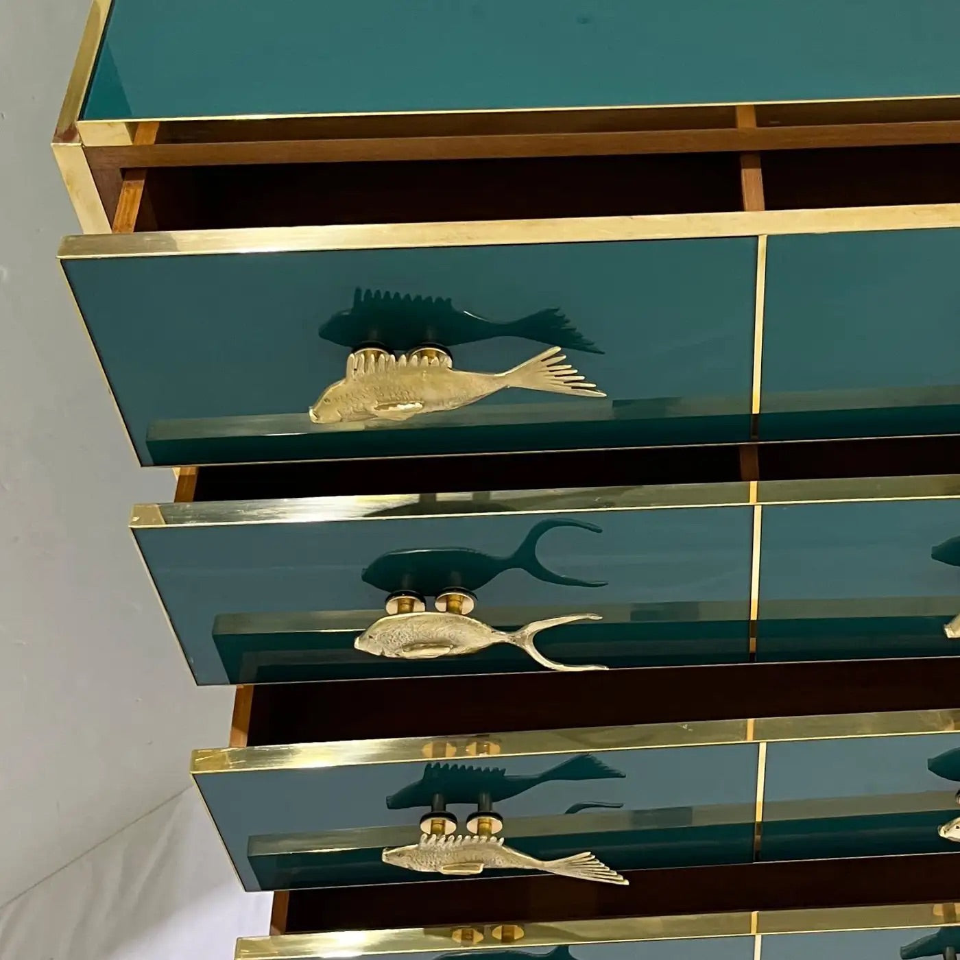 Bespoke Italian Brass Emerald Blue Green Art Glass 6-Drawer Highboy Dresser