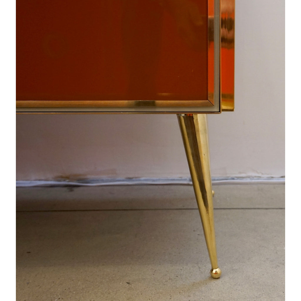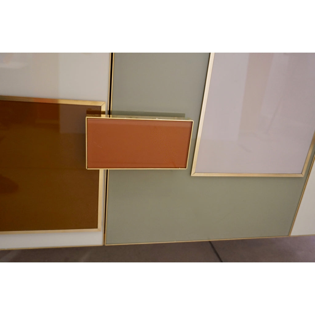 A contemporary creative 3-door modern credenza, entirely hand-made in Italy, the surround in an attractive geometric decor that recalls Rothko's paintings, with raised art glass panels edged in brass, in different colors, ivory cream white, black, ochre, terracotta brown, and pastel green. Details of high-quality execution with the whole body and doors exquisitely edged with brass profiles, the raised pattern, handcrafted handles, walnut veneered interior with shelves edged in brass. On splayed brass legs.
