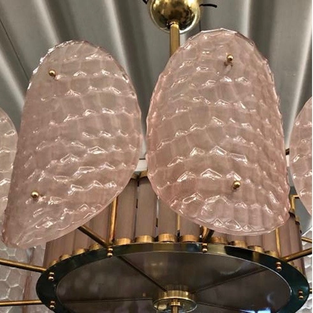 A contemporary custom organic modern chandelier, entirely handcrafted in Italy, with a handmade brass double frame with Art Deco flair. The exterior is formed by nature-inspired curve oval convex elements resembling sea turtle backs in blown textured transparent Murano glass with an organic modern rose pink tint. The interior frame is a nicely scalloped airy brass structure decorated with sophisticated crystal pink Murano glass rods, supported by a brass decorative ring to enclose the bottom fitted with an elegant frosted pink Murano glass.