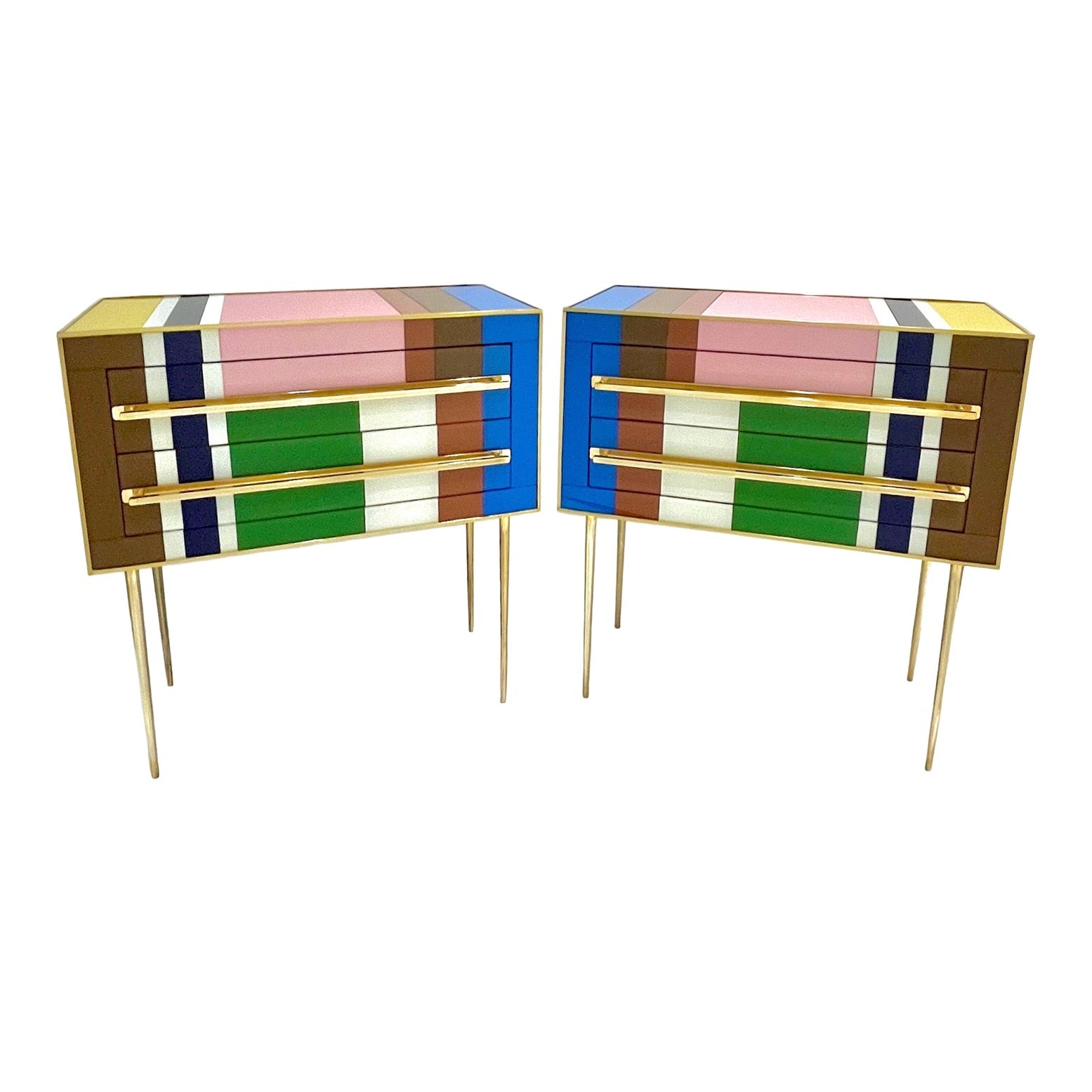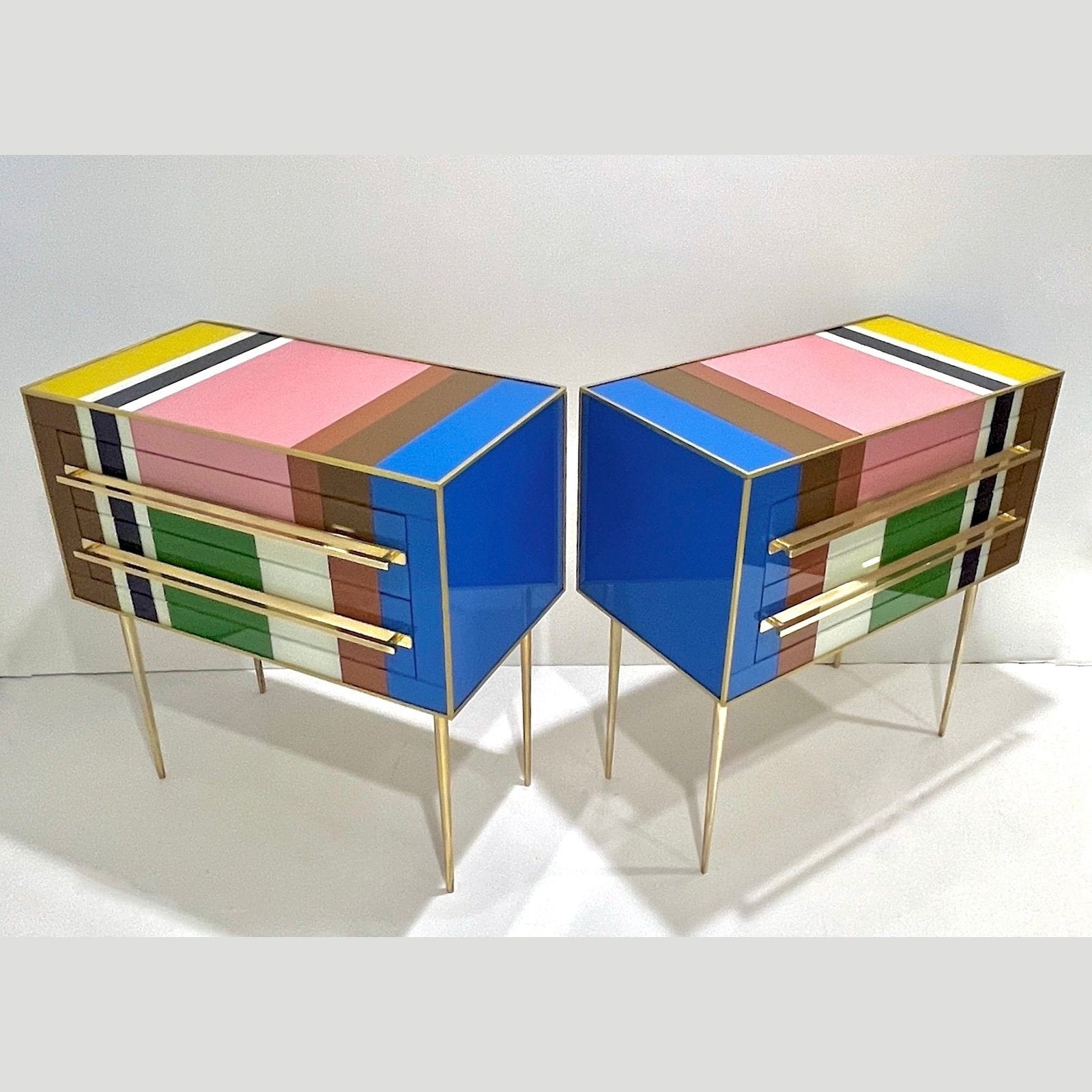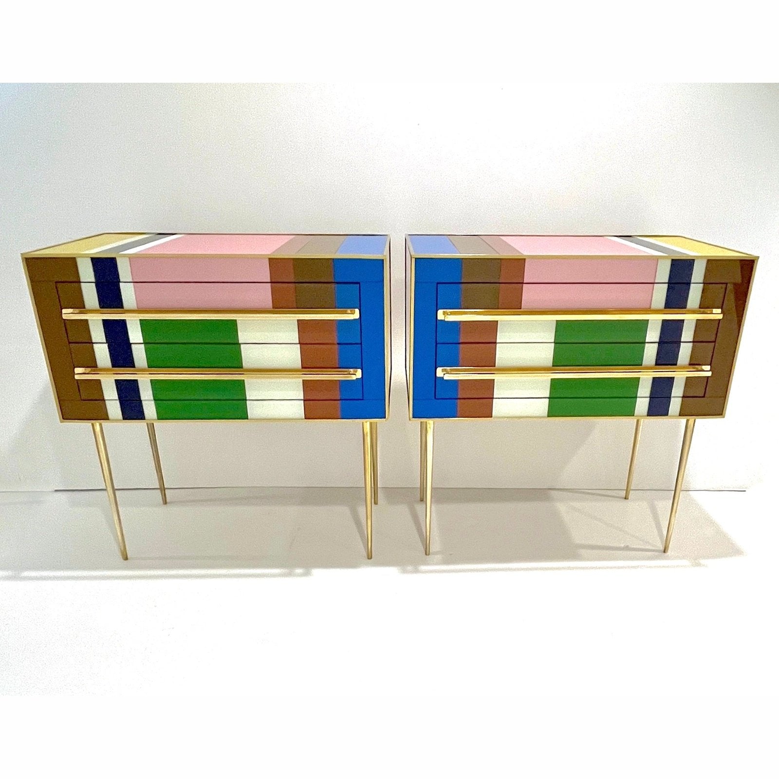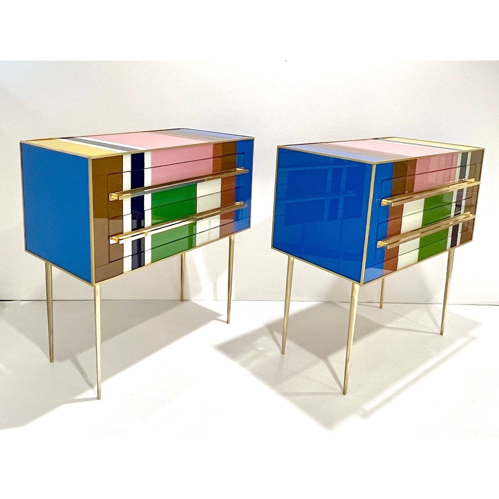 Early 2000s modern graphic pair of geometric Pop Art design two-drawer bedside tables / nightstands, entirely handcrafted in Italy, with a Piet Mondrian inspired abstract decor, the body with a surrounding edge in brass and the 2 drawers have an incased design framed in colored glass: navy blue, aquamarine, moss green, cream white, gold, taupe gray, ochre, pink. They are raised on sleek stiletto brass legs with fronts enhanced by Minimalist handmade straight handles in brass. Depth excluding protruding handles: 14.6 in