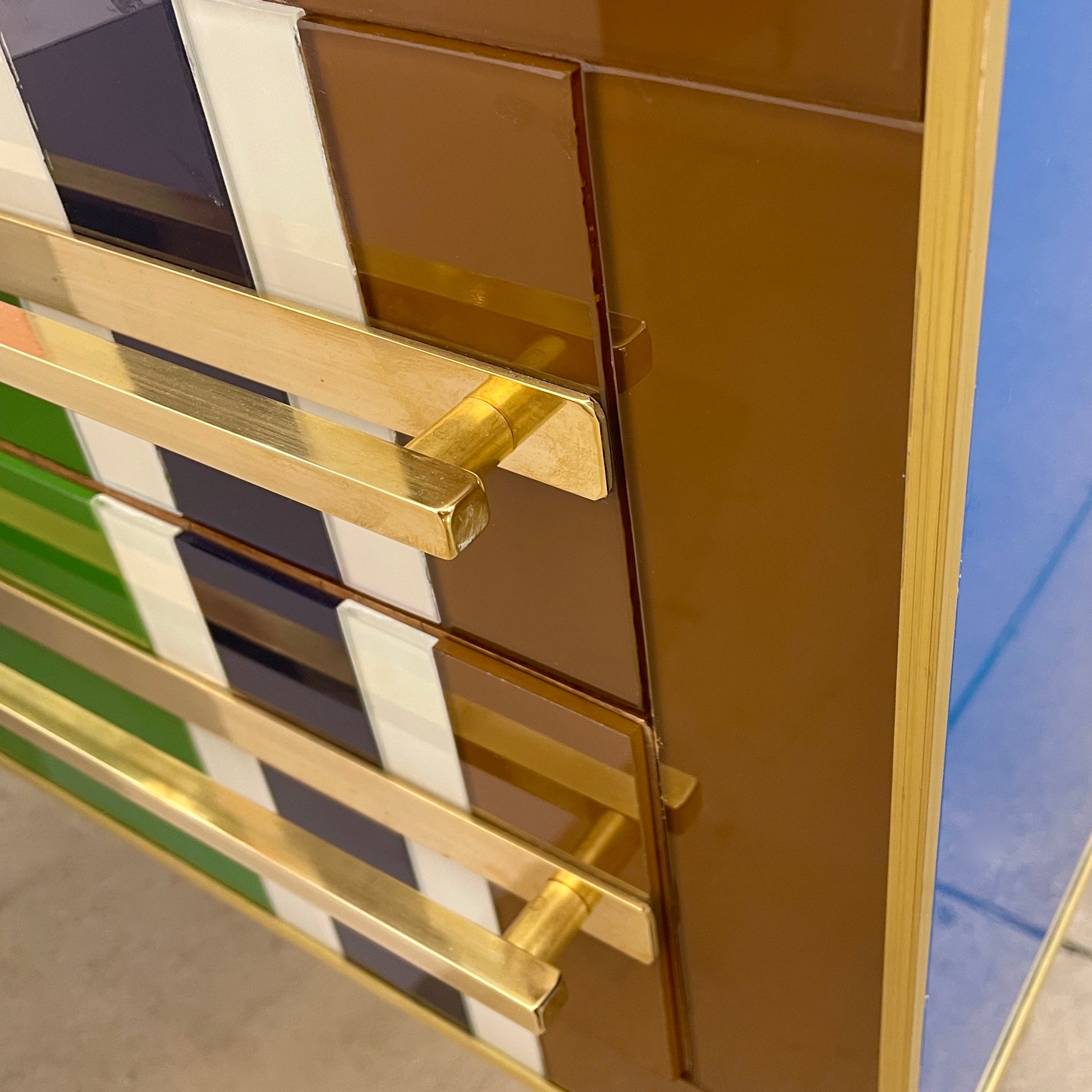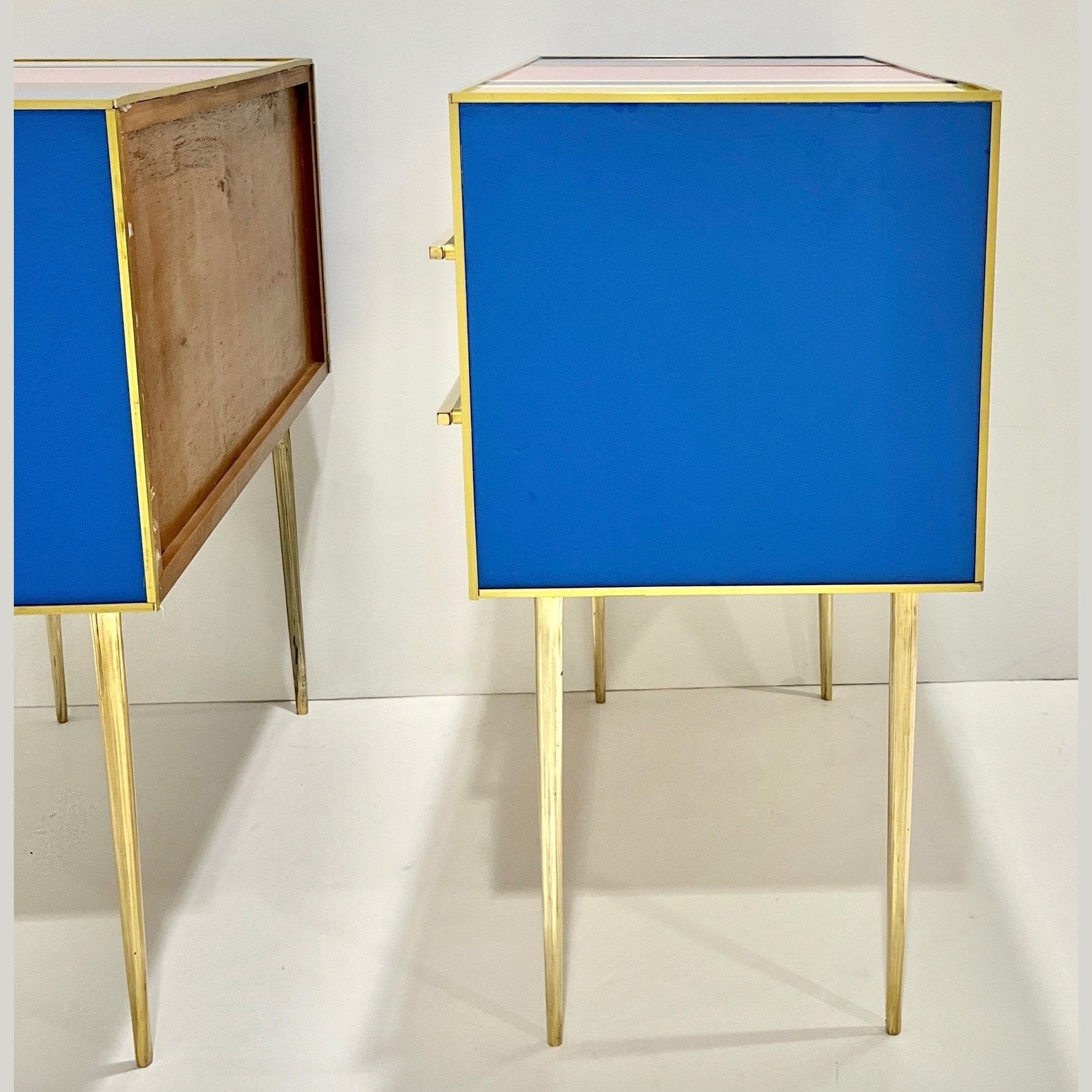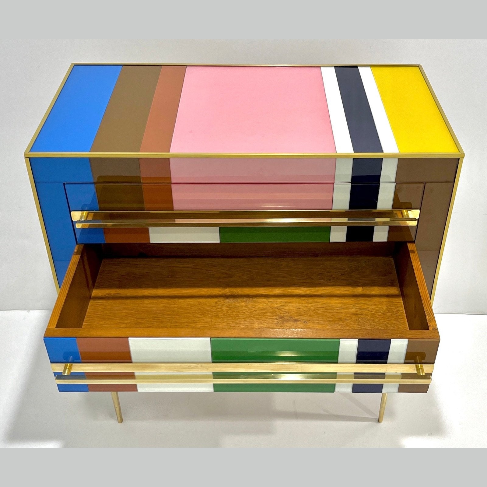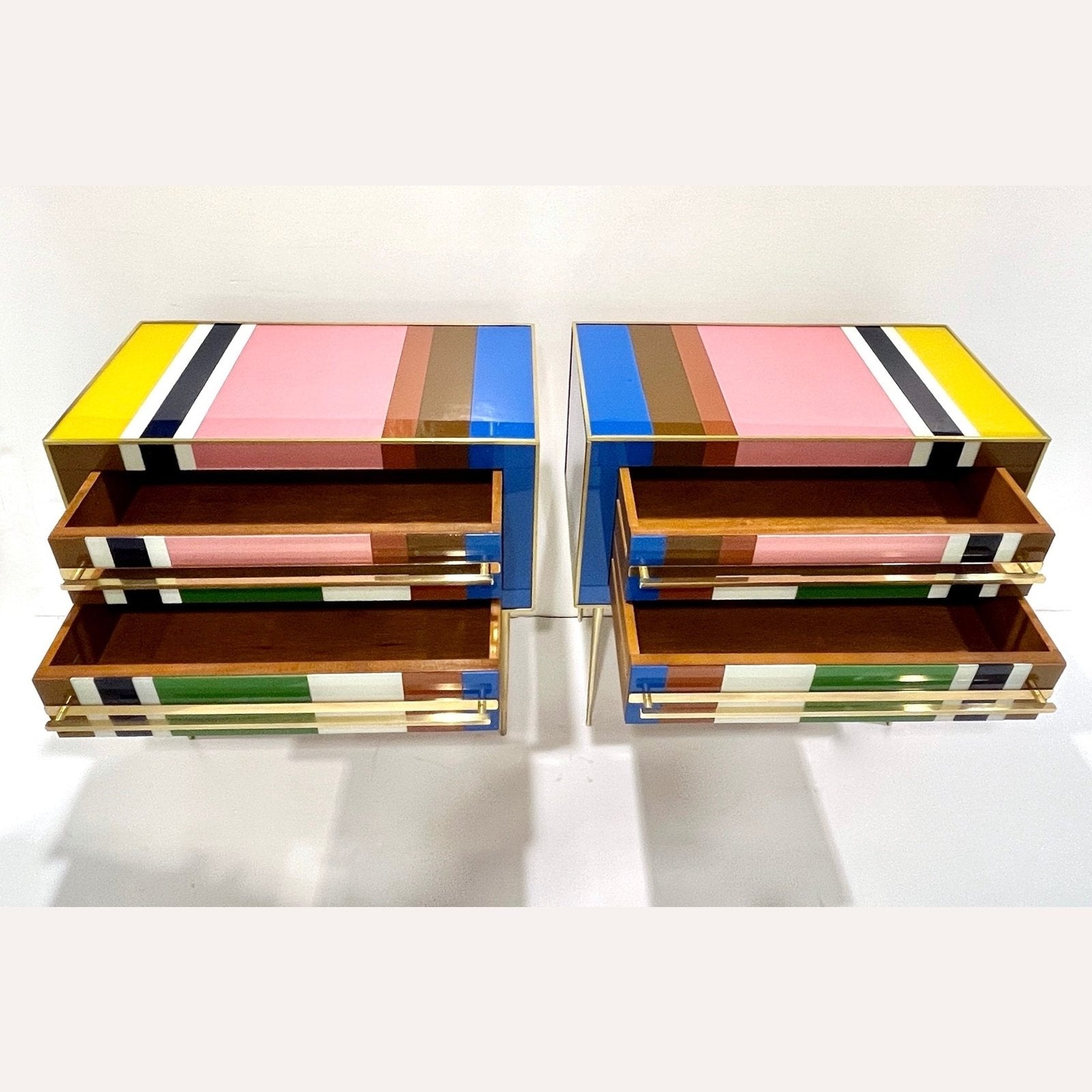 Early 2000s modern graphic pair of geometric Pop Art design two-drawer bedside tables / nightstands, entirely handcrafted in Italy, with a Piet Mondrian inspired abstract decor, the body with a surrounding edge in brass and the 2 drawers have an incased design framed in colored glass: navy blue, aquamarine, moss green, cream white, gold, taupe gray, ochre, pink. They are raised on sleek stiletto brass legs with fronts enhanced by Minimalist handmade straight handles in brass. Depth excluding protruding handles: 14.6 in