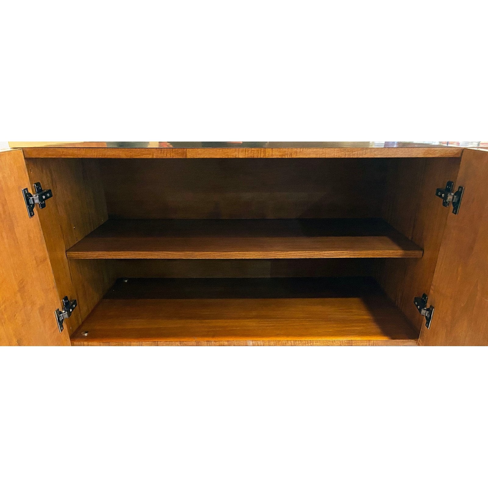 High quality of execution with great attention to detail: wood veneer interior with one shelf, the whole body and doors exquisitely edged with brass profiles.
