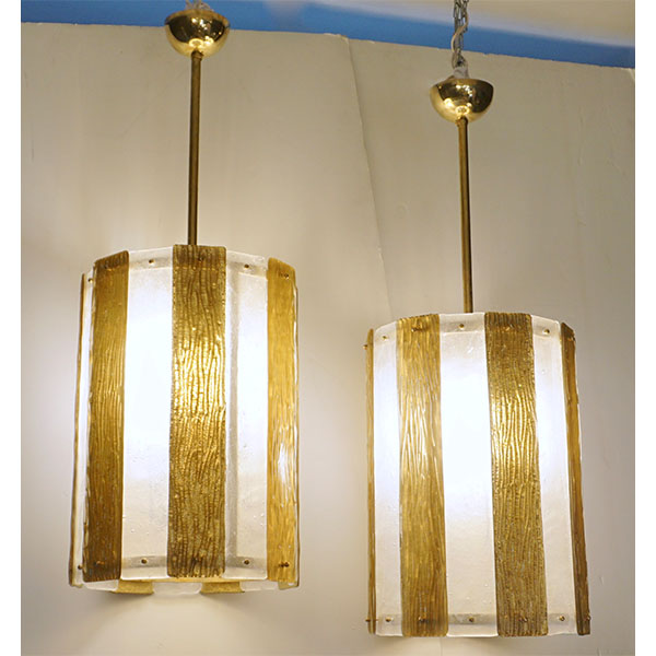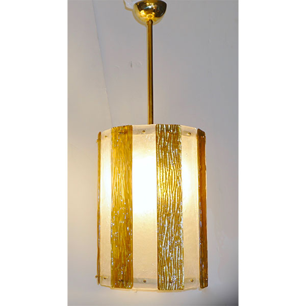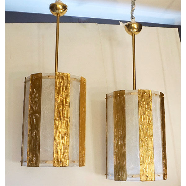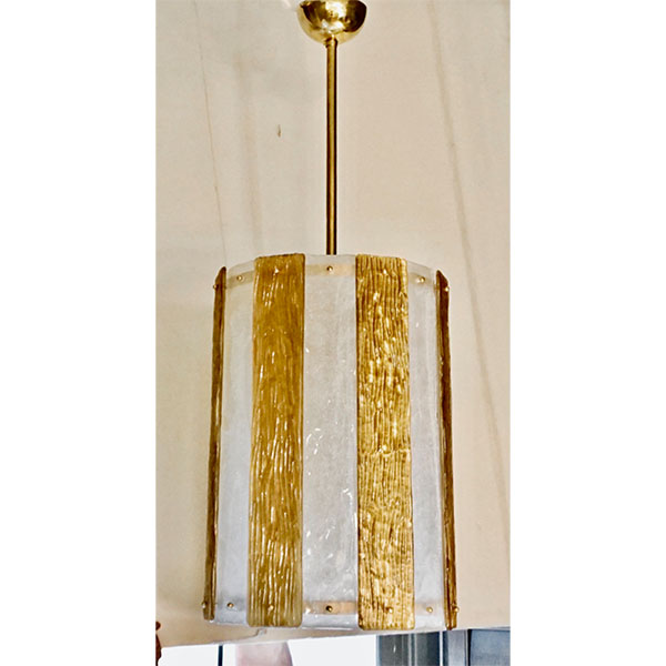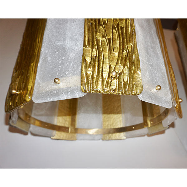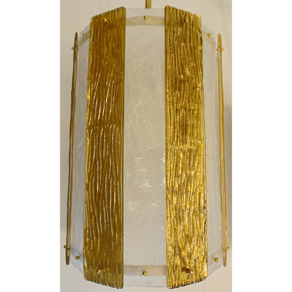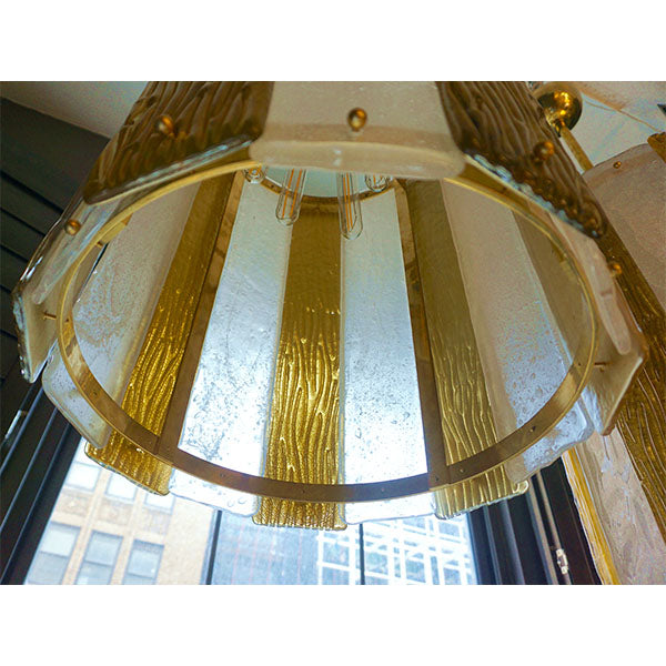A pair is available - Unique contemporary Italian Art Deco design round pendant chandelier, entirely handcrafted. This light fixture is composed of a handmade brass structure supporting alternating textured Murano glass bands, the frosted crystal ones in recess worked with bubbles in the glass and the amber decorated on reverse with pure gold leaf and with a wave pattern on the front, the textures create an interesting water illusion and undulation that multiplies the light reflections. Fitted with 6 standard Edison sockets.