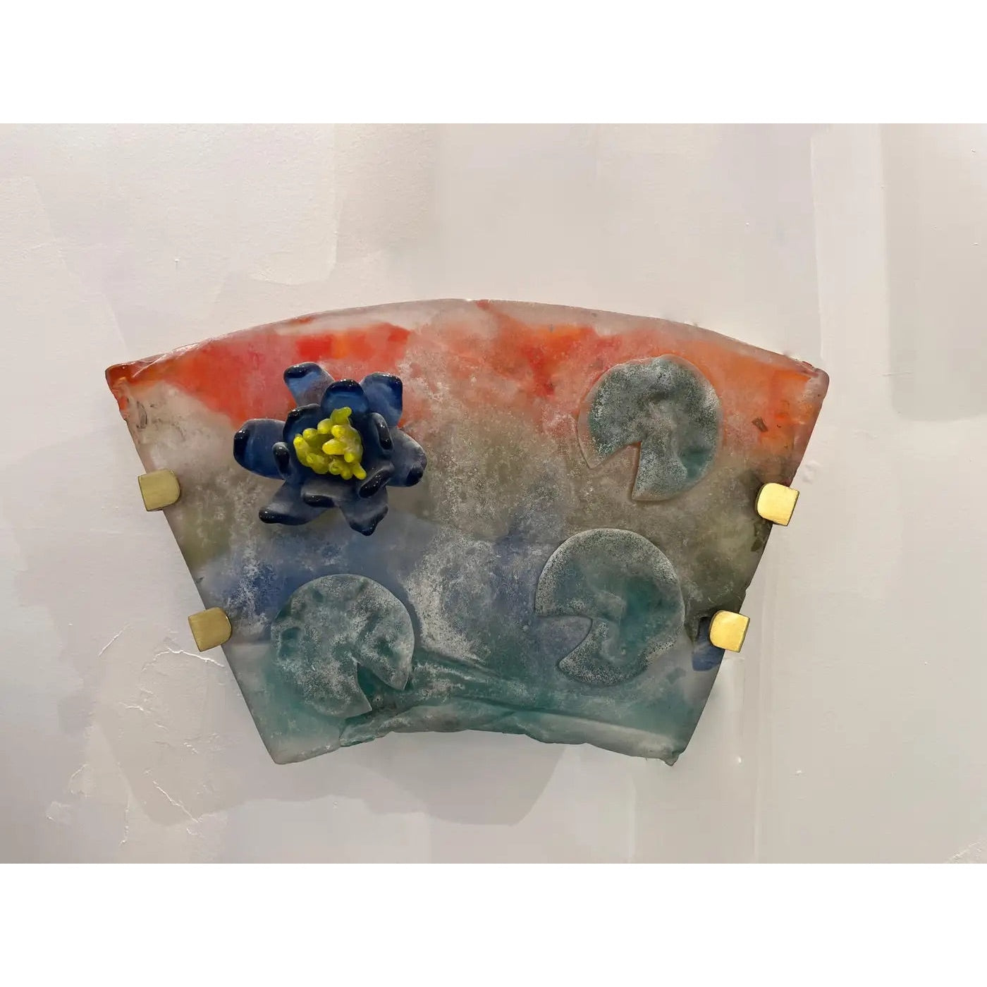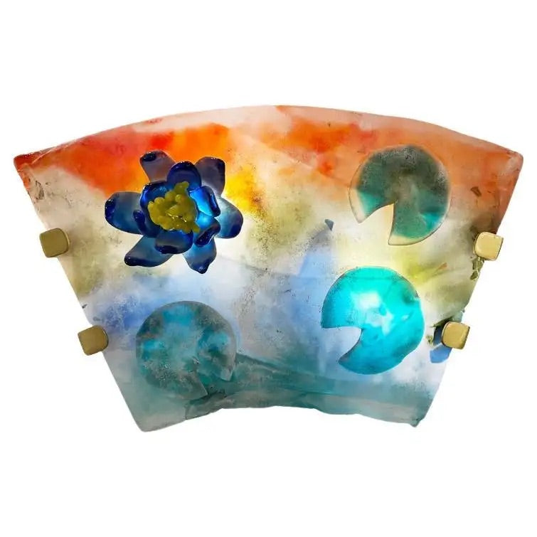 A very colorful and fun Art Deco design wall light by Cenedese, handcrafted in orange, yellow, blue and green very thick Murano glass (one inch) worked with the Scavo technique, the rich blown glass is textured to represent the waters of a lilypond with blue glass water lilies on a modern white metal structure. Extraordinary craftsmanship.