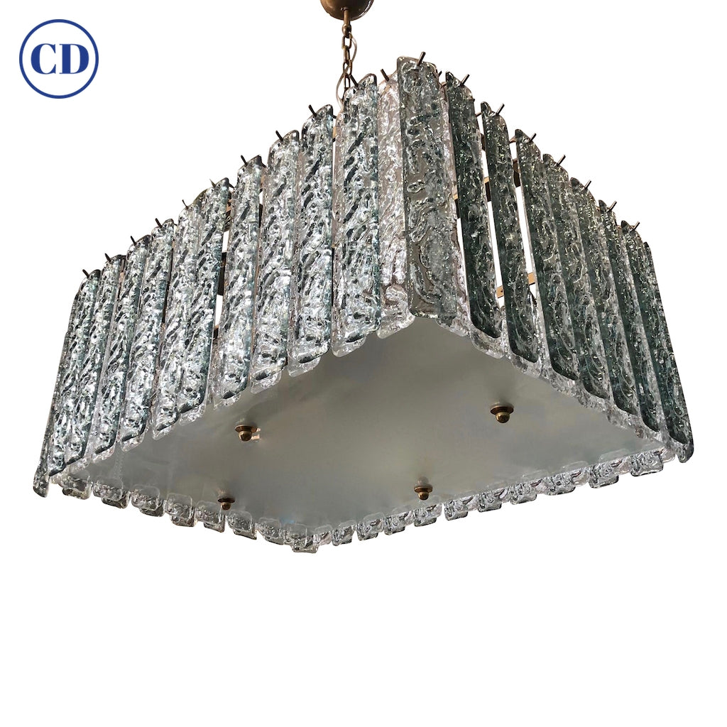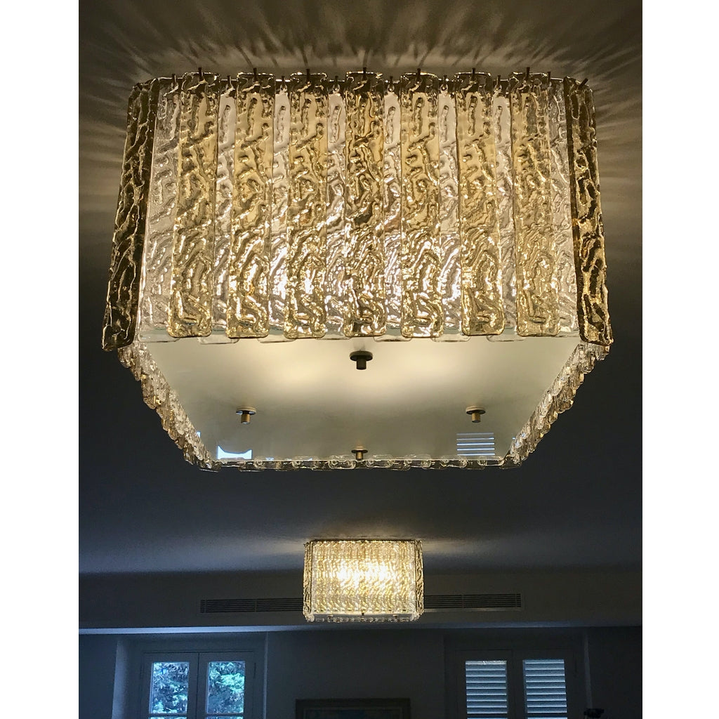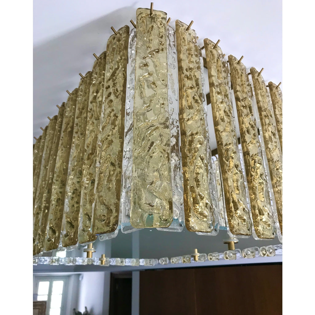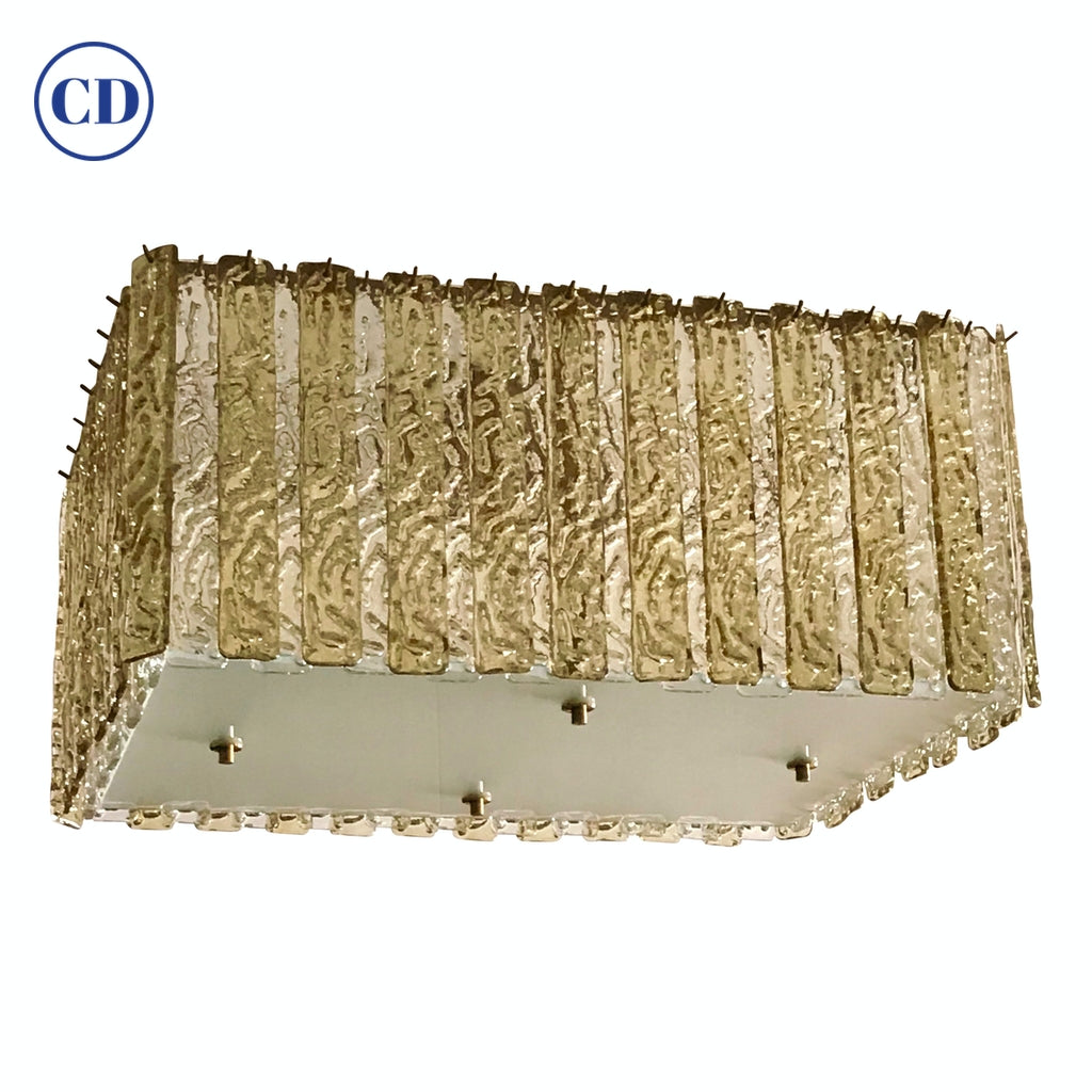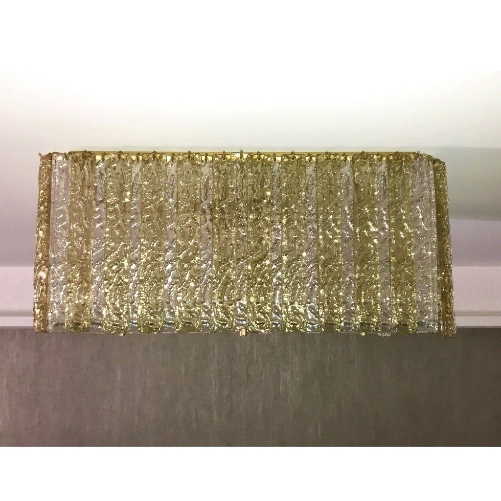 Bespoke Italian modern Art Deco design, entirely handcrafted in Italy, chandelier customizable as flush mounts or pendants, here with a brass structure in a geometric rectangular shape, highlighted by the decor of alternate plates in gold amber and crystal Murano Glass made precious by a wave handcrafted texture. The bottom is enclosed by frosted glass to diffuse the interior light. The elegance is accented by the two tones of the glass and the sensual undulated curvilinear pattern. Weight: approximately 110 lbs.