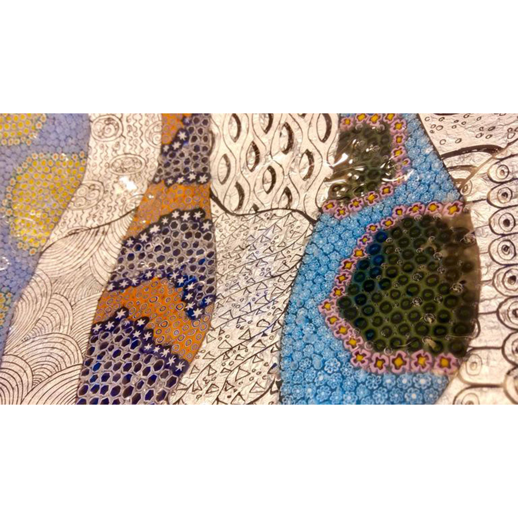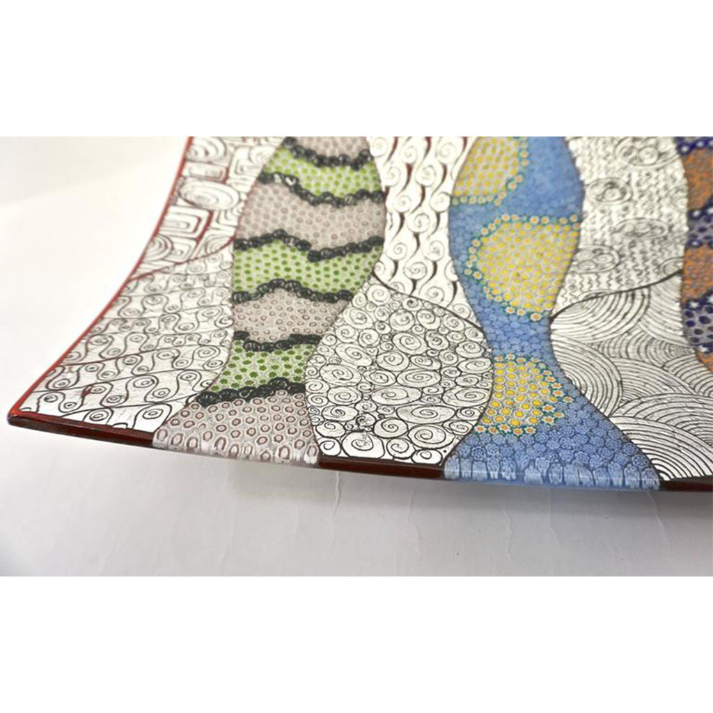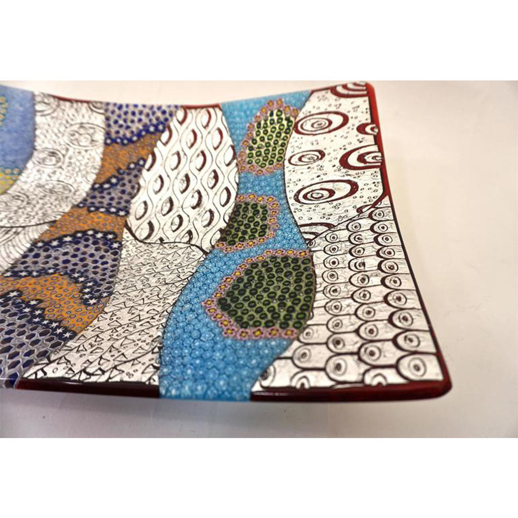 Contemporary art glass Mosaic centrepiece: high quality of execution with the mosaic of murrine (each little colored piece individually positioned by hand) showing through to the underside, making the reverse red glass layer just as precious. The symbolist pattern with a Gustav Klimt inspiration is elegantly enhanced by the use of pure silver leaf. These centrepieces, only custom-made, are individually handcrafted, therefore each is unique.