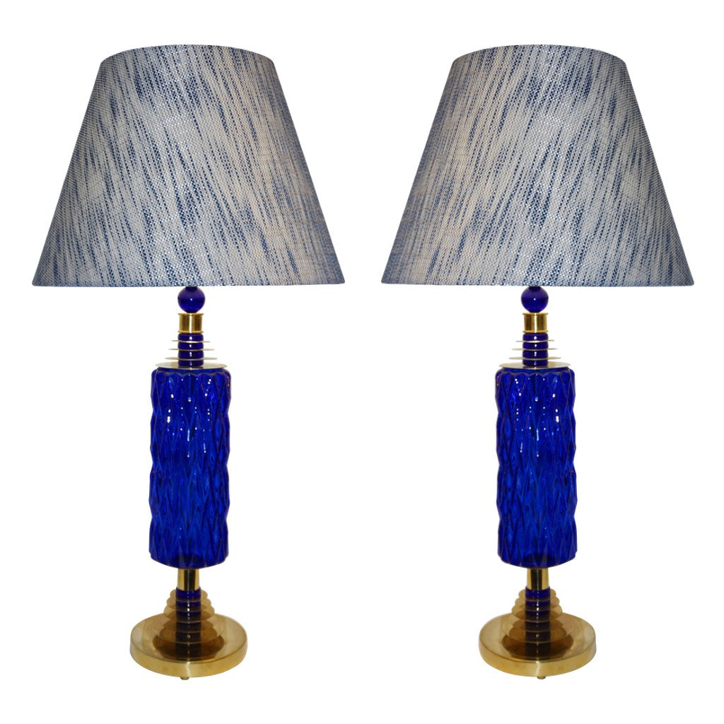 Contemporary Italian Pair of Brass and Cobalt Blue Murano Glass Table Lamps