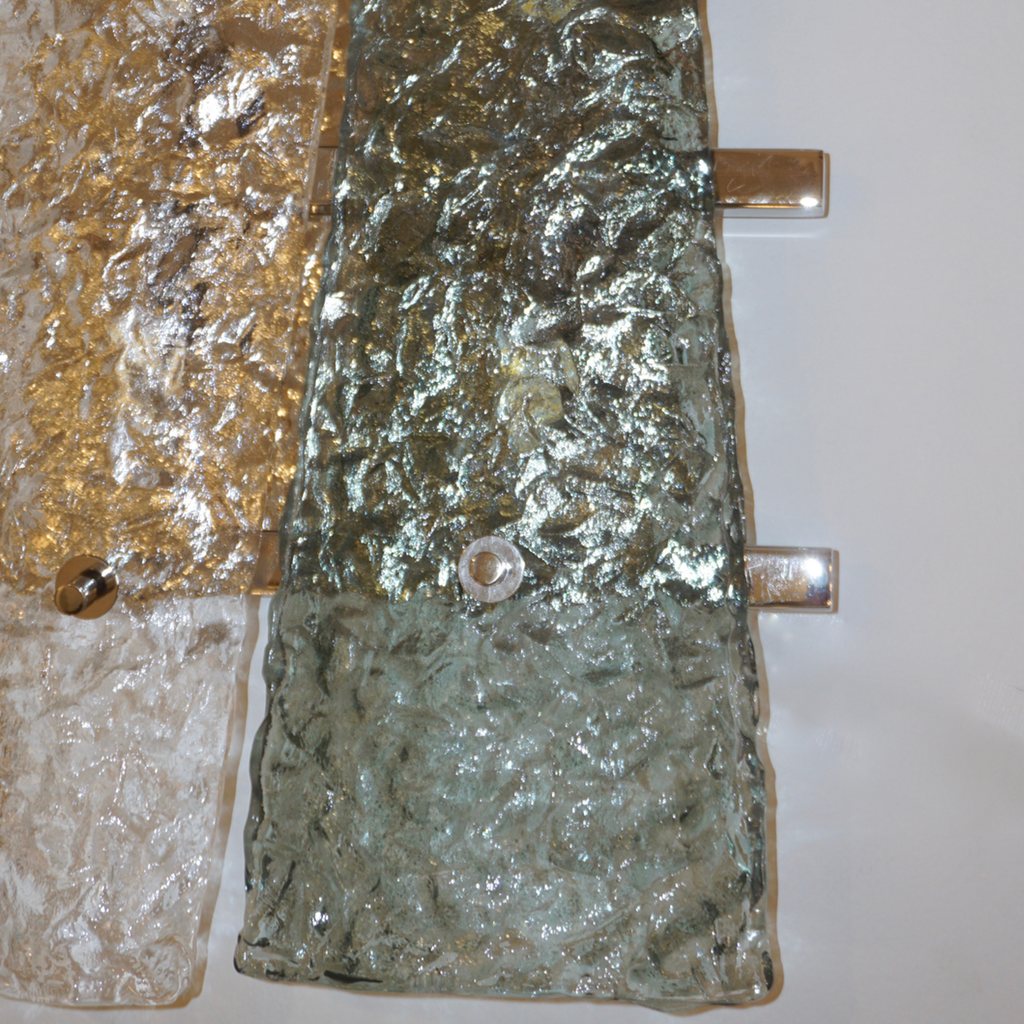 Italian pair of geometric wall lights, entirely handcrafted with urban design, the streamlined nickel backplate consisting of a series of 3 horizontal nickel bars supports 2 destructured triangular elements in crystal and aquamarine green Murano glass presenting a special texture that enhances the modernity of the design.