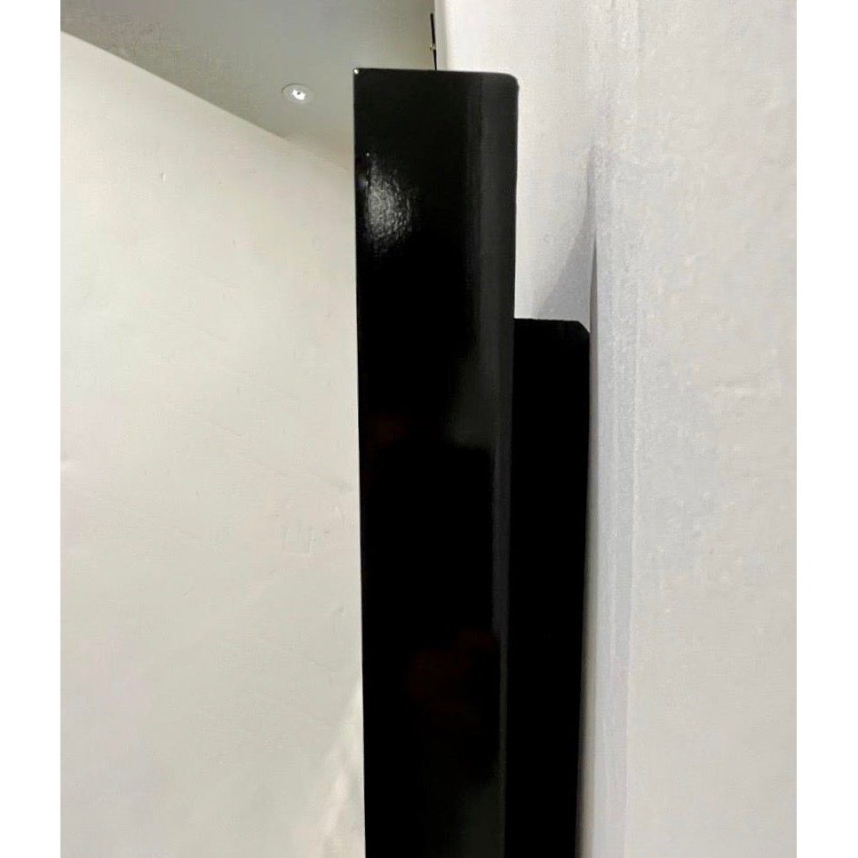 The black painted wood back support is doubled by a smaller panel that has the mirror stand off the wall to enhance the beauty of the piece.