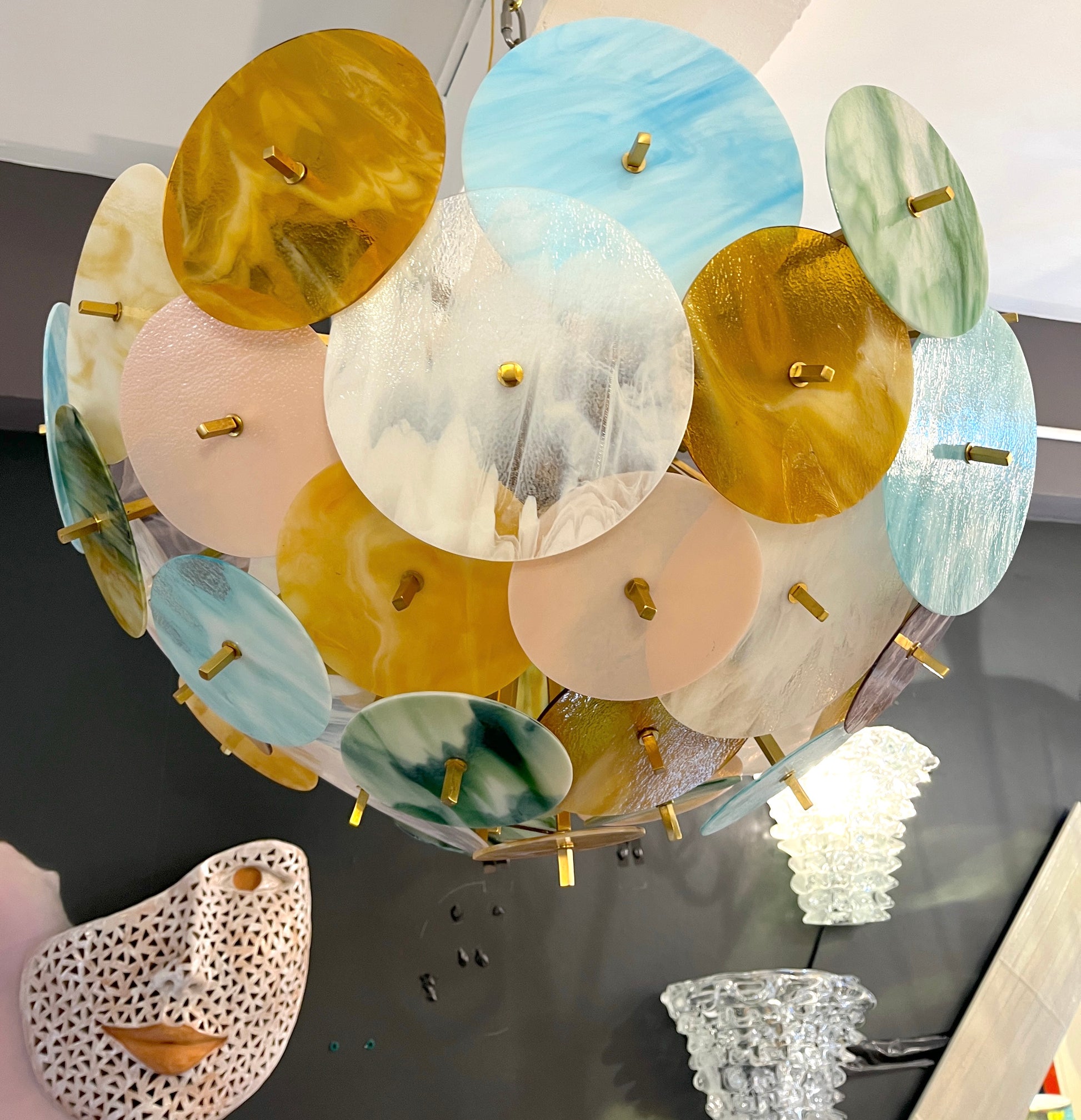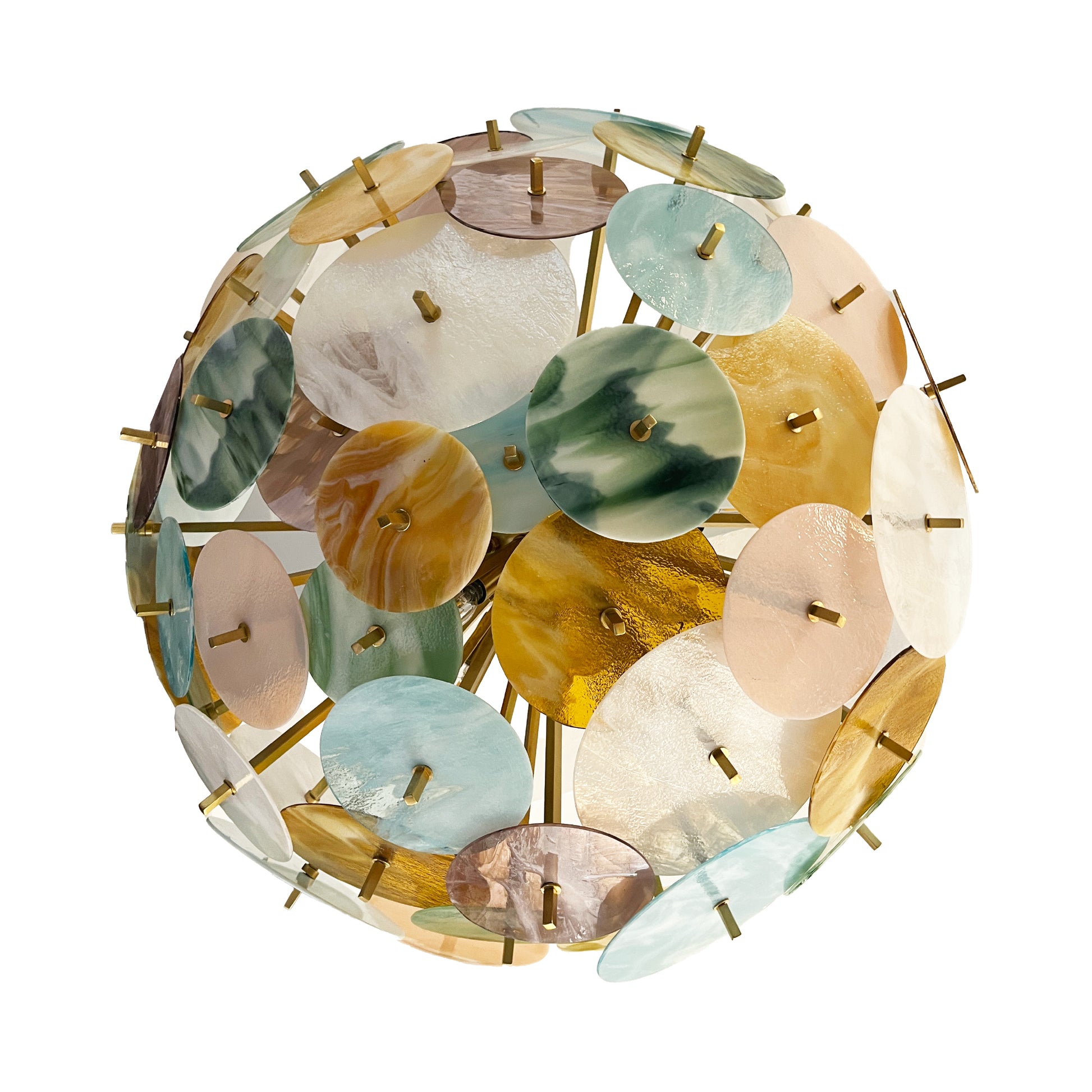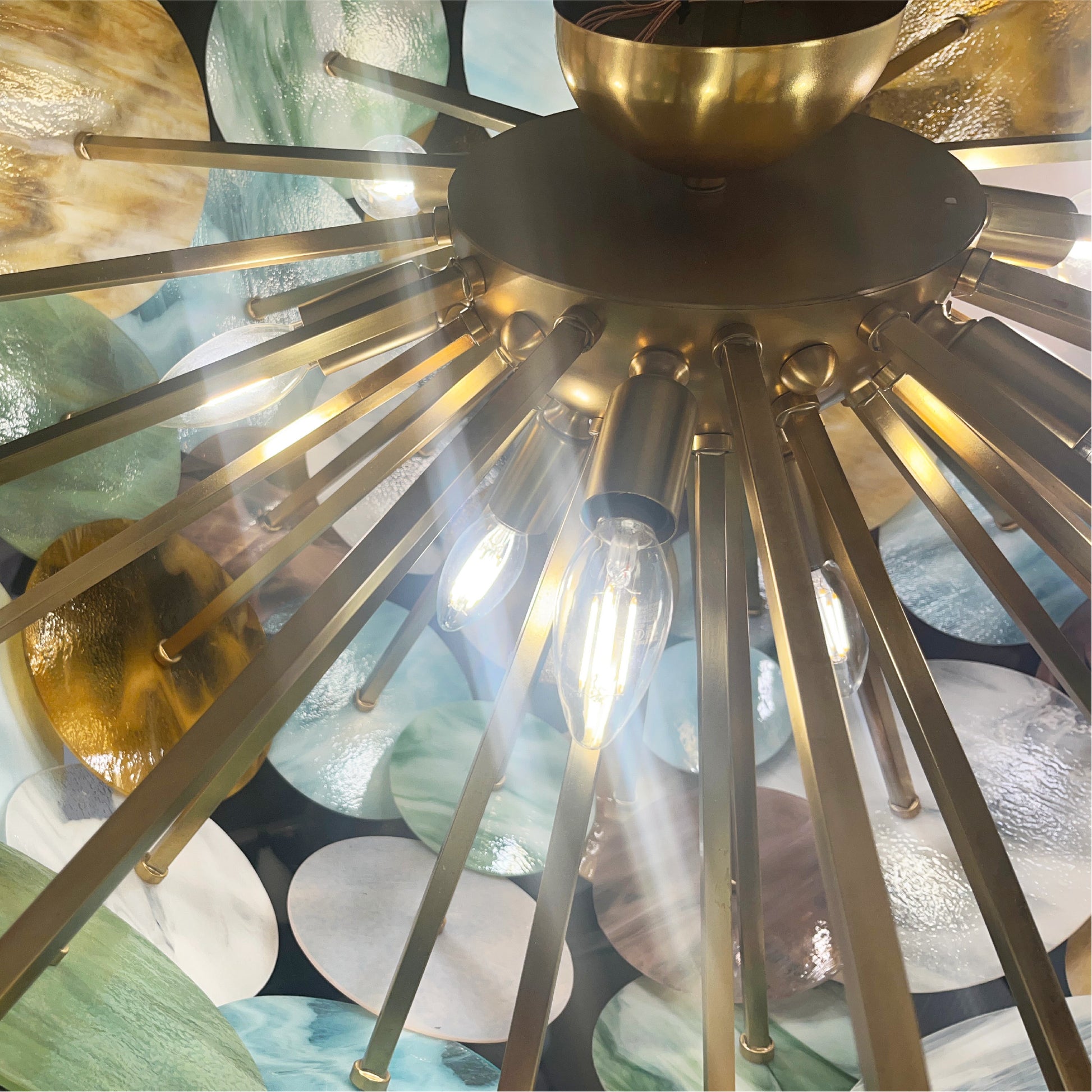 Contemporary Italian custom-made Sputnik chandelier / flush mount, entirely handcrafted, an enticing modern design. The brass structure, is composed of a central half-sphere supporting jutting out metal baguettes with an interesting square section, each decorated with blown Murano art glass disks worked with a very special iridescent texture, in different sophisticated pastel colors: variegated white, soft pink, aquamarine blue, seafoam green color, and golden amber yellow. The texture picks up reflections that create different shades of colors depending on the light source, highlighting the geometric design.