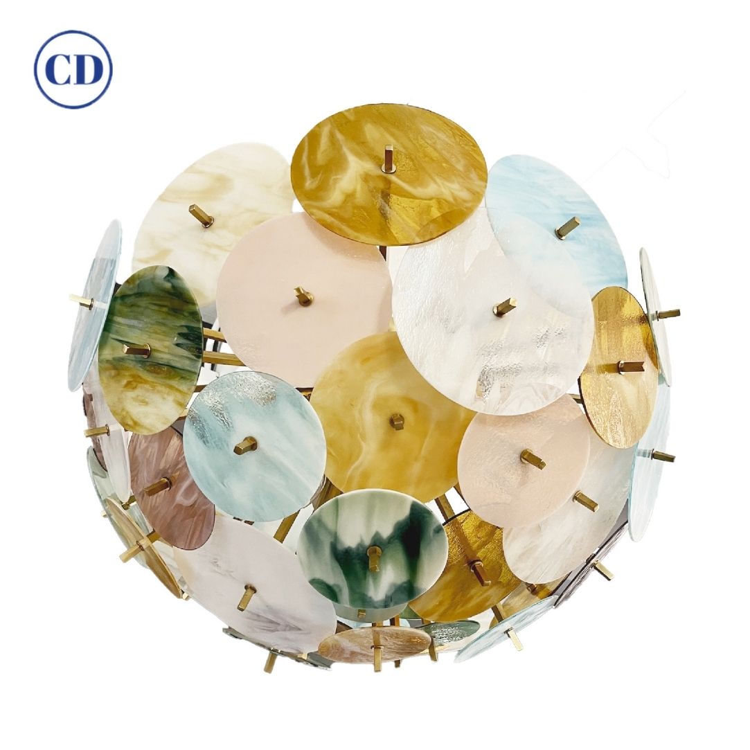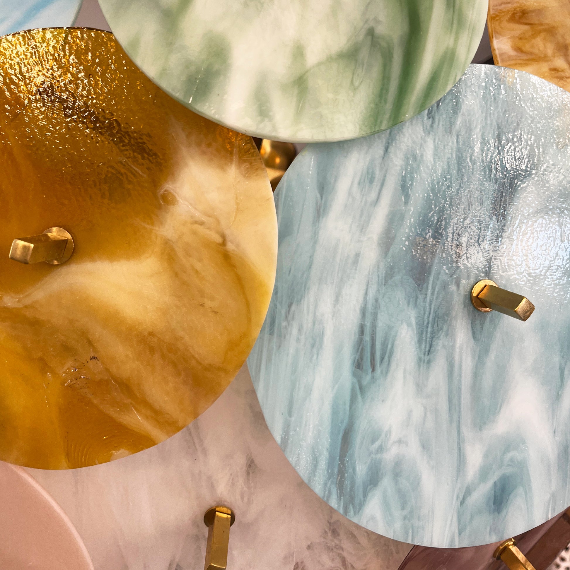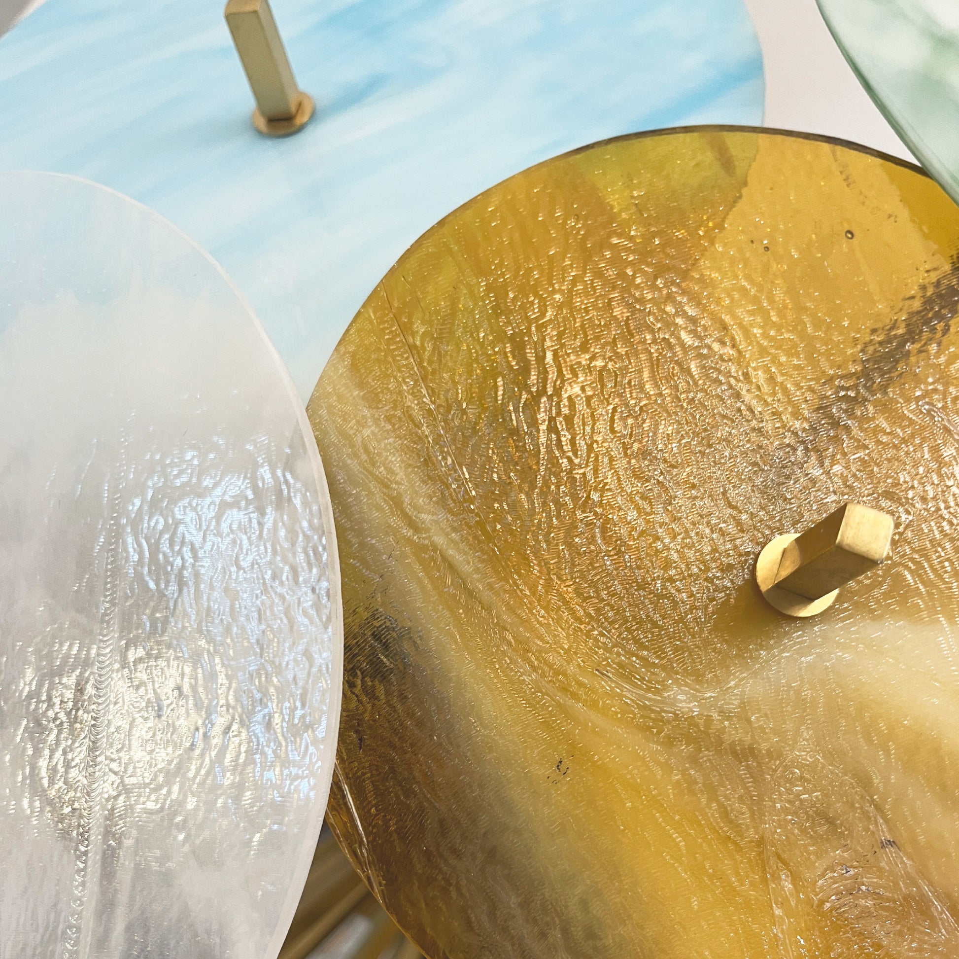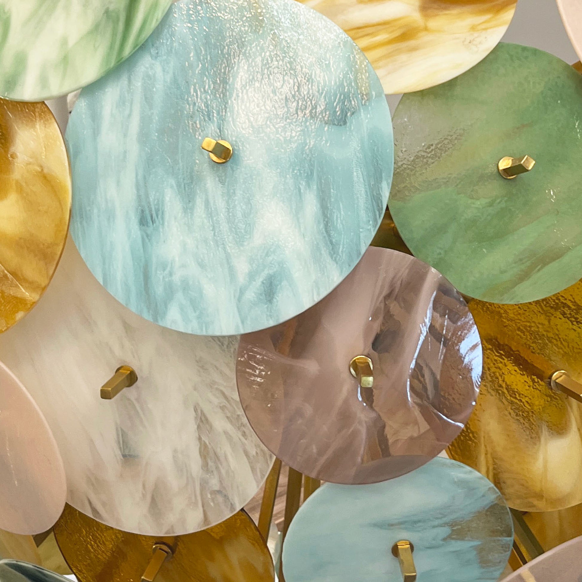 Contemporary Italian custom-made Sputnik chandelier / flush mount, entirely handcrafted, an enticing modern design. The brass structure, is composed of a central half-sphere supporting jutting out metal baguettes with an interesting square section, each decorated with blown Murano art glass disks worked with a very special iridescent texture, in different sophisticated pastel colors: variegated white, soft pink, aquamarine blue, seafoam green color, and golden amber yellow. The texture picks up reflections that create different shades of colors depending on the light source, highlighting the geometric design.