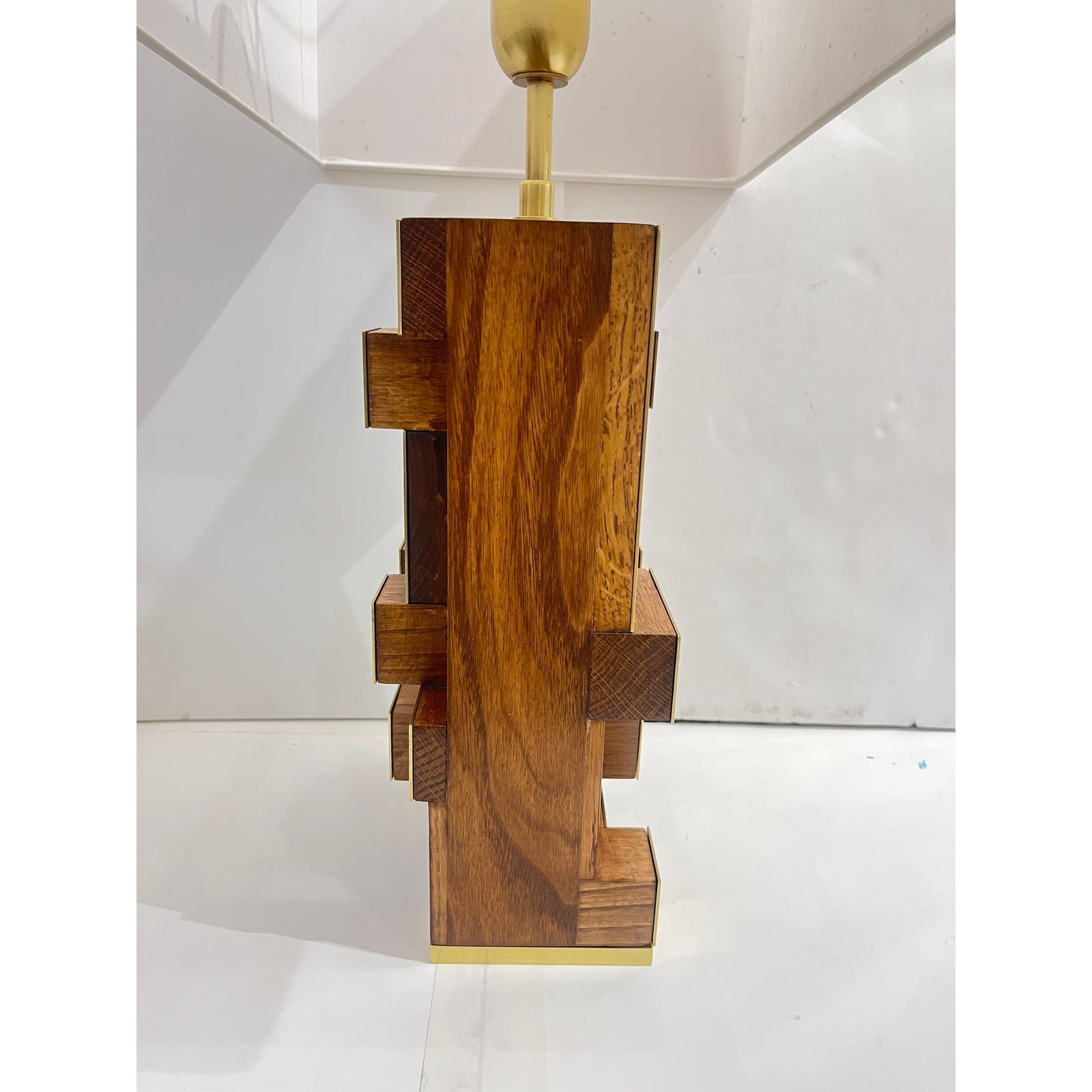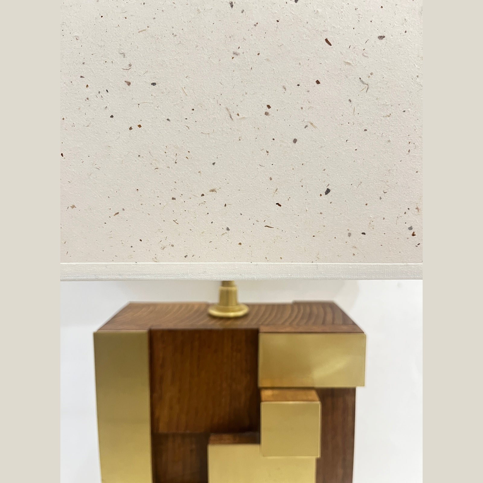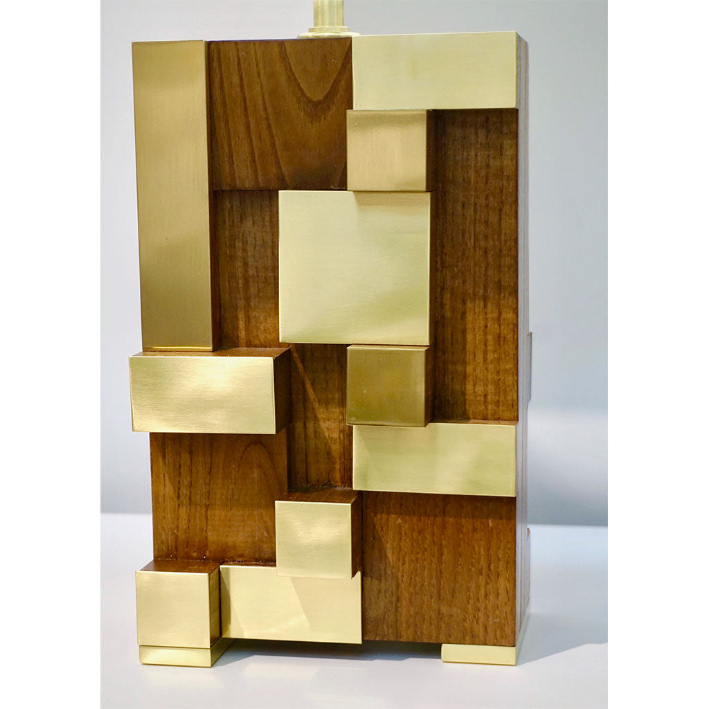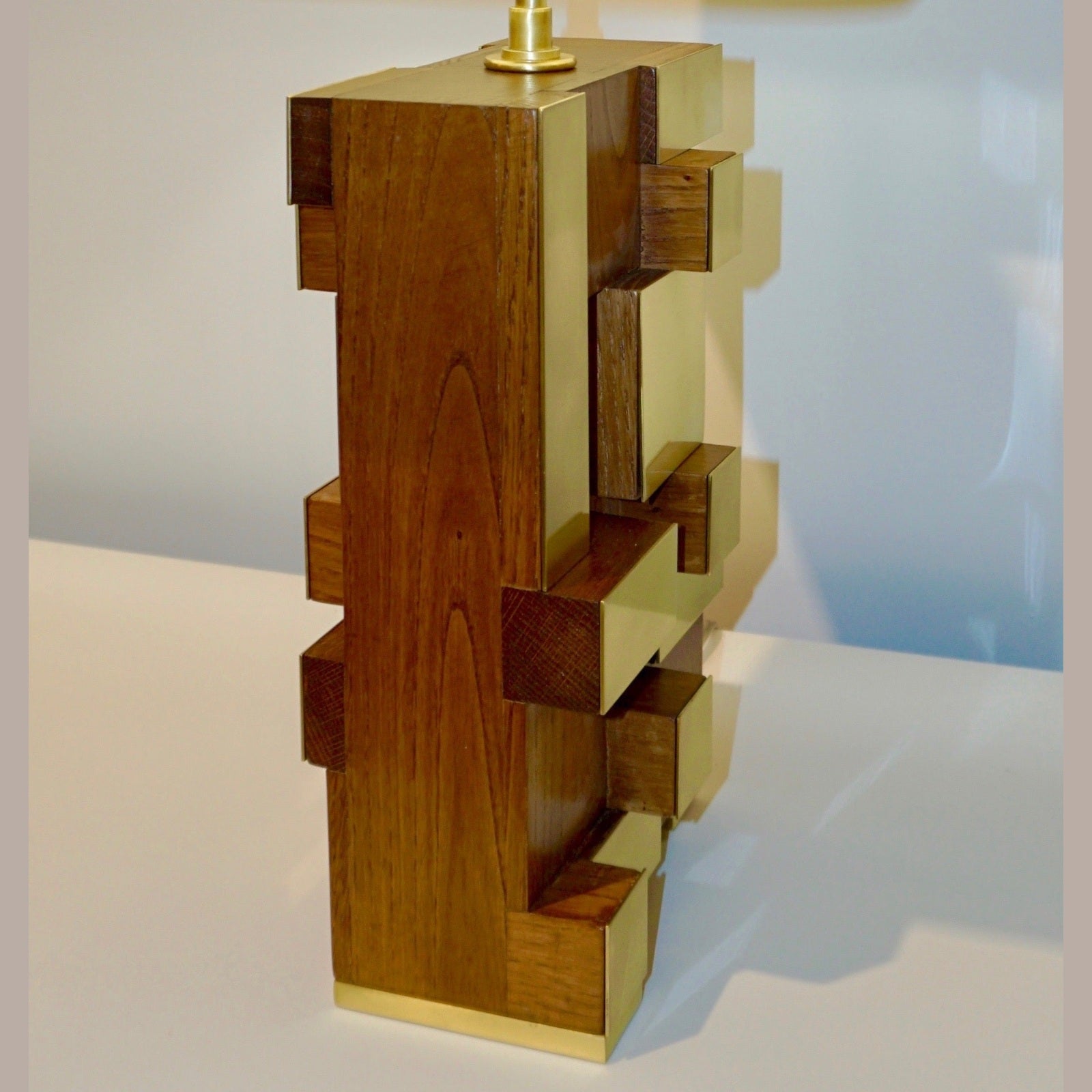 754PCA striking Italian Fine Design unique pair of bespoke Minimalist wood sculpture lamps, entirely handcrafted in Italy, masterfully designed in a minimalist yet bold aesthetic. Each piece is meticulously sculpted from premium walnut and accented with hand-applied brass sheet, showcasing a distinctive geometric design inspired by modern urban architecture. The stepped, three-dimensional facades on both sides, composed of brass-clad protruding blocks of varying depth, create a dynamic visual rhythm, while the lamps rest elegantly on dual brass-covered feet. A refined statement of contemporary luxury and artisanal craftsmanship, these lamps are a rare fusion of form, function, and fine design.