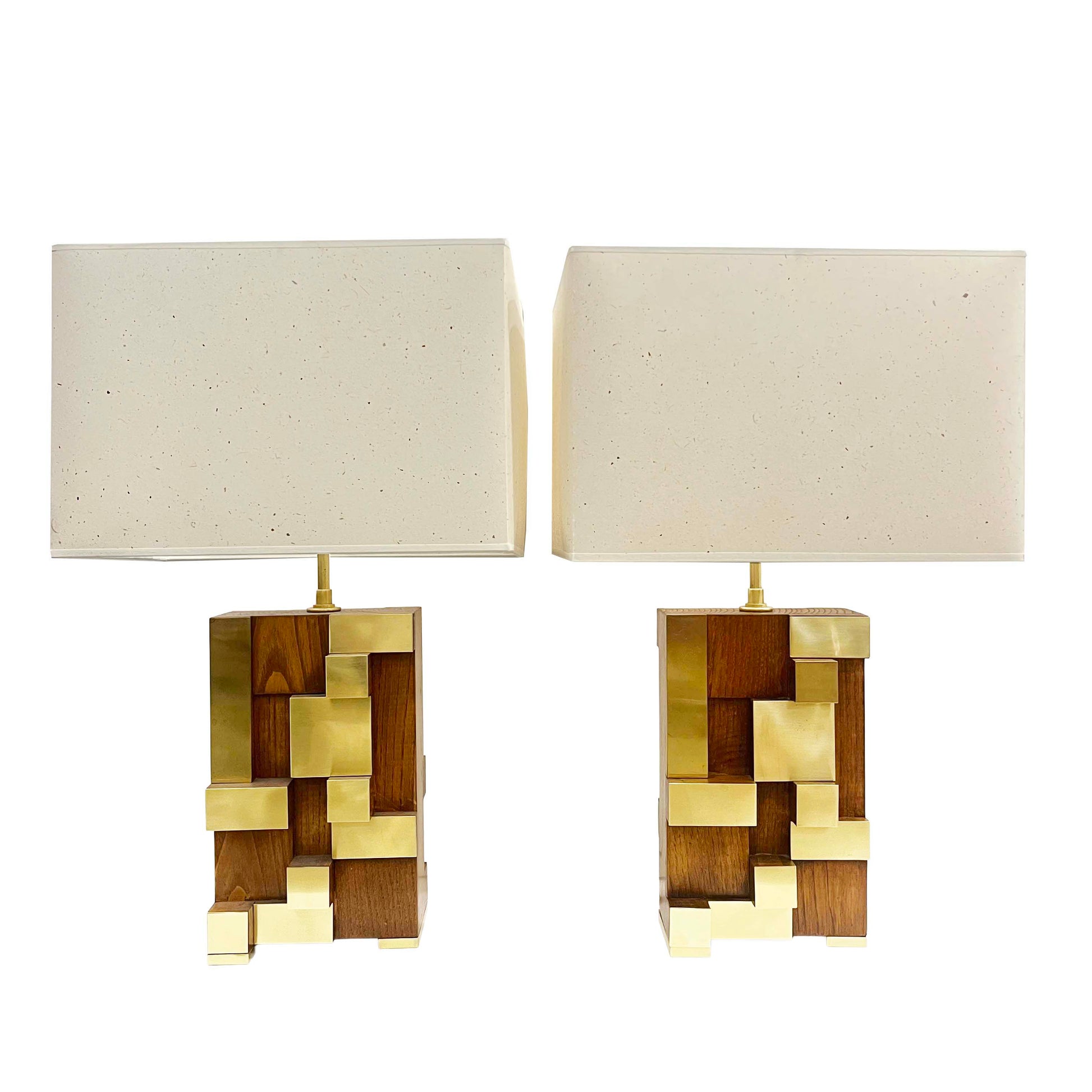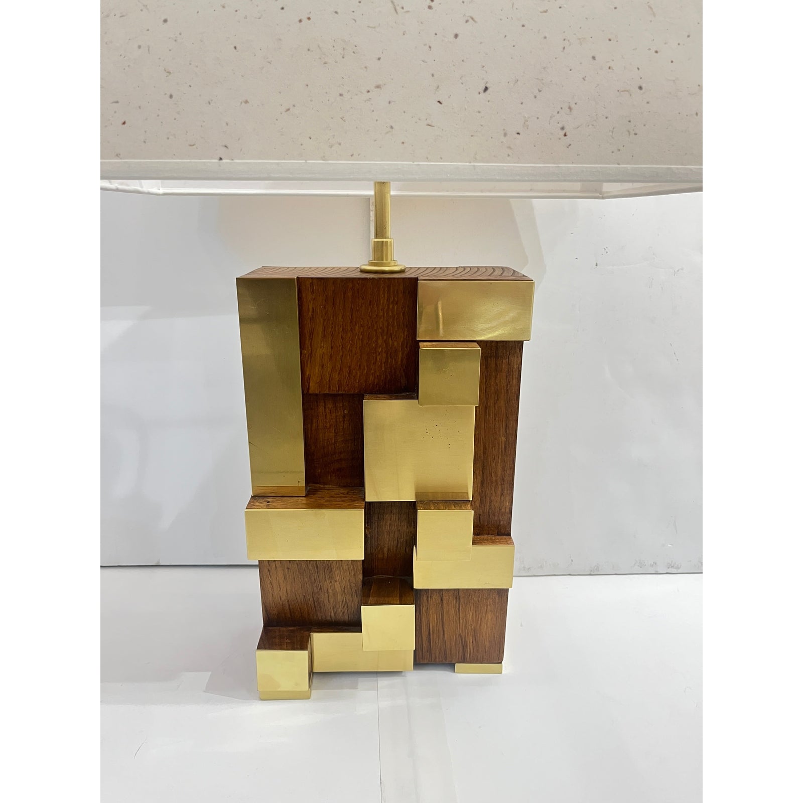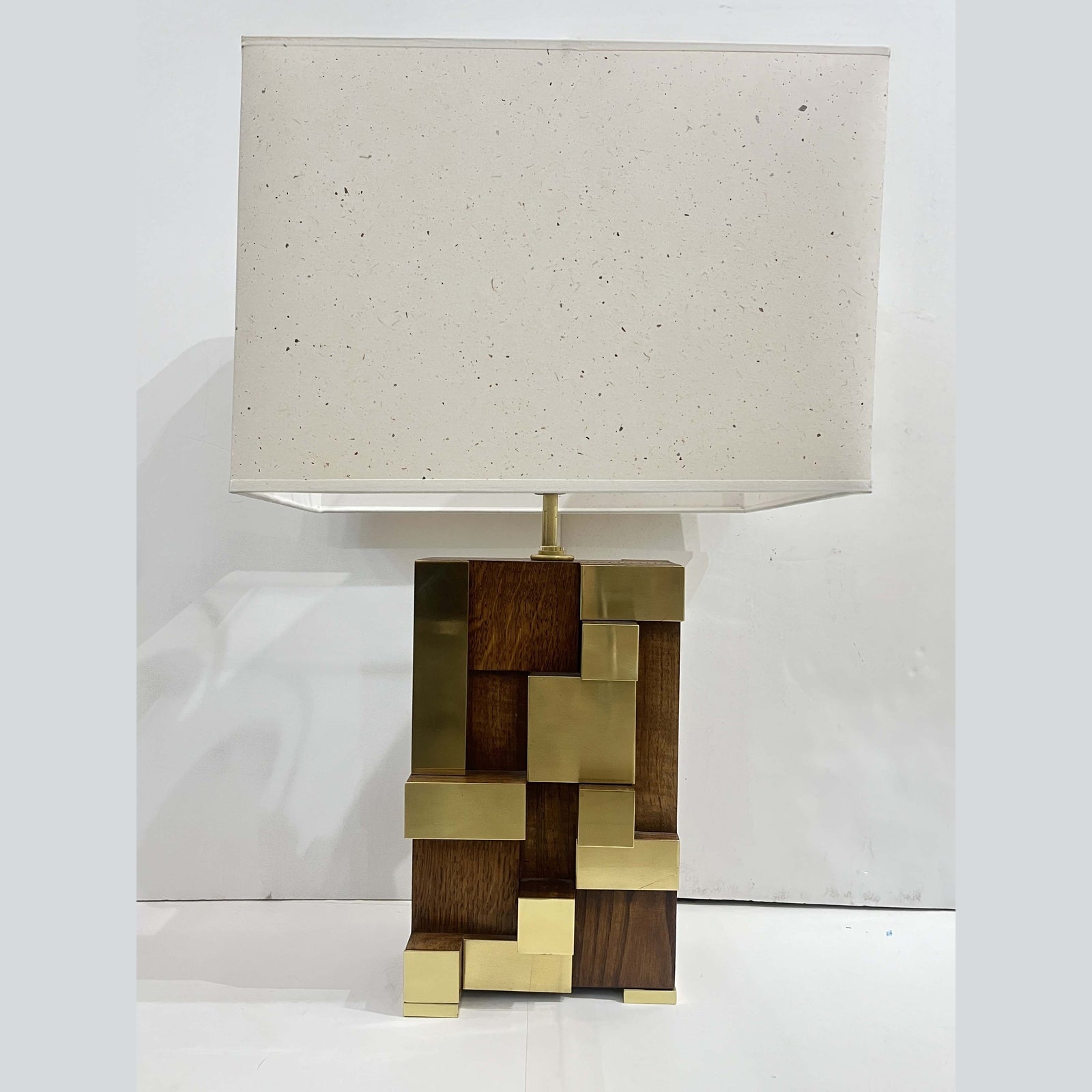 754PCA striking Italian Fine Design unique pair of bespoke Minimalist wood sculpture lamps, entirely handcrafted in Italy, masterfully designed in a minimalist yet bold aesthetic. Each piece is meticulously sculpted from premium walnut and accented with hand-applied brass sheet, showcasing a distinctive geometric design inspired by modern urban architecture. The stepped, three-dimensional facades on both sides, composed of brass-clad protruding blocks of varying depth, create a dynamic visual rhythm, while the lamps rest elegantly on dual brass-covered feet. A refined statement of contemporary luxury and artisanal craftsmanship, these lamps are a rare fusion of form, function, and fine design.