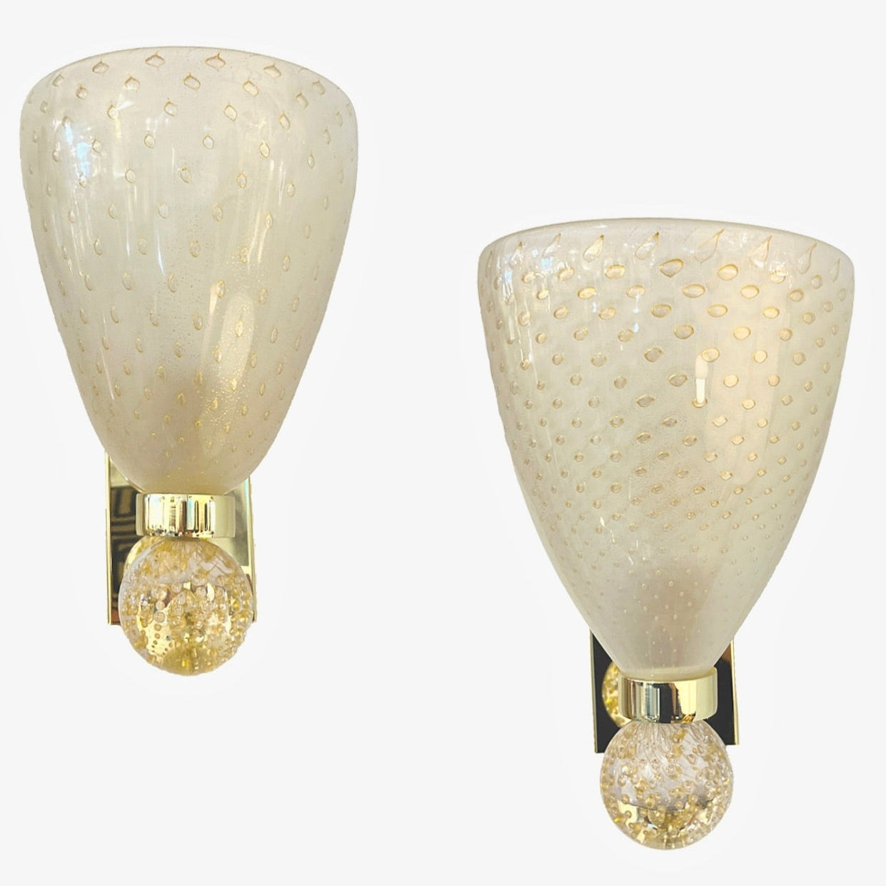 Available Now - Contemporary Venetian pair of Art Deco wall lights of modern organic design, entirely handcrafted in Murano (Italy), the bowls in high-quality crystal blown Murano glass, in Barovier style, are decorated with the Pulegoso technique: big bubbles in the glass and worked with pure 24-karat gold inclusions. They are supported by handmade gold polished brass arms and decorated with a perfectly round ball finial. The openings of these sconces skillfully curved are slightly different due to the blowing technique and the individual craftsmanship.High quality of execution with a frosted interior that shades while irradiates the light source and adds a sophisticated touch to this fixture.