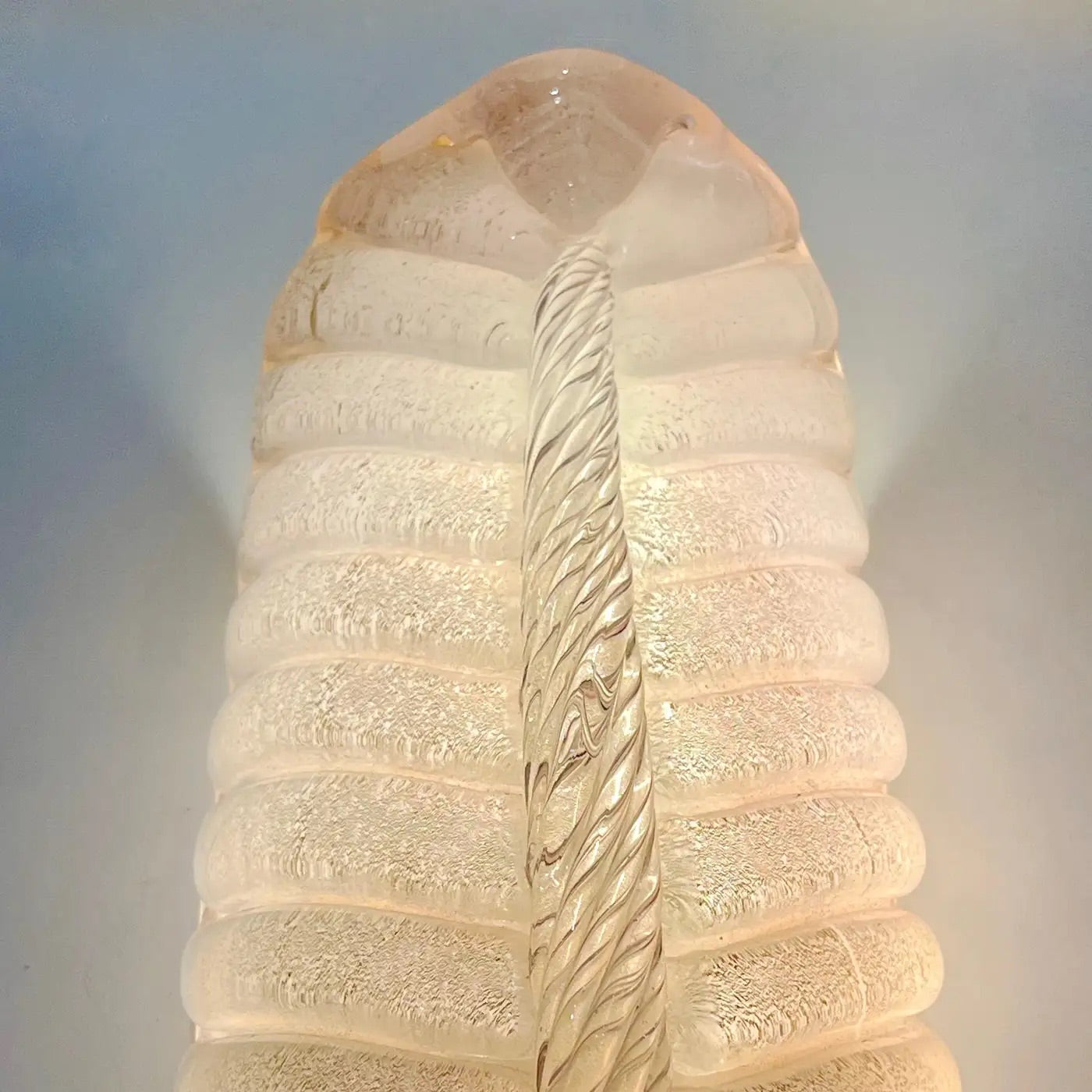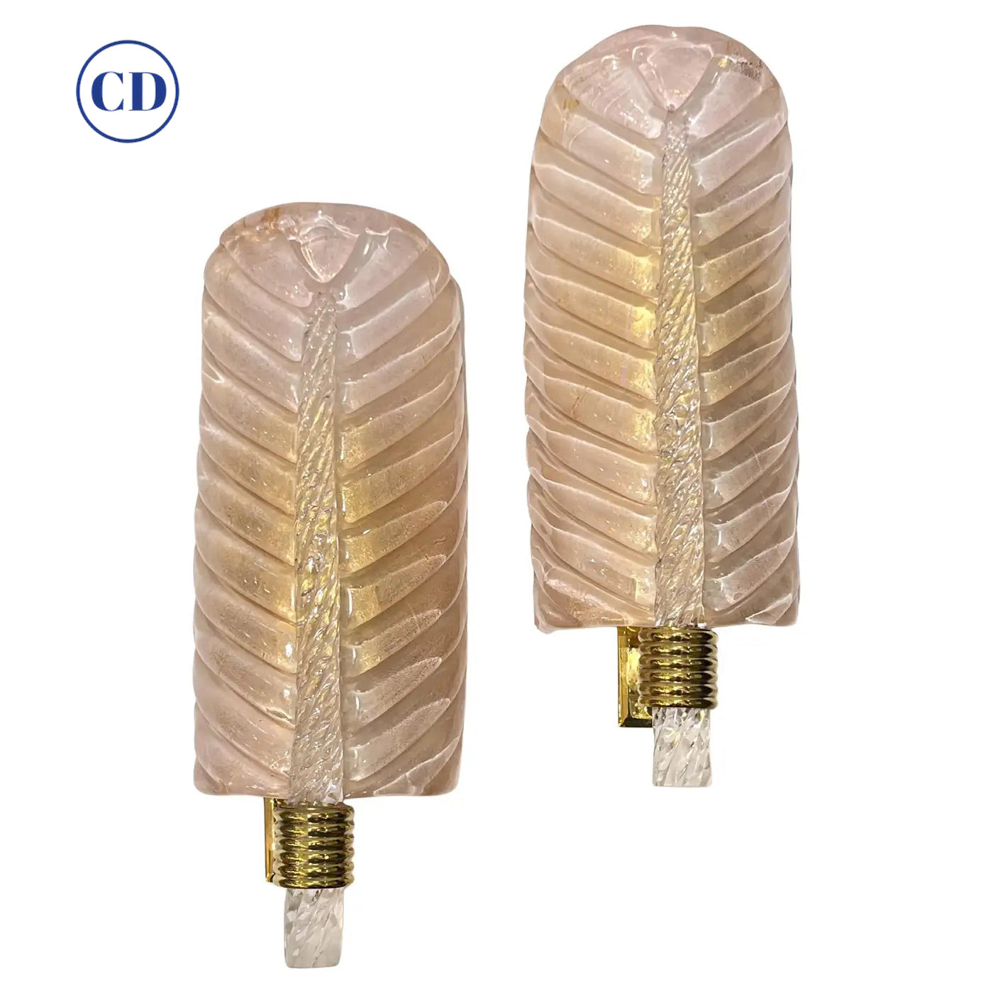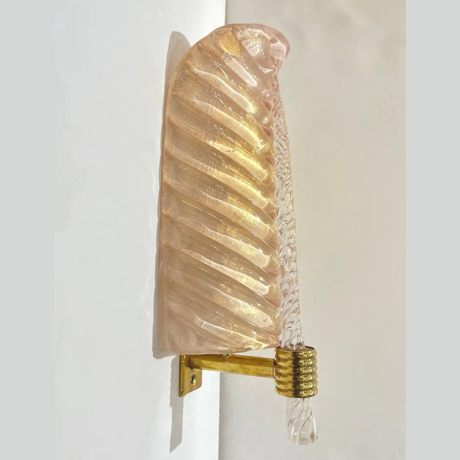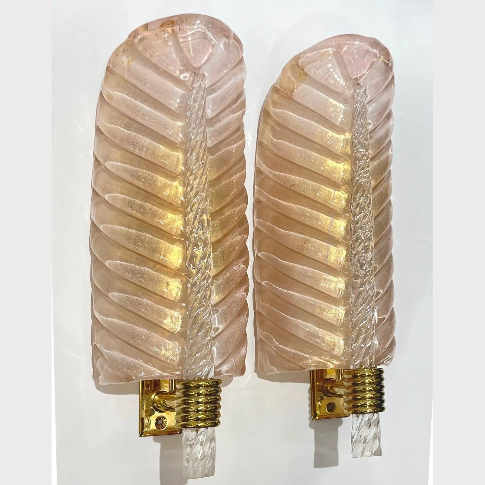 Exquisite pair of bespoke wall lights in blown Murano glass in the style of Barovier, with an organic Art Deco design feather leaf curved shape. Entirely handcrafted in Italy, the high-quality Murano glass has a blush pink pearl luminosity given by the the decor of pure gold dust in the tinted glass. The stem in clear Murano glass is further accentuated in gold tones. The shape has a realistic leaf vein and central stem, on a hand-made polished brass support.
