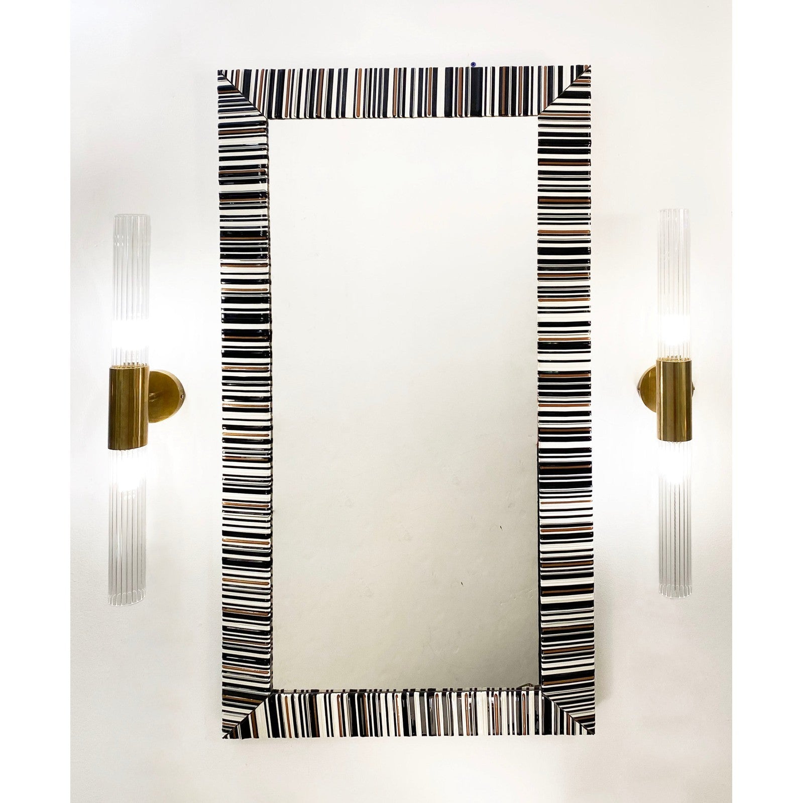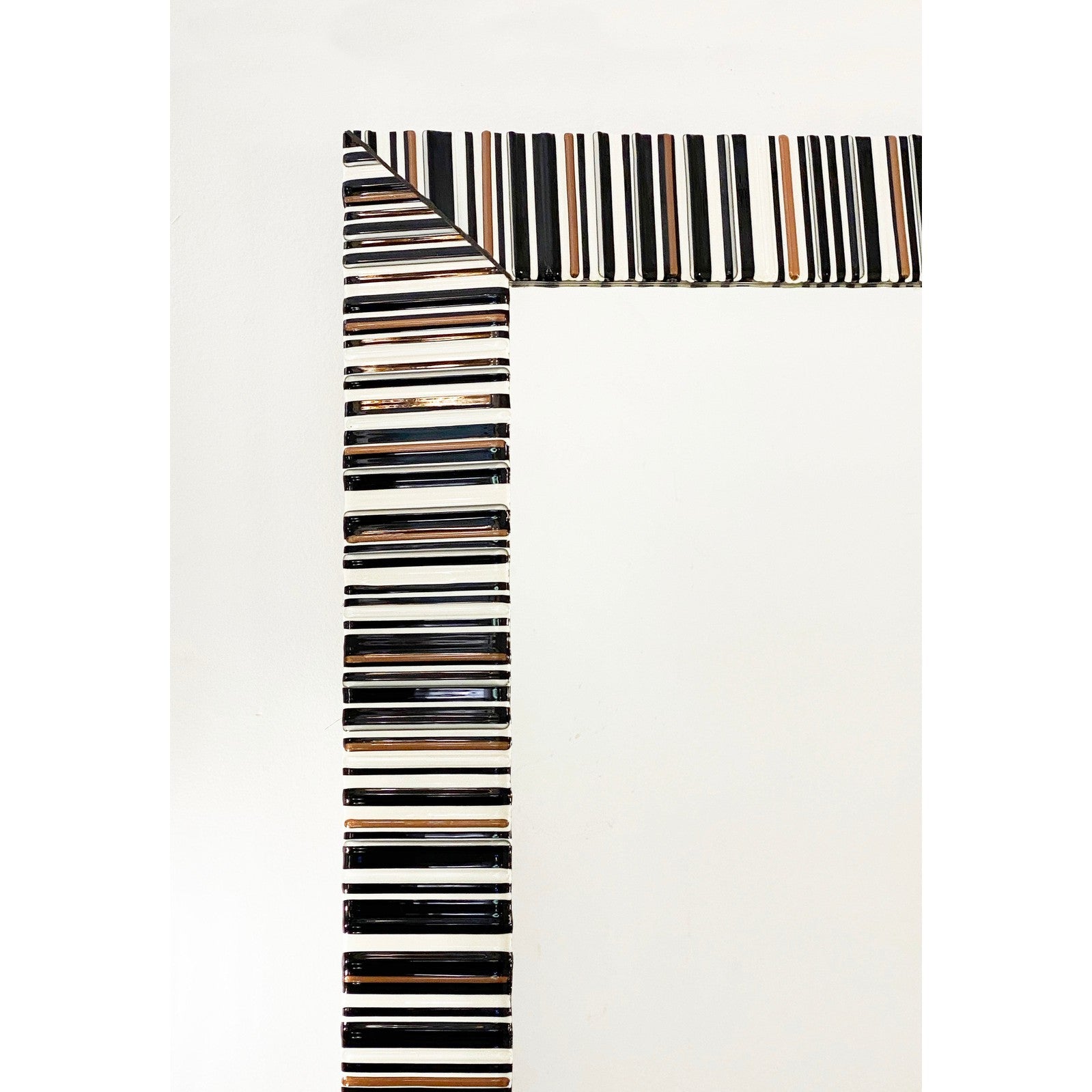 A contemporary Murano glass creation, this rectangular wall mirror is entirely handcrafted with the fusion technique in 3 glass colors: black, white, and aventurine (a difficult technique where real copper metal is mixed in the glass). Each bar is individually molded and cut separately, then assembled by hand one after the other in a geometric organic pattern, like a mosaic, that is then fused at high temperature to complete the frame. The plywood support is hand-painted in white.