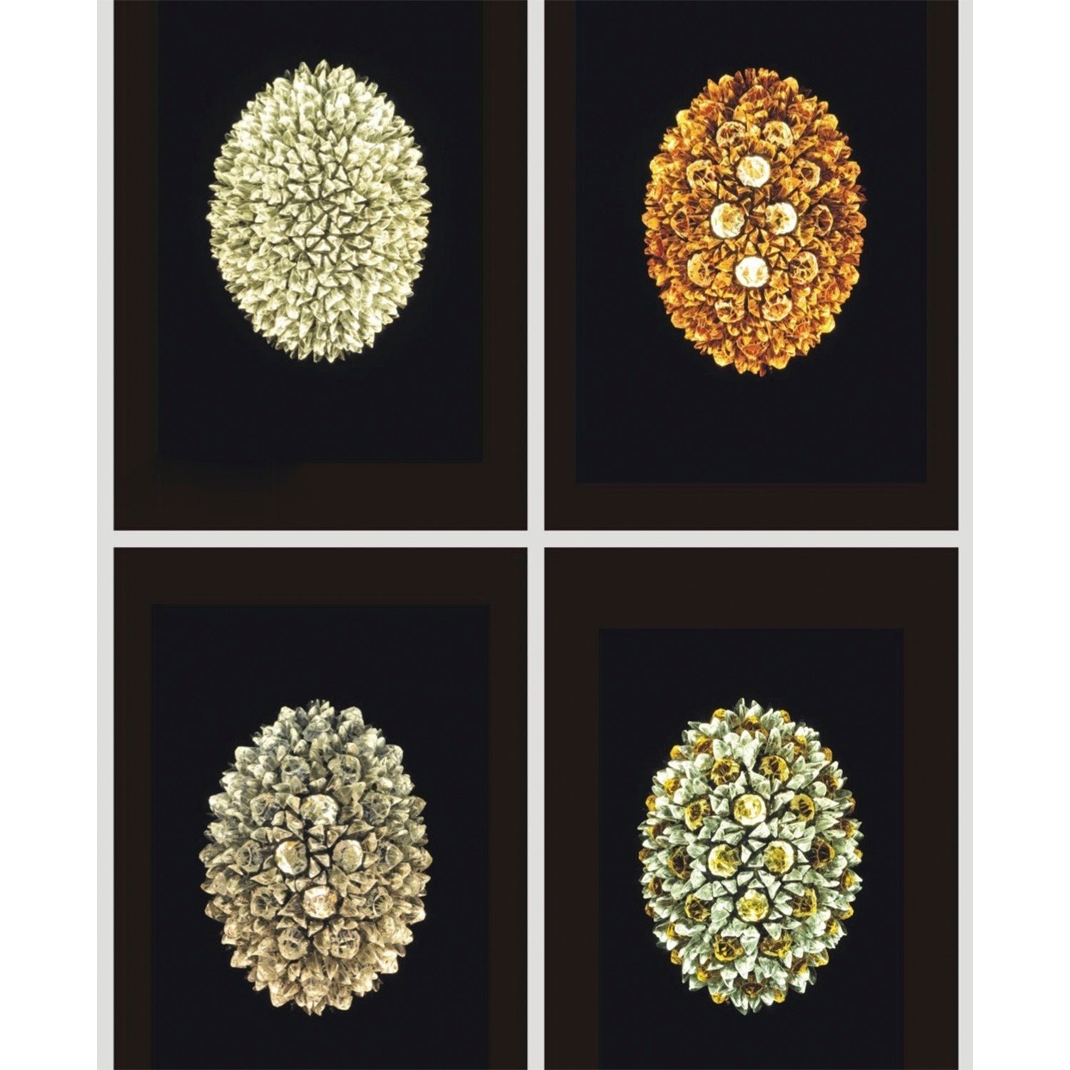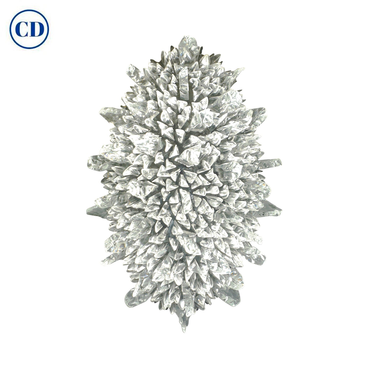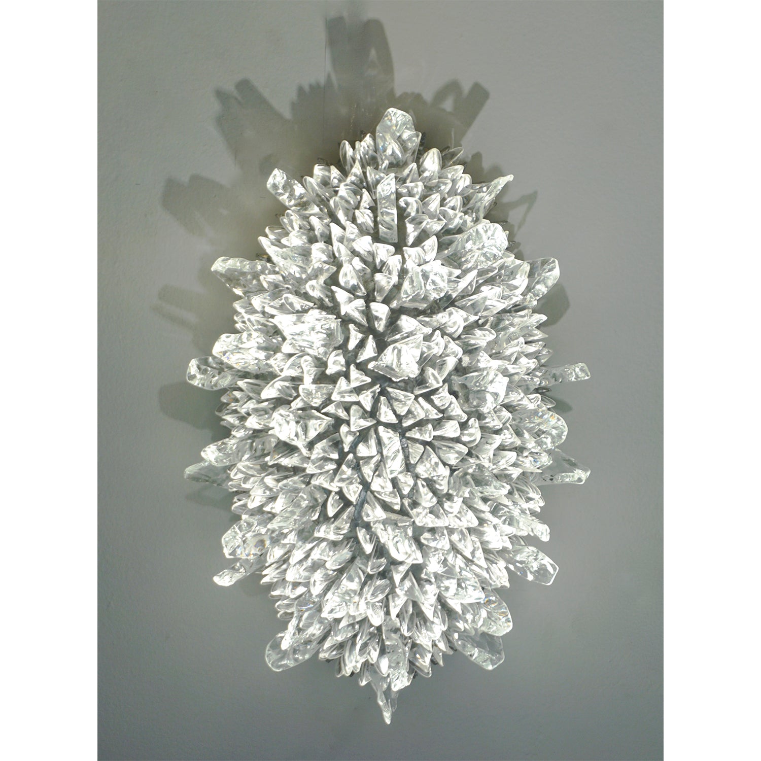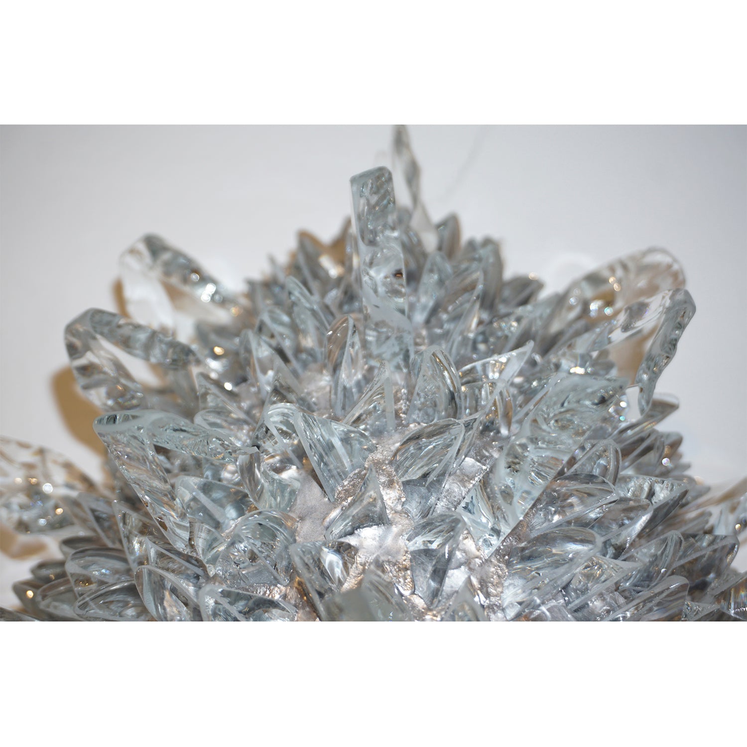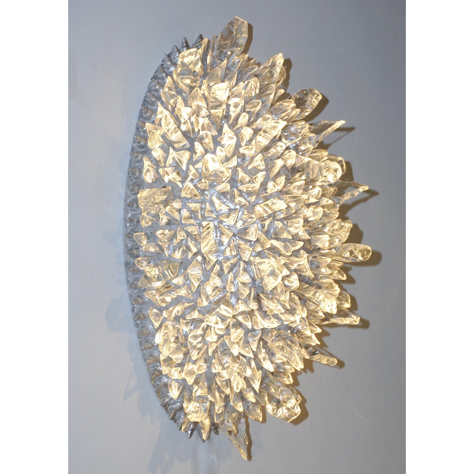 Italian oval wall light or flush mounts, true work of art sculpture, entirely handcrafted like a jewel, the sophisticated organic decoration is composed of hand cut and hand polished rock glass slivers of different sizes set in relief in a hand-cast iron frame painted in silver. The multi facets reflect so much light that, when lit, the lighting fixture changes colors in sparkling white. The colors can be combined and the glass slivers can be interspersed with diamond shape elements. Weight: 22lbs.