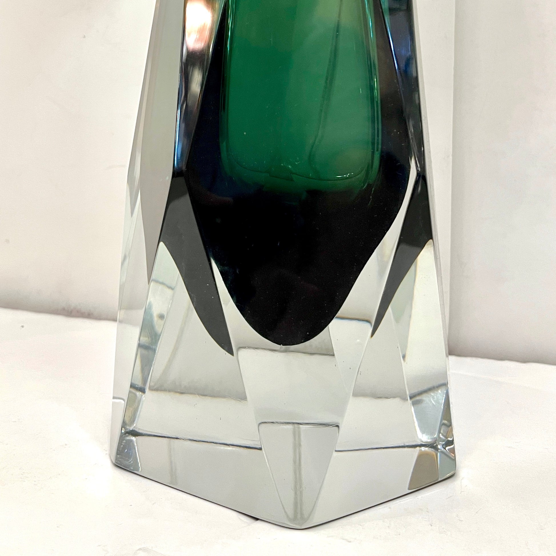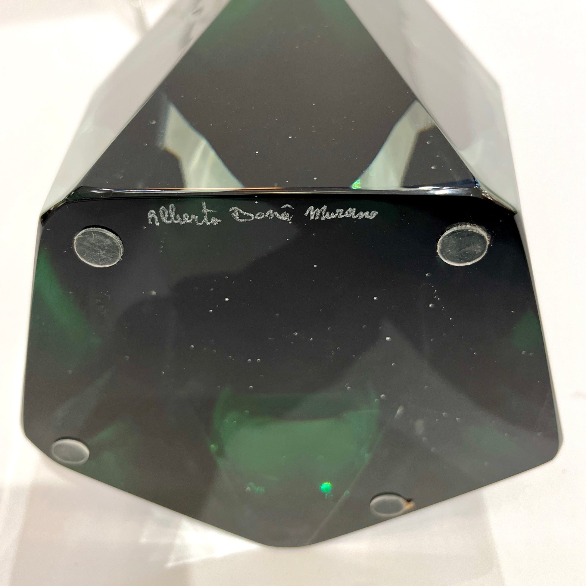1054PBContemporary Italian Pair of Murano Glass Lamps, work of Art signed by Alberto Donà, entirely blown and handcrafted, the glass body is diamond cut and worked in Sommerso with a deep green color enveloped and overlaid in crystal clear Murano glass. The non symmetrical multi facets create elegance, uniqueness and emphasizes the reflections on the colored core, as well as the prism effect through the refraction of light.