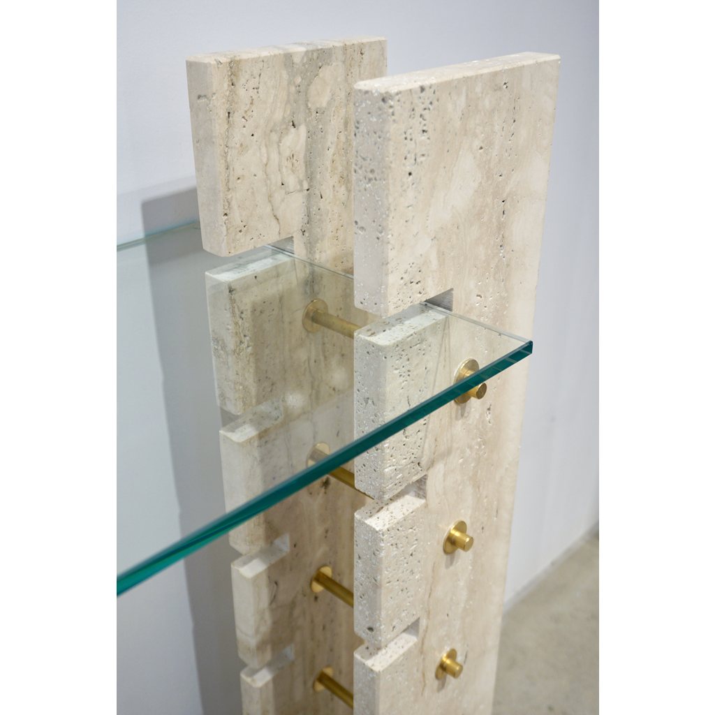 The console of urban architectural design, entirely handcrafted, of minimalist post modern design with two upright structural supports in cream white travertine stone connected by brass accents, with indentations to provide a logical and functional assembly for the position of shelves at different heights, high quality of artisanship with beveled blunt edges. This piece combines essential design, organ city of material, and functionality qualities.