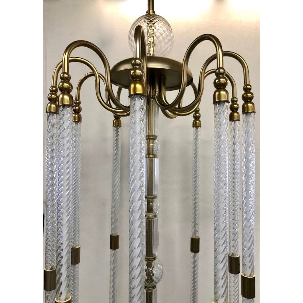 A modern creation by Cosulich Interiors & Antiques with an Art Deco flair, entirely hand made in Italy. This exclusive item is customizable in sizes and finishes. The light and open organic design represents a stylized lantern, the handcrafted metal structure in an antique brass finish has 10 arms, elegantly curved at top and bottom, supporting twisted crystal Murano glass uprights containing the LED light source and decorated with a central stem of various crystal clear Murano glass elements.