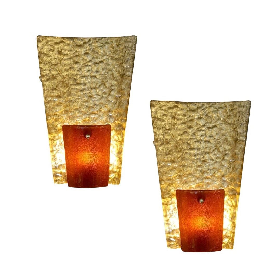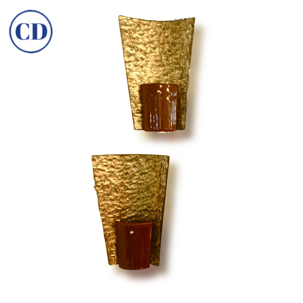 Modernist geometric pair of gold and amber/orange Murano glass wall lights, entirely handcrafted in Italy. A very interesting part is the thin backplate (1.5" wide), handmade in brass with a protruding small arm that supports a concave trapezoid element in textured Murano glass decorated with pure gold leaf that enhances the crumpled pattern on the glass, with a convex front element in earth tone caramel textured Murano glass hiding the light source that highlights the finish.