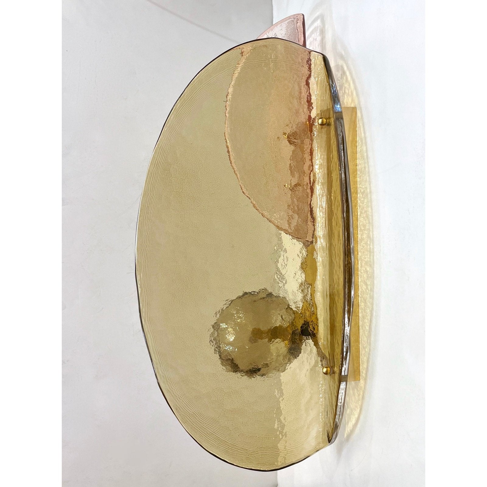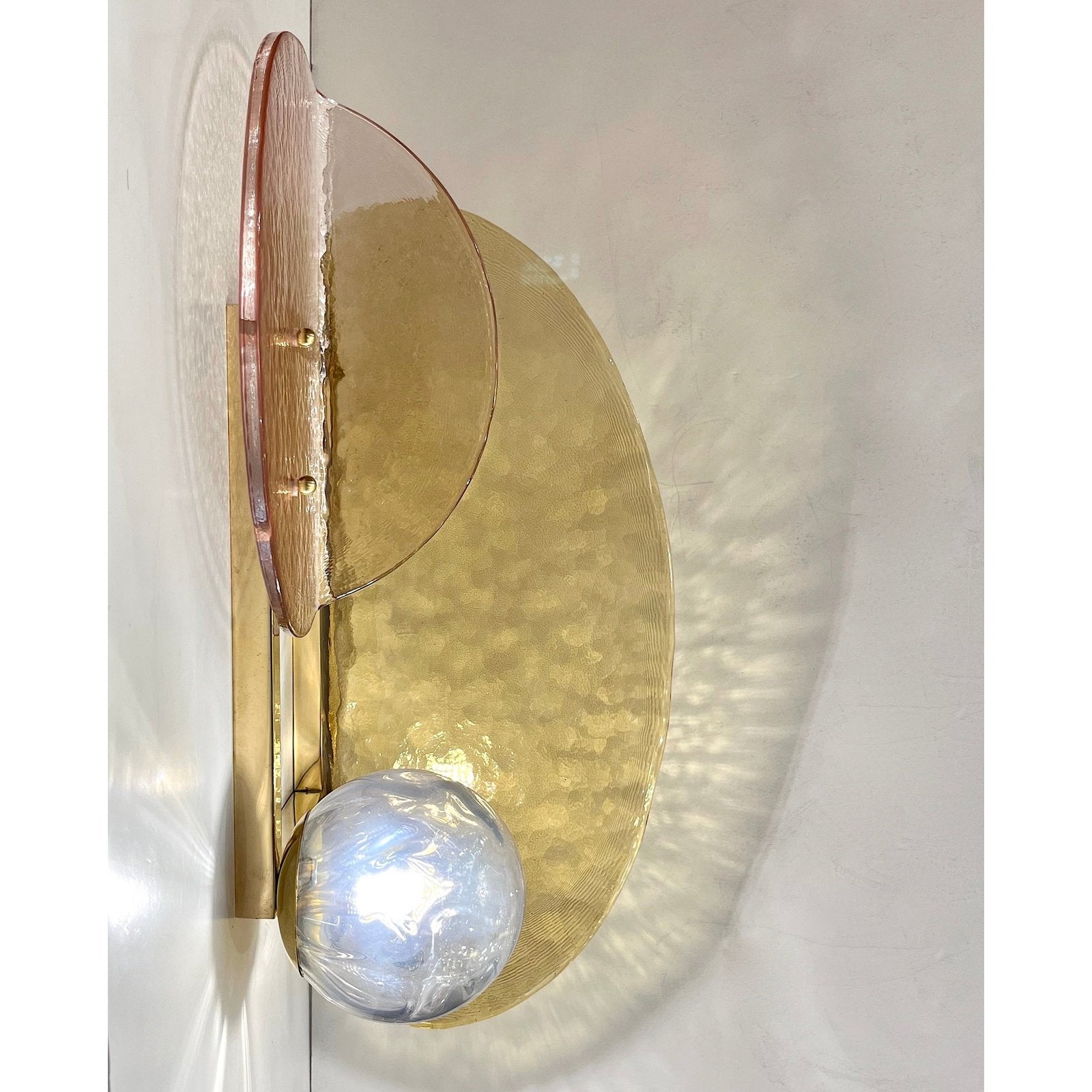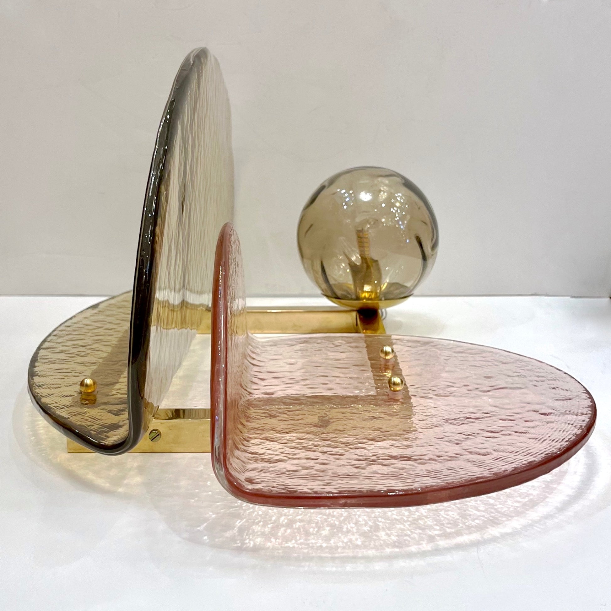 A contemporary creation with a unique modern geometric design, these wall lights are entirely handcrafted in Italy. The molded textured glass elements of organic curved shape, in amber gold and light pink, daisy rose Murano glass, are mounted in a geometric asymmetrical composition on a handmade rectangular gold brass structure to accentuate the atomic space age design. The light source is enclosed in a blown textured Murano glass globe of smoked amber color. Fitted with 1 G9 socket.