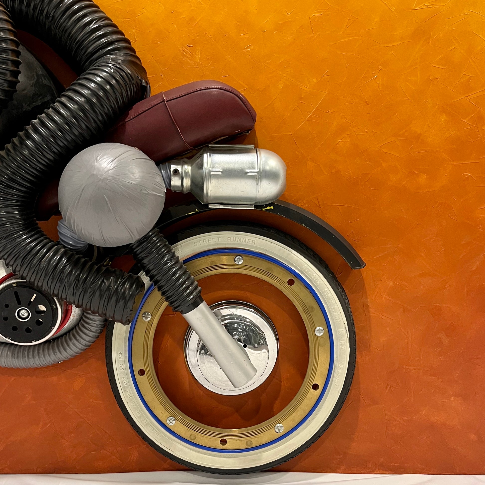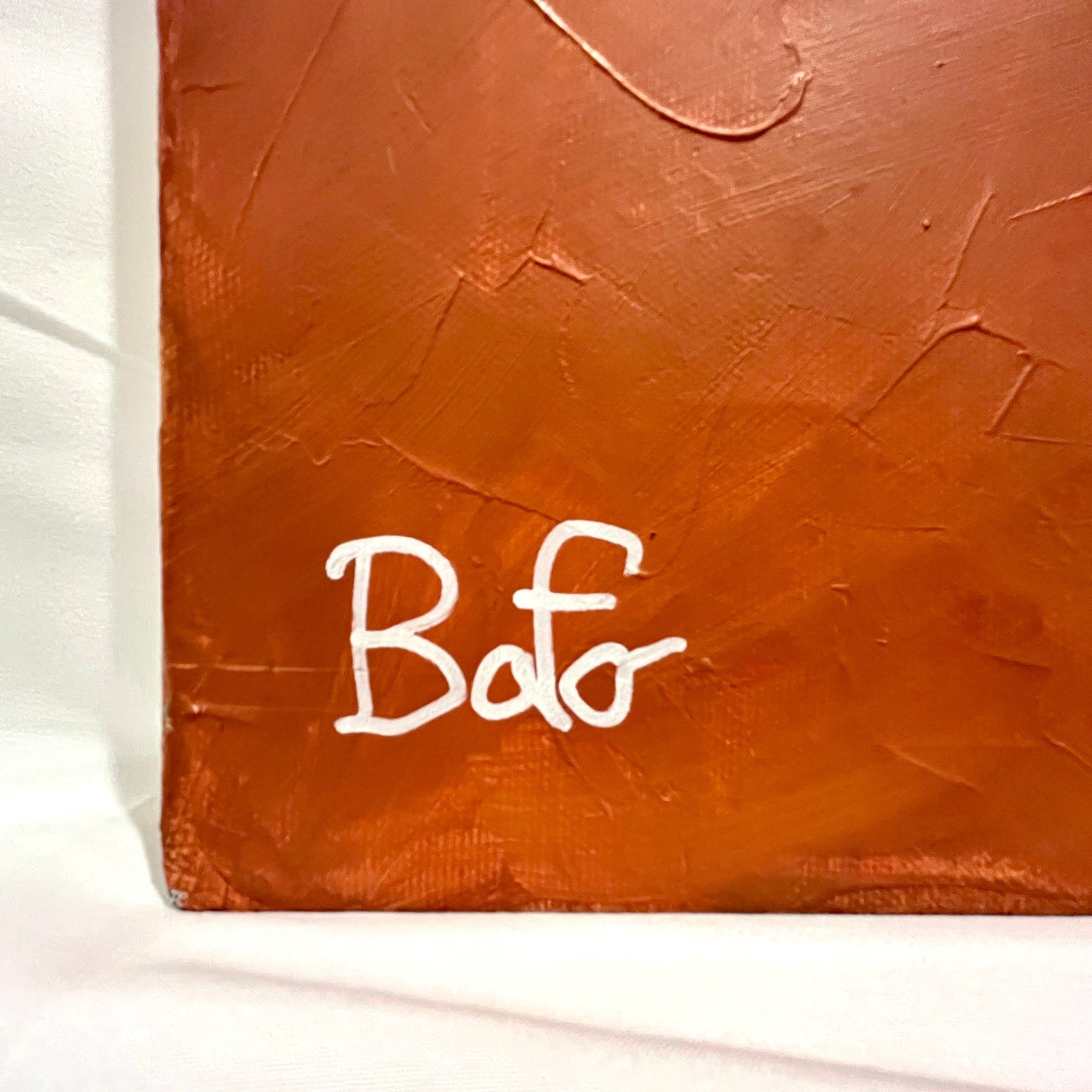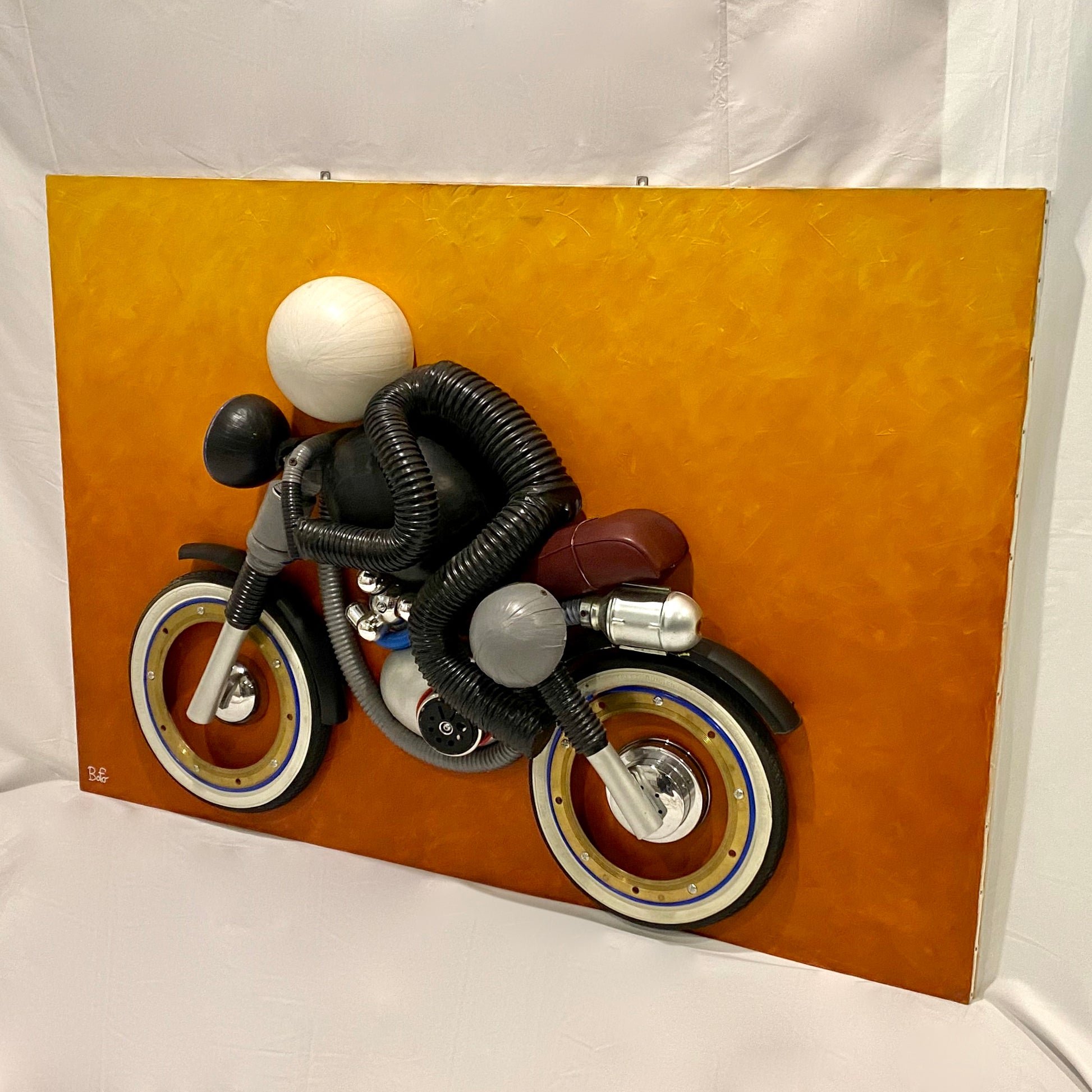 This work is characterized by creativity, a fantastic assemblage Art, made with discarded found objects, on a canvas hand painted with modern strokes in orange ochre. All the different pieces bring together a composition to represent a stylized motorcyclist, showing great expressive power. A unique Work of Art signed by the Italian artist Il Bafo. He works also on commission, creating any kind of characters and landscapes. Contact us with your requirements.