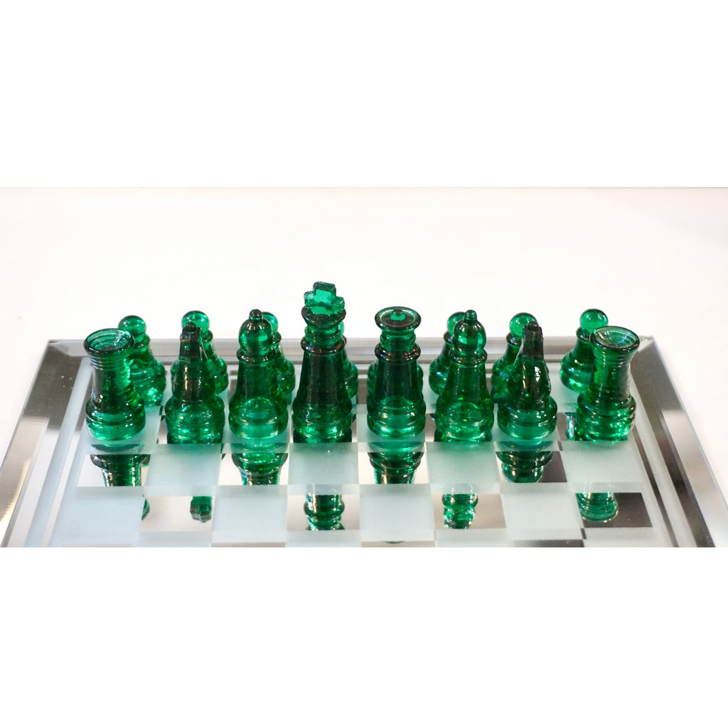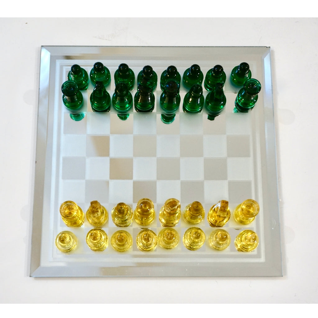 A fun Italian chess game of modern organic design, the detailed chess pieces are molded in vibrant green and yellow Murano Art glass, the mirror glass chessboard is decorated with frosted and mirrored squares, edged with a quality beveled border. Packed in a styrofoam box. Ideal as a gift.