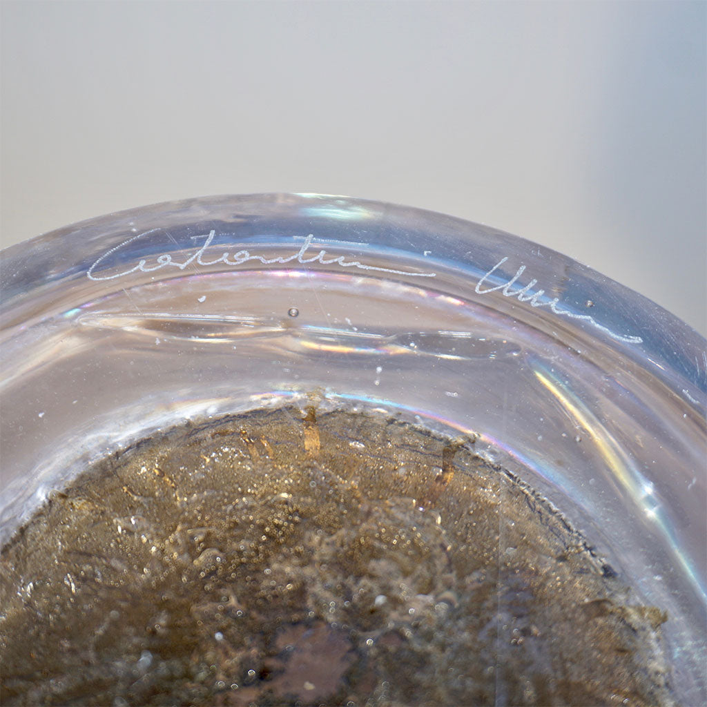High quality sculpture pair of very decorative precious vases worked with a very sophisticated technique: the bodies in crystal clear Murano glass are enhanced with pure silver leaf that is subsequently Graffiato, scratched and sanded in a way to create a unique artistic texture, then overlaid with 3d free-form petals. The curated organic design like a modern painting is enhanced by the use of Murano Alexandrite glass in relief that creates an ever changing color depending on the light source, from pink amethyst to greenish grey tints. Signed pieces by Costantini. Diameter of base 6.2 in.