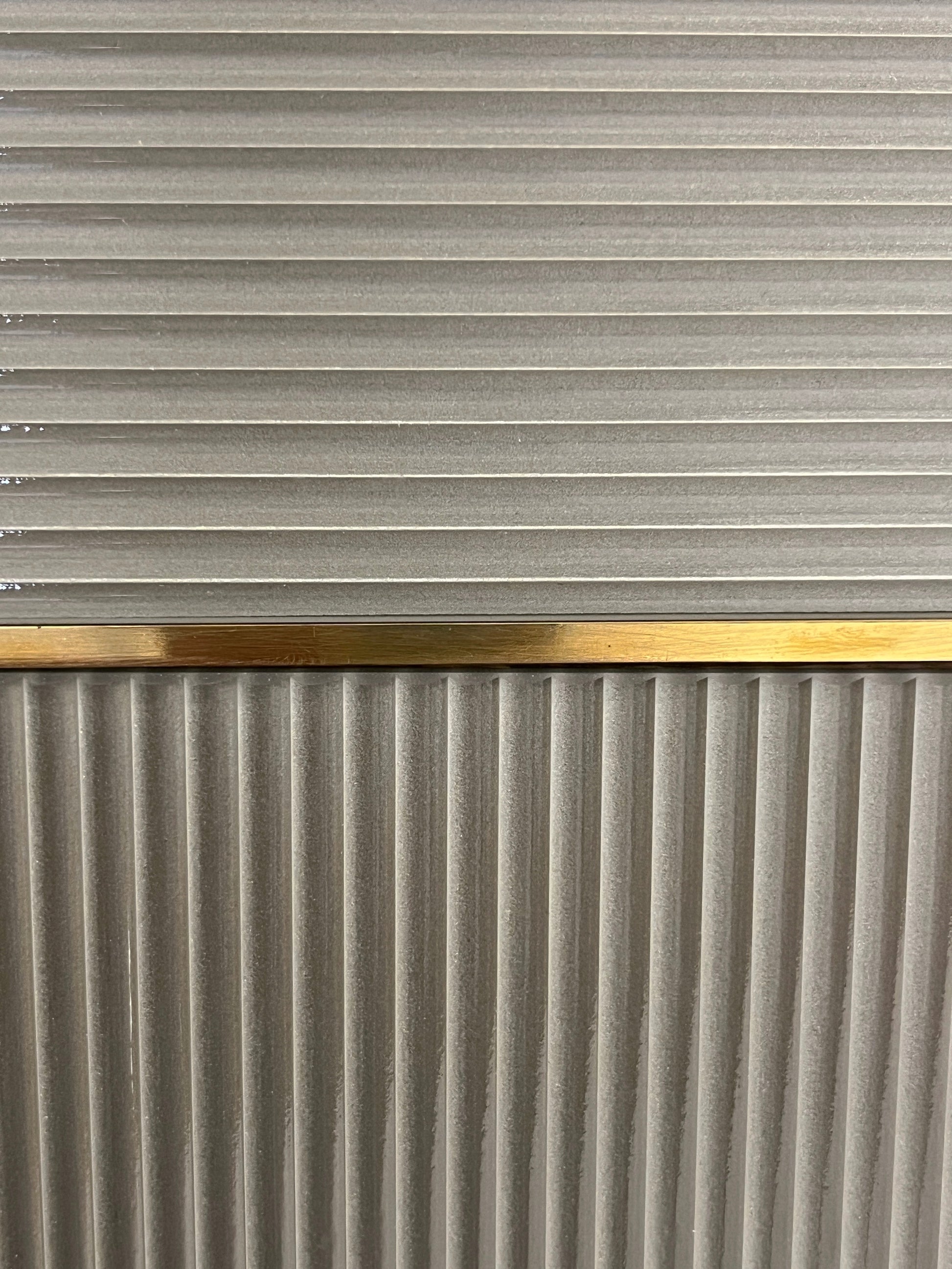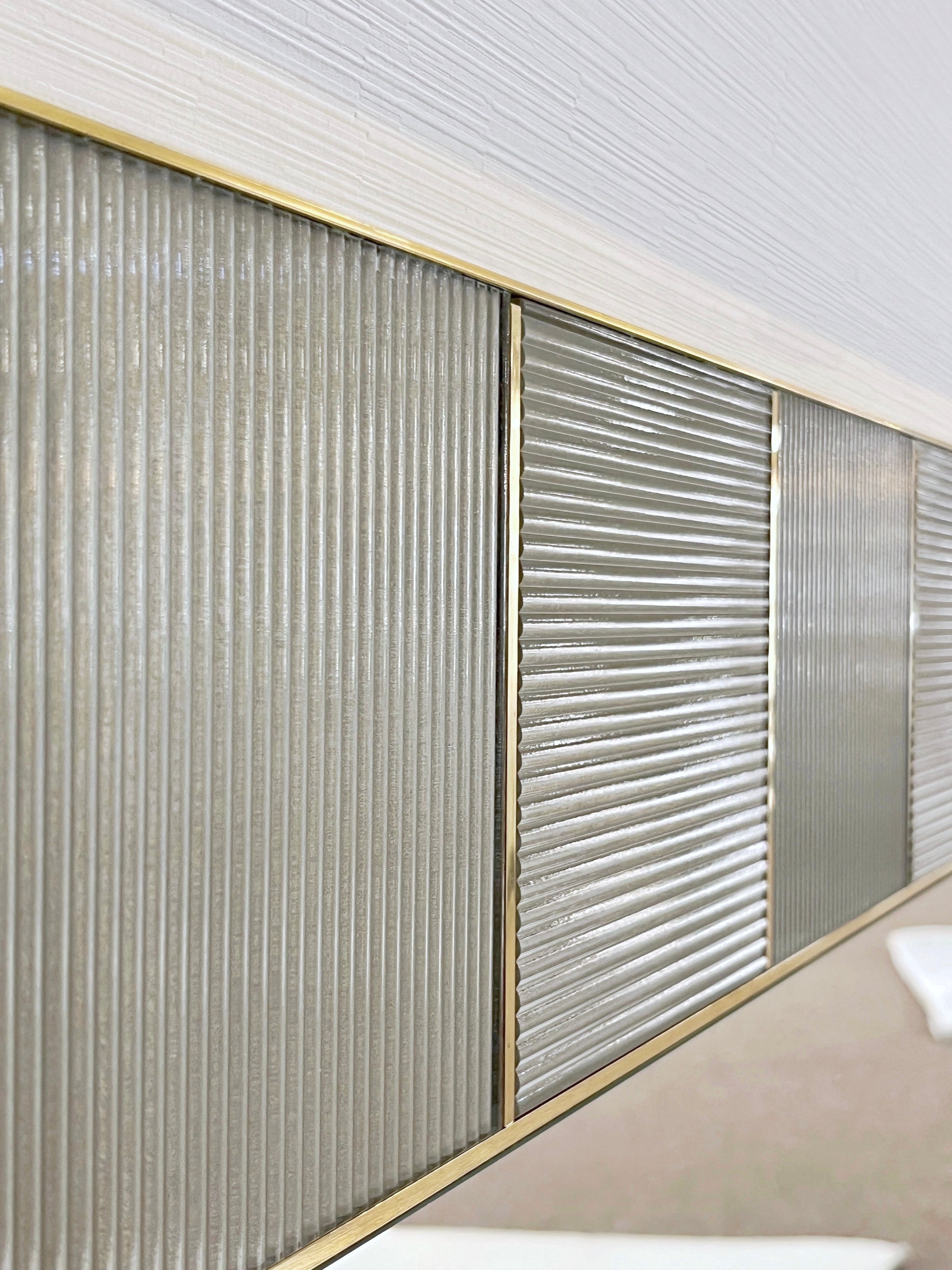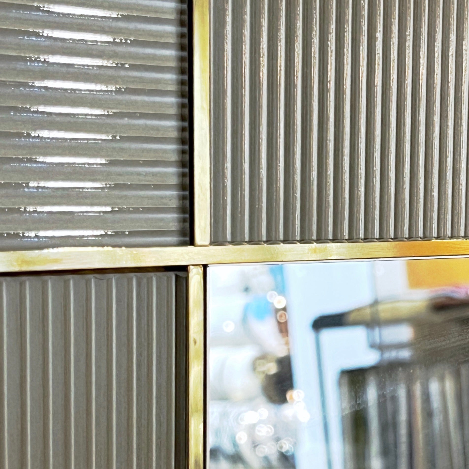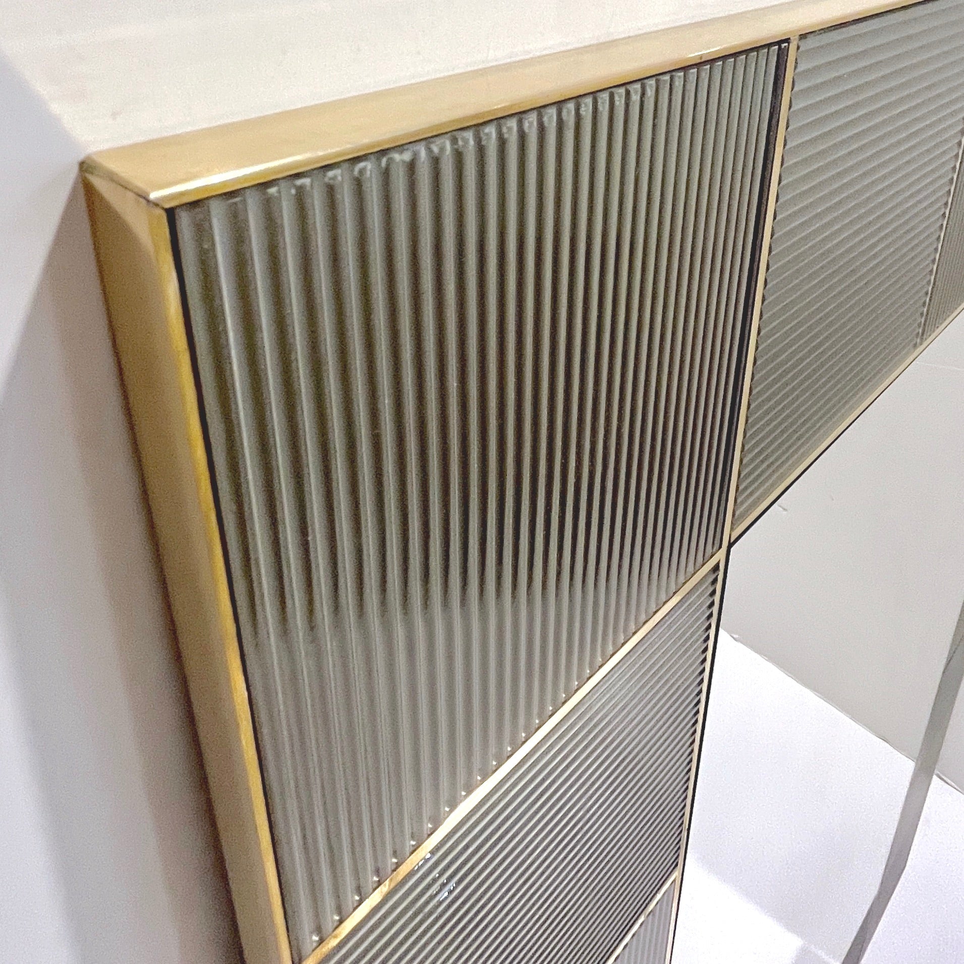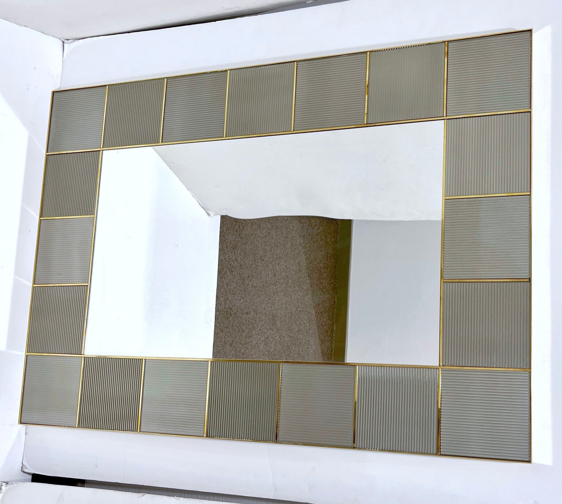 This contemporary Italian Couture Design stone gray and brass mirror has a high-quality construction with a frame that is inset in an embracing brass border all the way around as well as an inside border of the mirrored plate. It is composed of glass square tiles, that can be in the tint of your choice, outlined in brass, and decorated with a textured reeded concave motif, displayed horizontally and vertically in alternation that creates a magical interplay of light and shadow radiating in an ever-changing pattern.