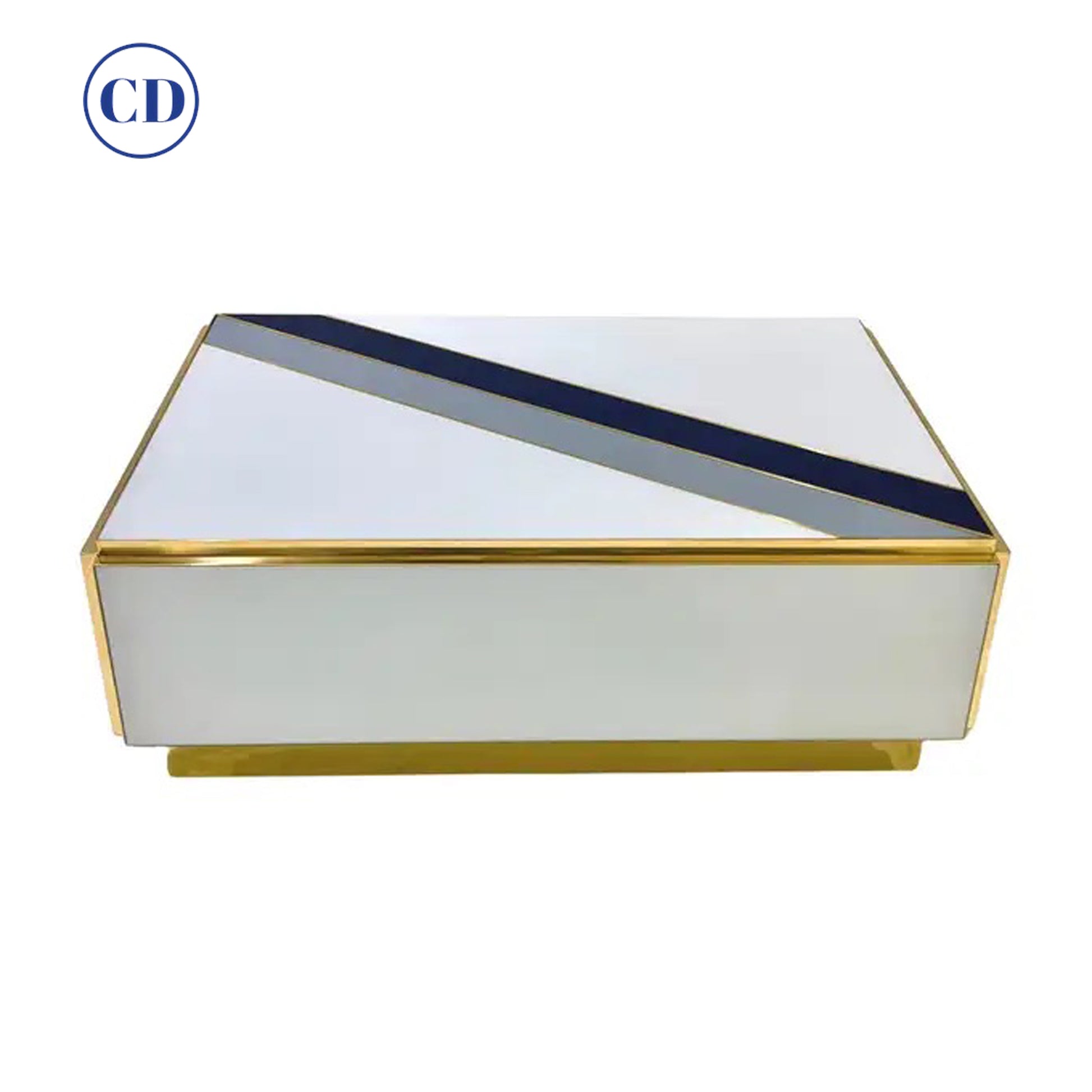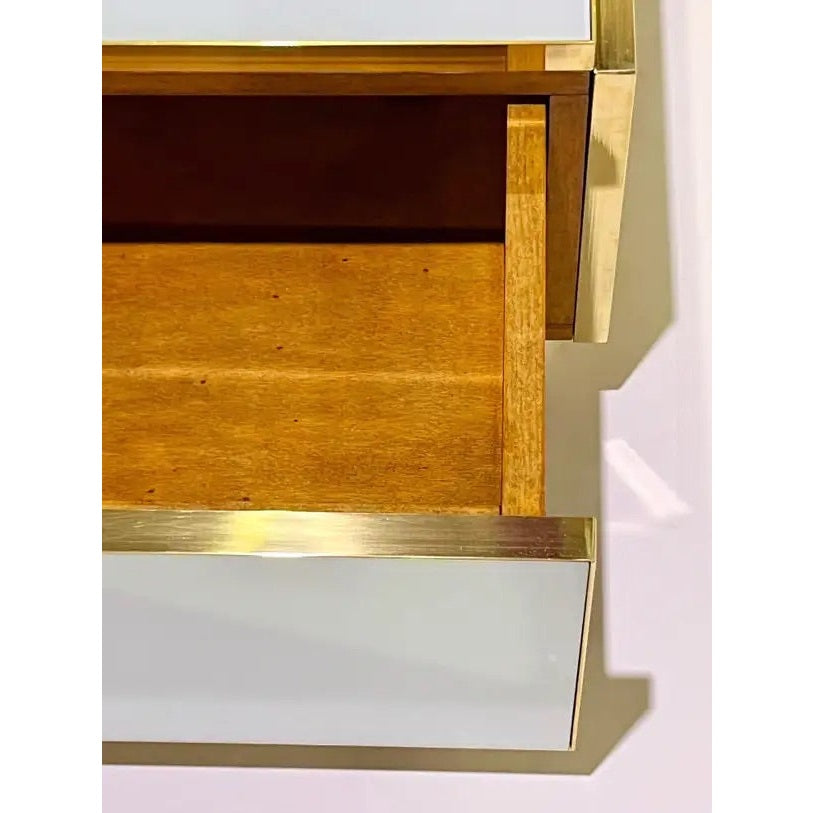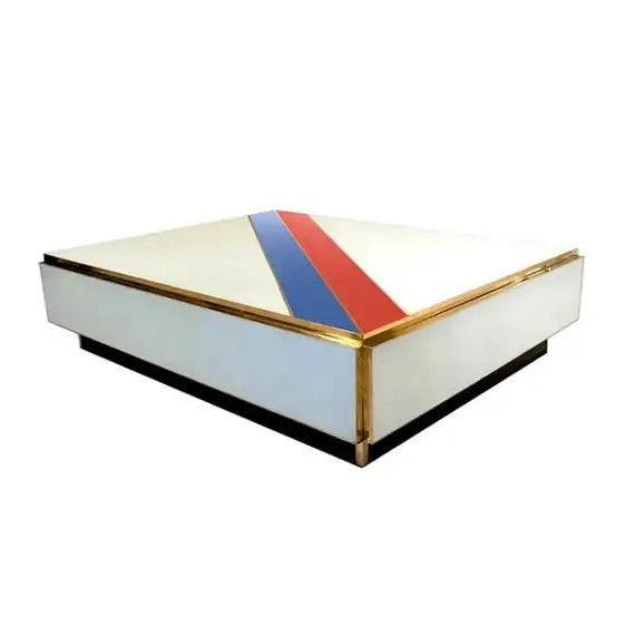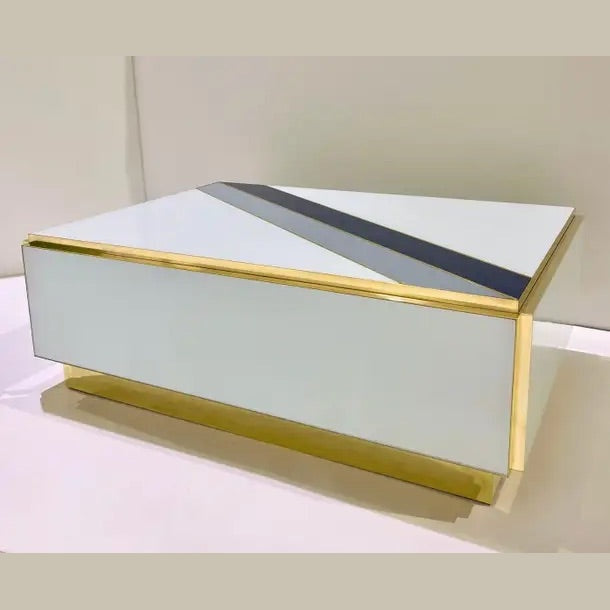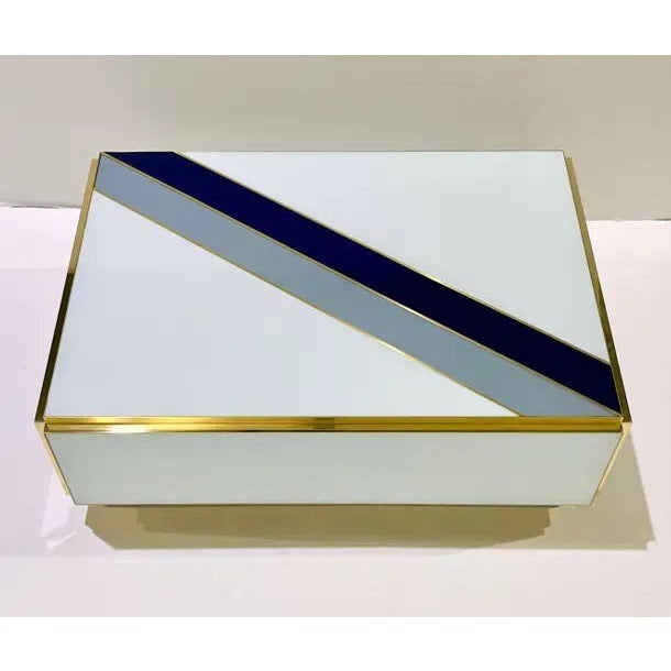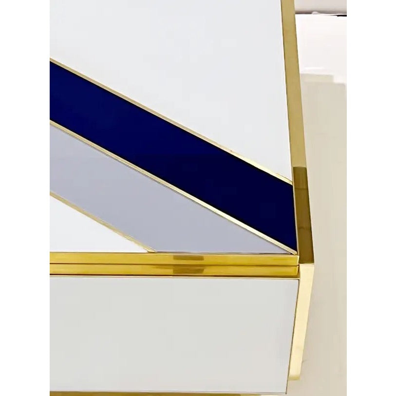 Entirely handcrafted in Italy, the body of this table, is clad in white glass with 2 diagonal stripes in gray and blue. Attention to details, with the table raised on a recessed plinth, as well as each corner profile clad in brass.